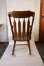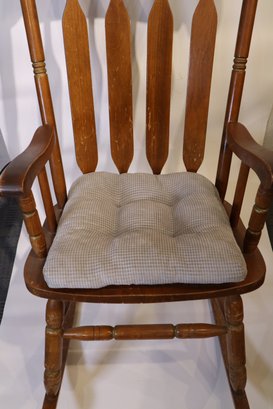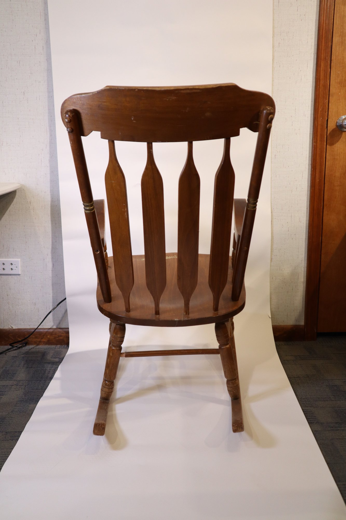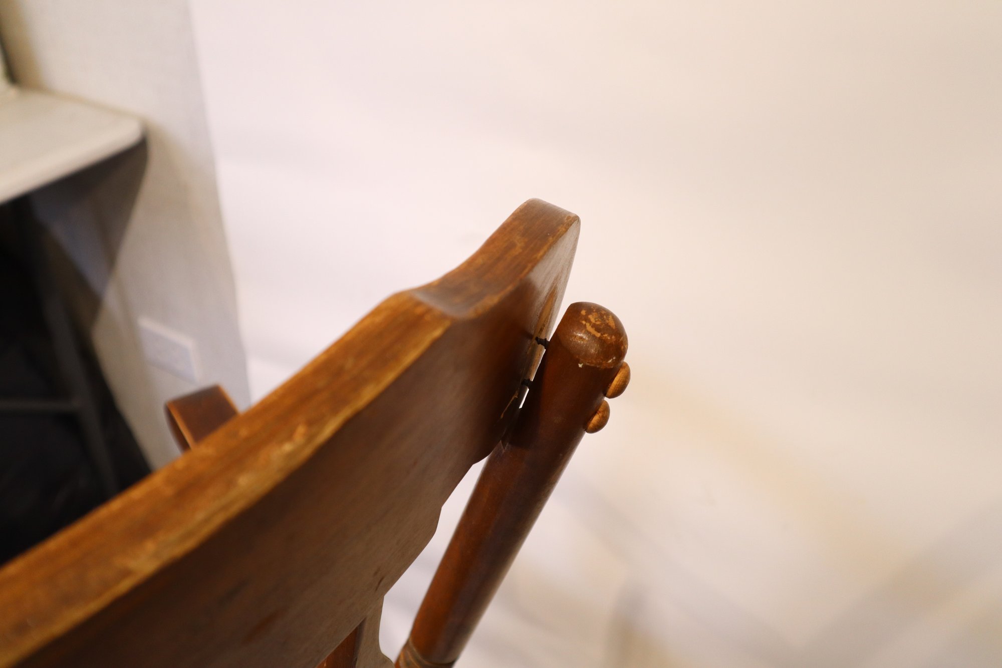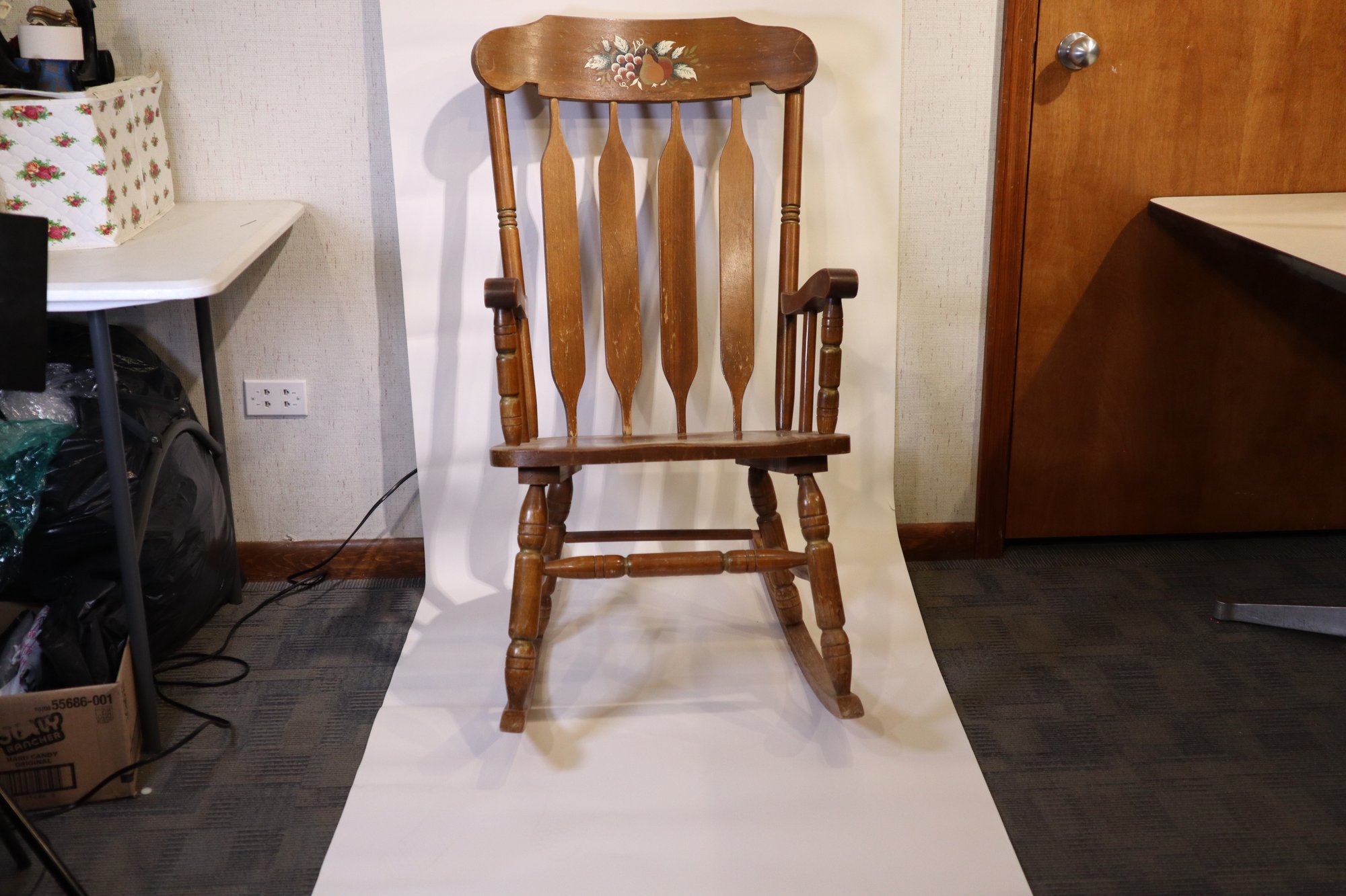 A wooden mid century rocking chair with painted decorations on the headrest. It has two cushions with it, that are likely not original. One of the rockers is slightly loose, but in good condition. The headrest has detached from the upright on the right hand side, the screws are still in place but the holes are stripped. Not eligible for shipping.