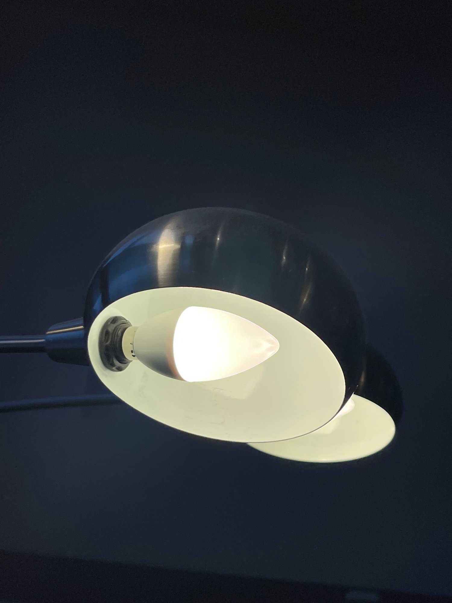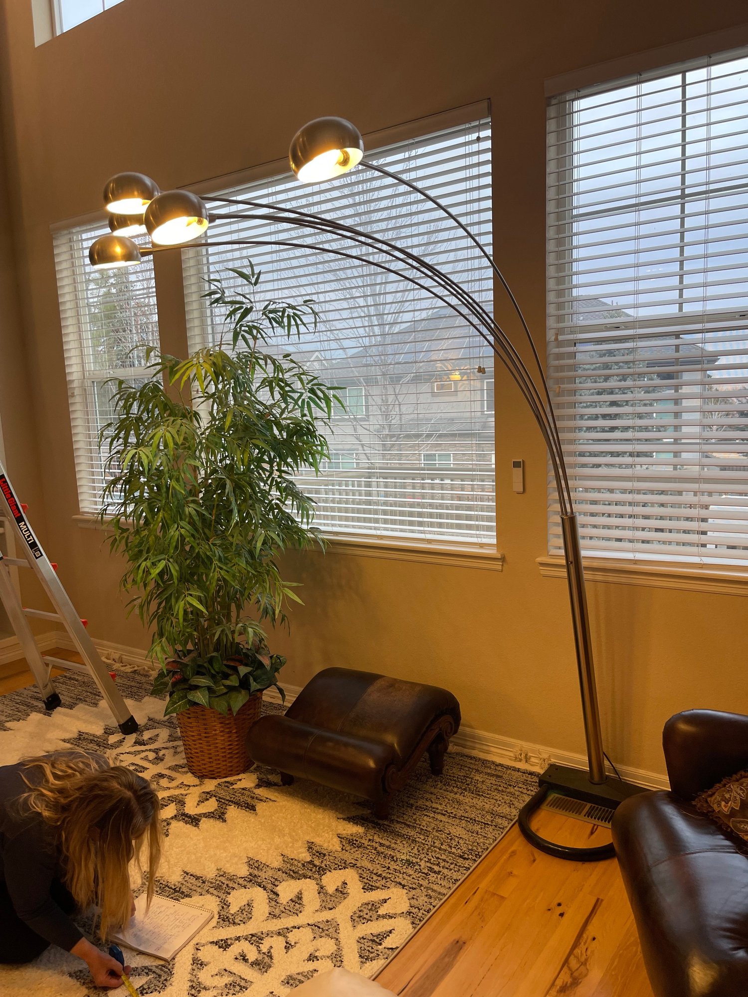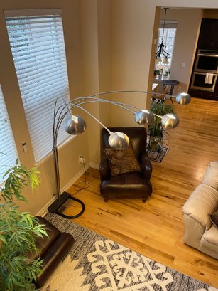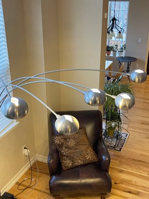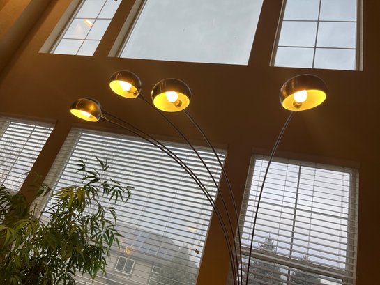 7 feet high, approximately 5 feet wide ( adjustable) , 5 lamps Base is 20 inches wide, 17.5 deep Not eligible for shipping