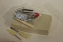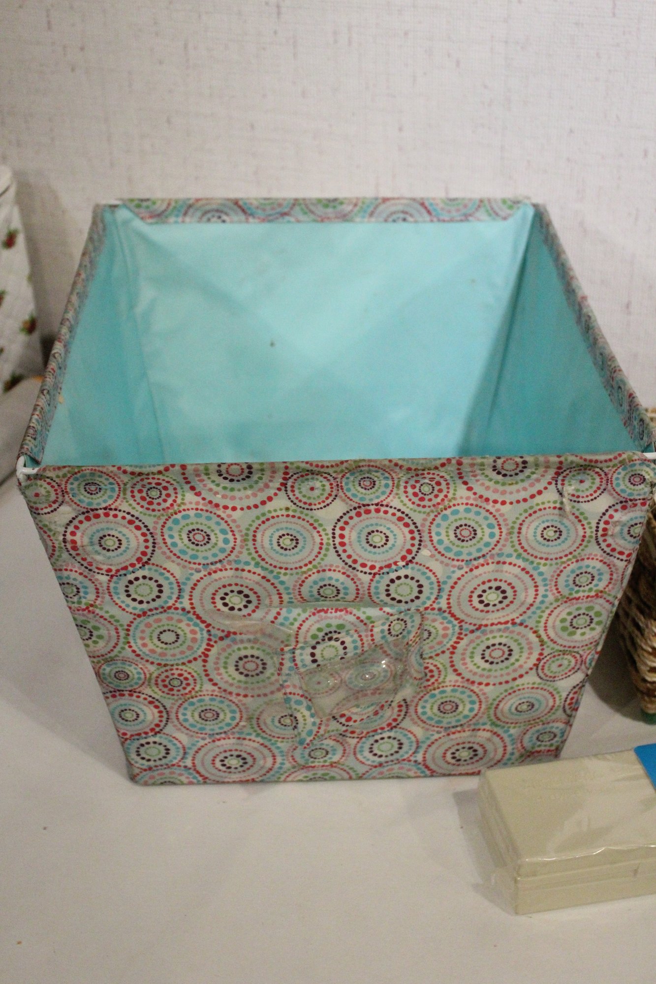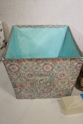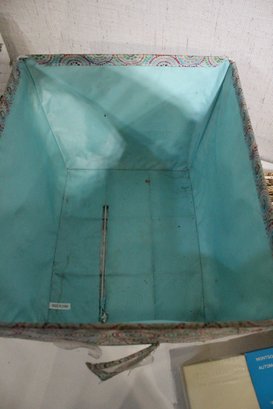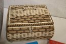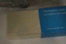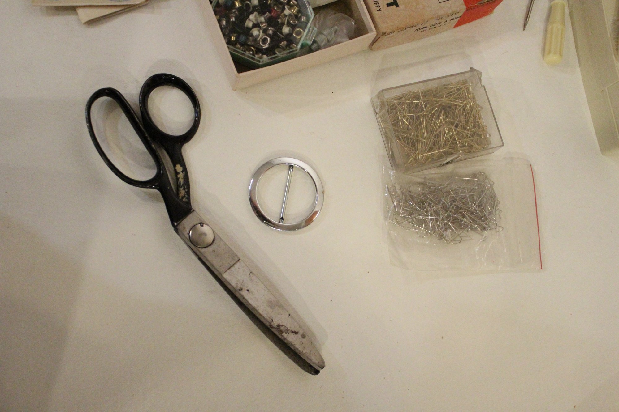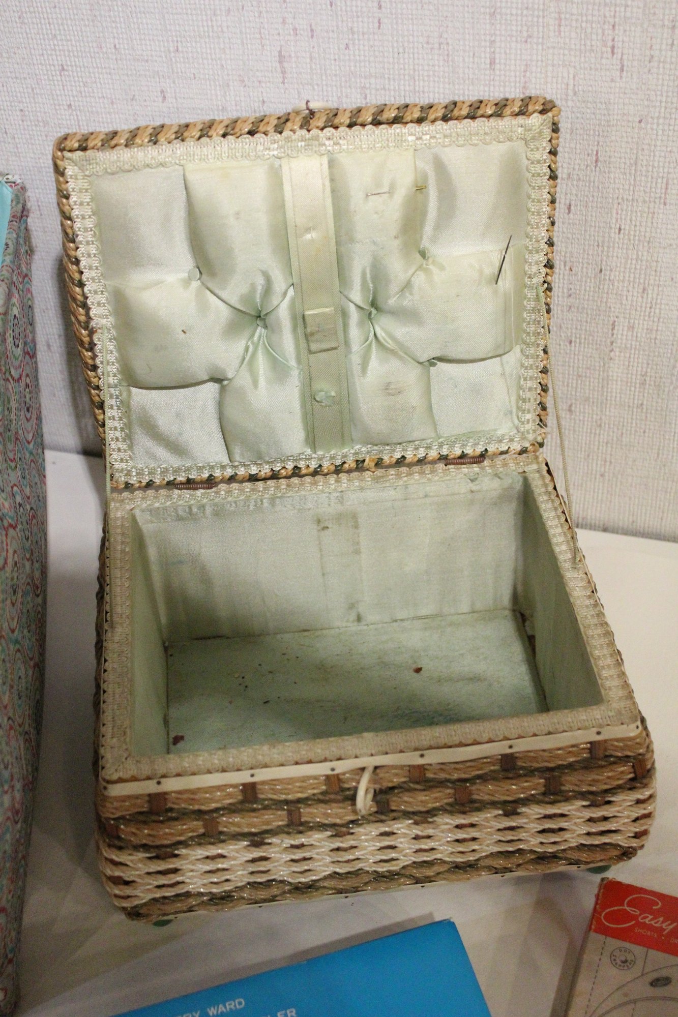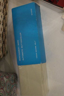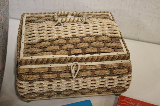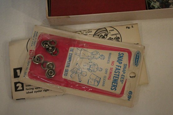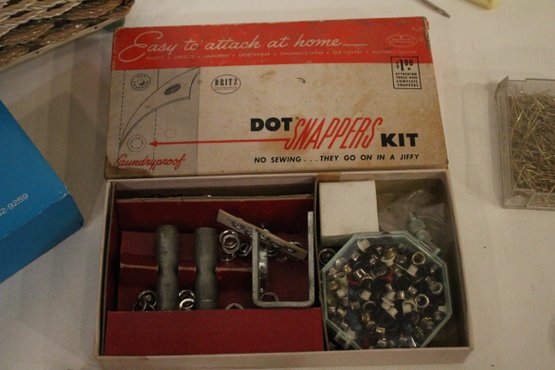 An opened box of Montgomery ward sewing machine supplies, as well as a sealed one. A vintage Dot Snappers kit, pins, and shears. A large fabric storage bin at 17" x 14" x 10" and an ornate woven a padded box at 10" x 7" x 5". These items can be shipped.