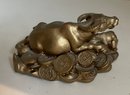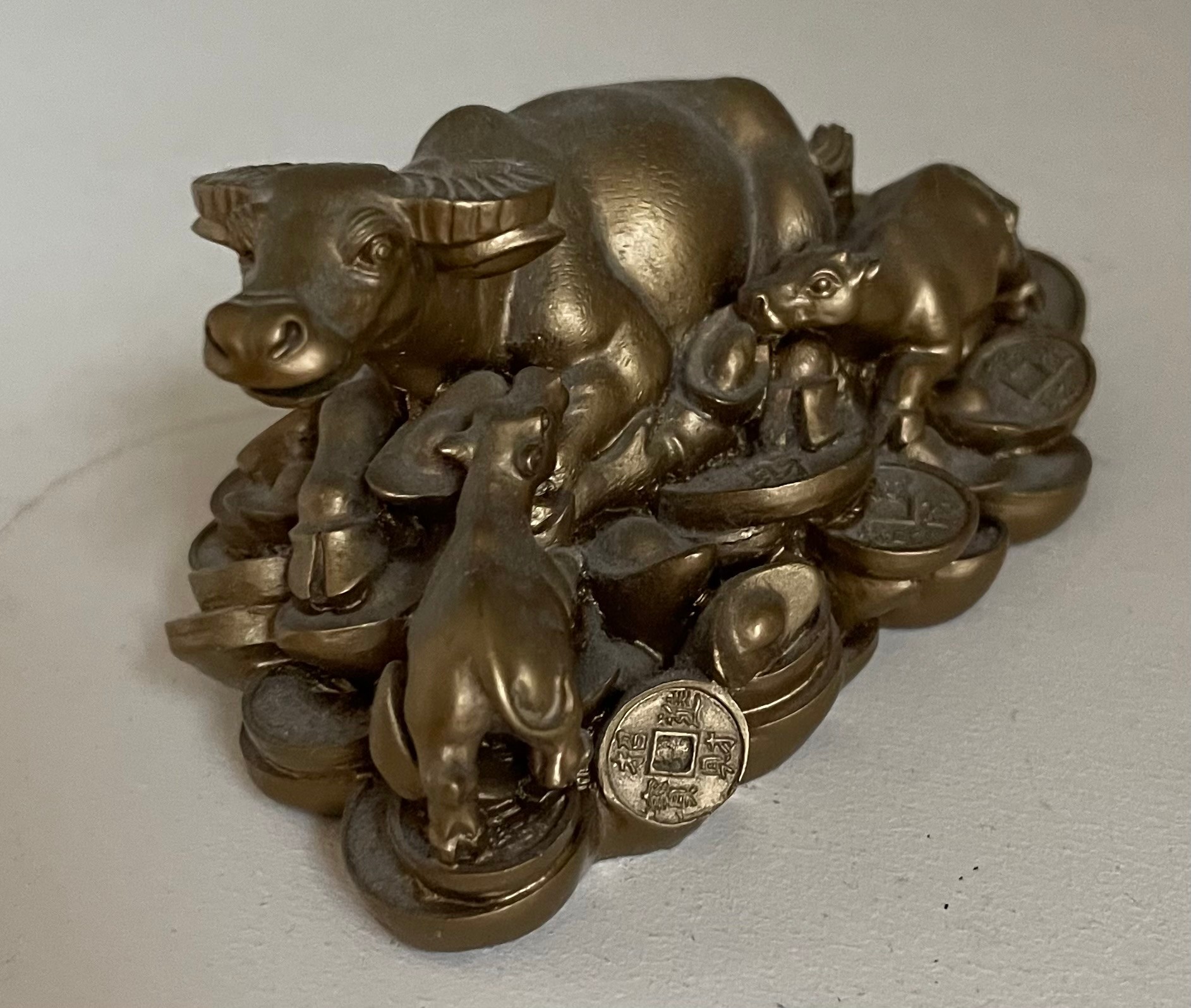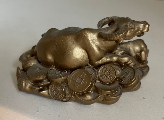 Featuring of one big golden mother Ox surrounding by several small kid ox, this golden feng shui Ox statue represents harmony and good luck. Sitting on beds of coins symbolizes to bring wealth and money luck in. It is perfect for year of the Ox or someone who needs a ox statue.