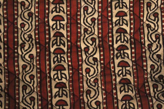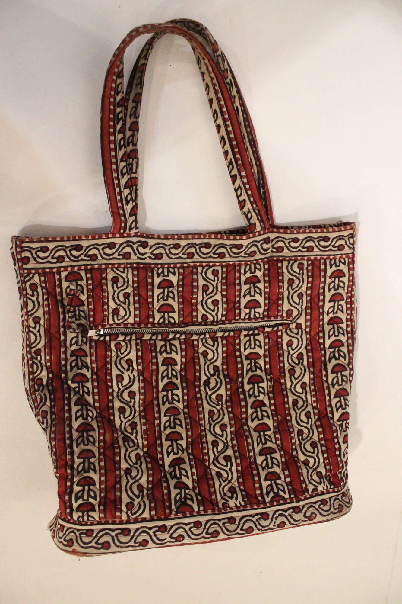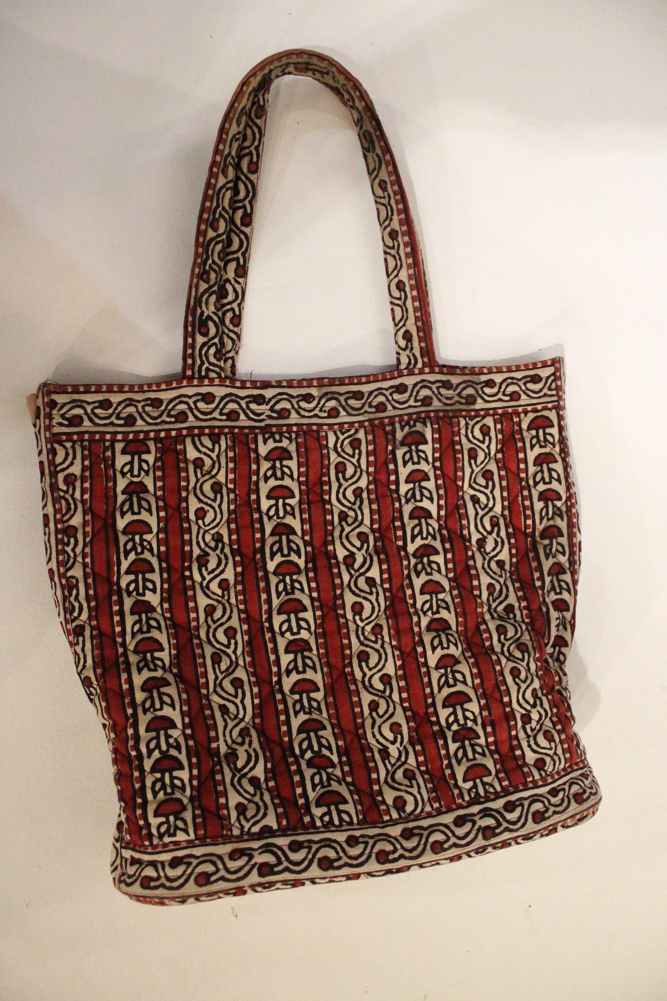quilted cotton tote bag featuring an Indian hand block-printed pattern of mushrooms 12" x 11" x 4". This item can be shipped.