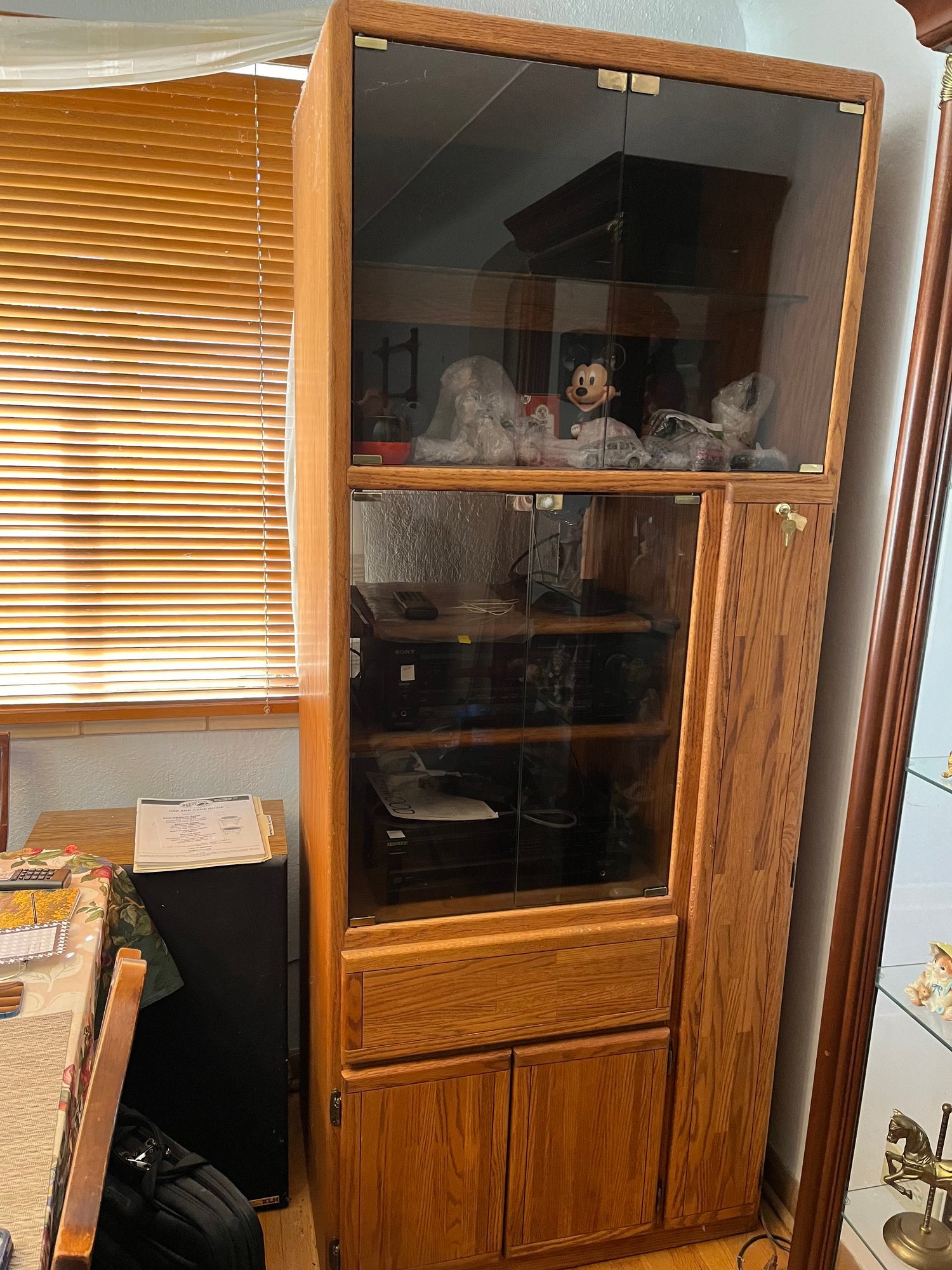 Large audio unit with glass doors, shelving, and one side door and two bottom drawers accommodating all audio needs . Can be used as curio cabinet, as well.