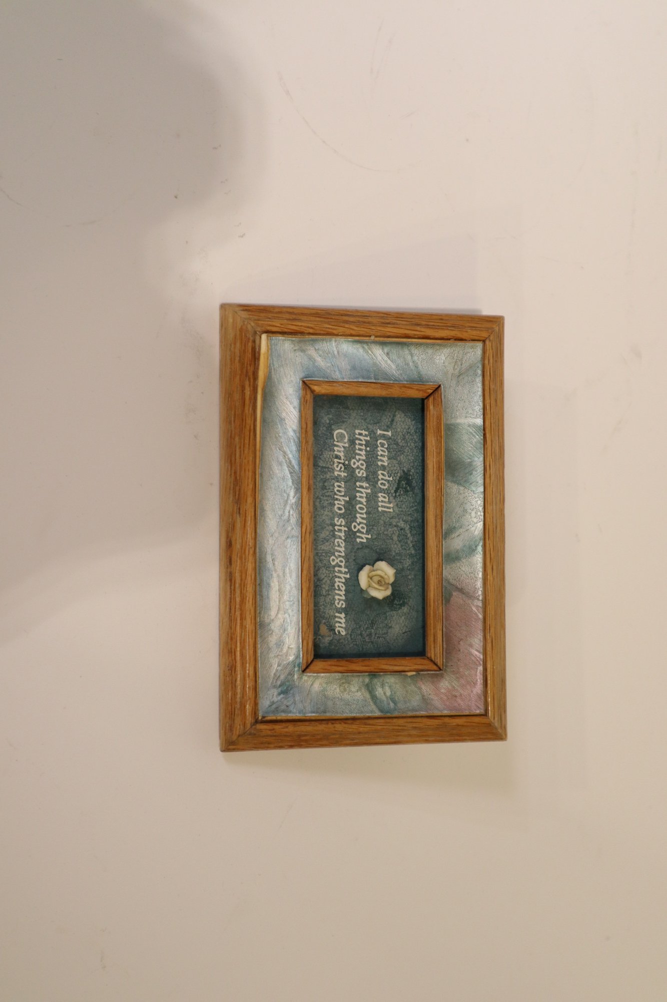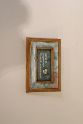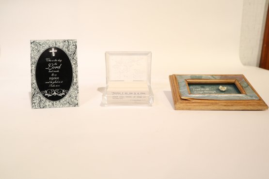 A God's Gifts promise box containing 140 mini cards with scriptures and prayers. Also included in this lot are two frames with quotes about faith.