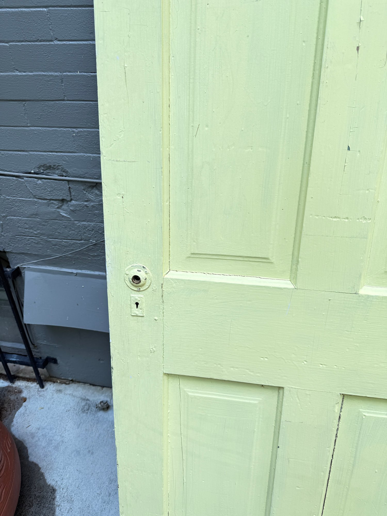 Solid wood door from 1926 bungalow home. Door is painted white on one side and yellow on the other. Includes hinges and door knob hardware/fitting but does not have the actual door knob. Approximately 32 inches wide by 76 and three-quarter inches tall in good shape, especially for age - needs fresh paint. Not eligible for shipping.