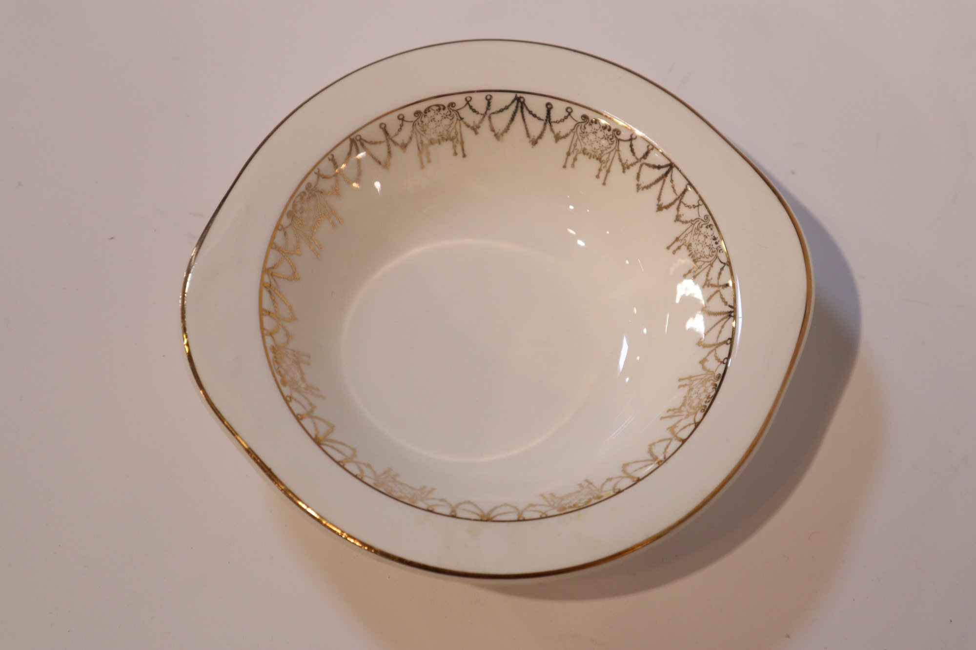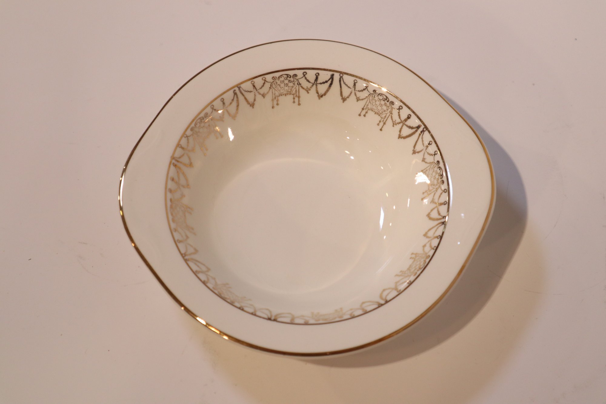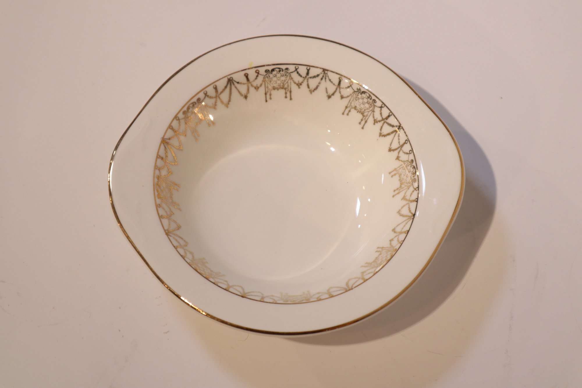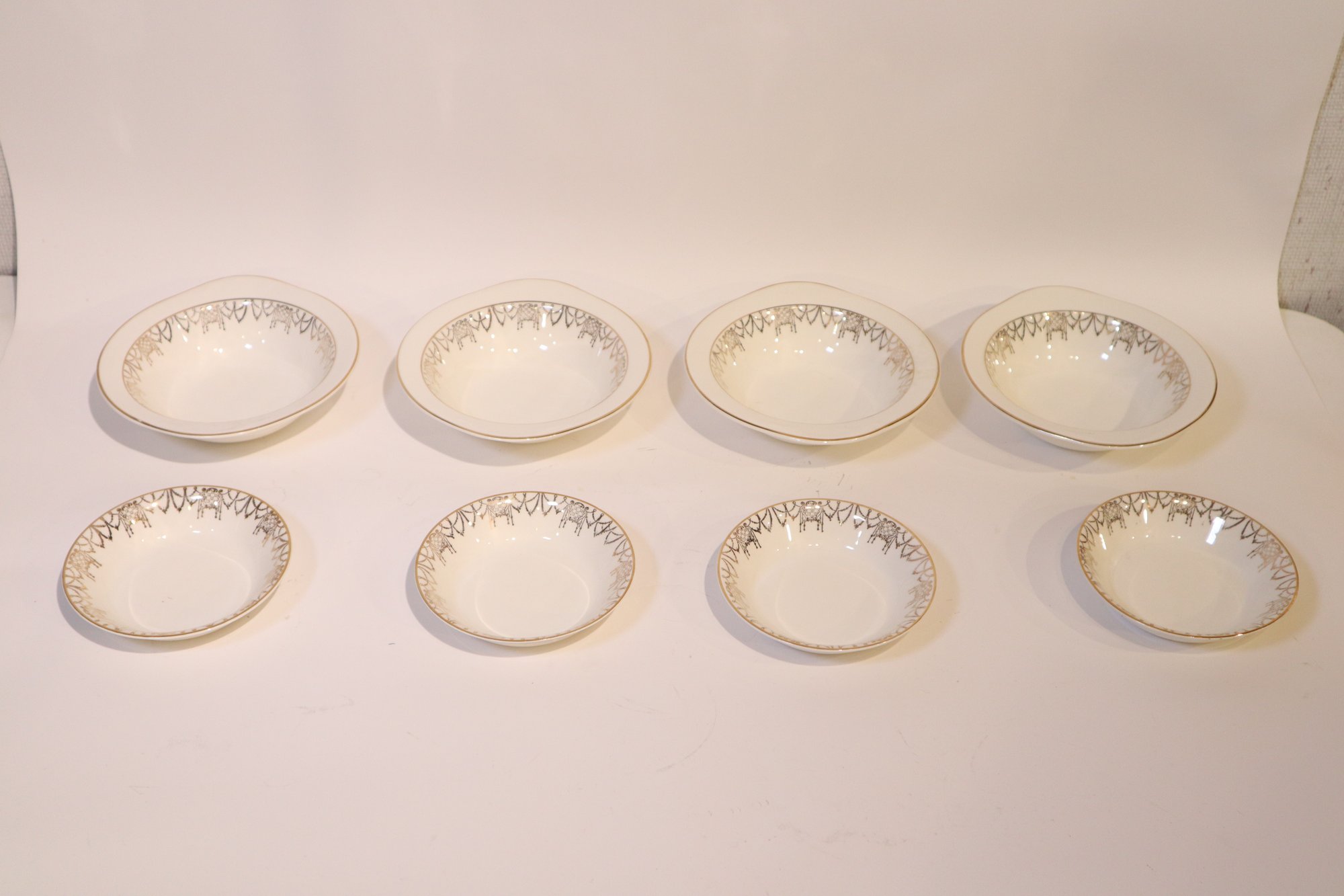 Eight bowls produced by Pope-Gosser China. Four soup or salad bowls, and four small fruit or dessert bowls. These were likely produced between 1921 and the early 1930's based on the design of the maker's mark. Items are in excellent condition with only a few minor blemishes on the gold filigree and minor crazing on one of the larger bowls.