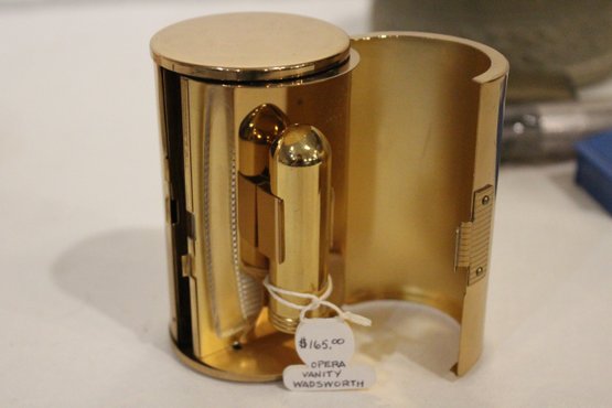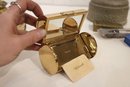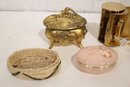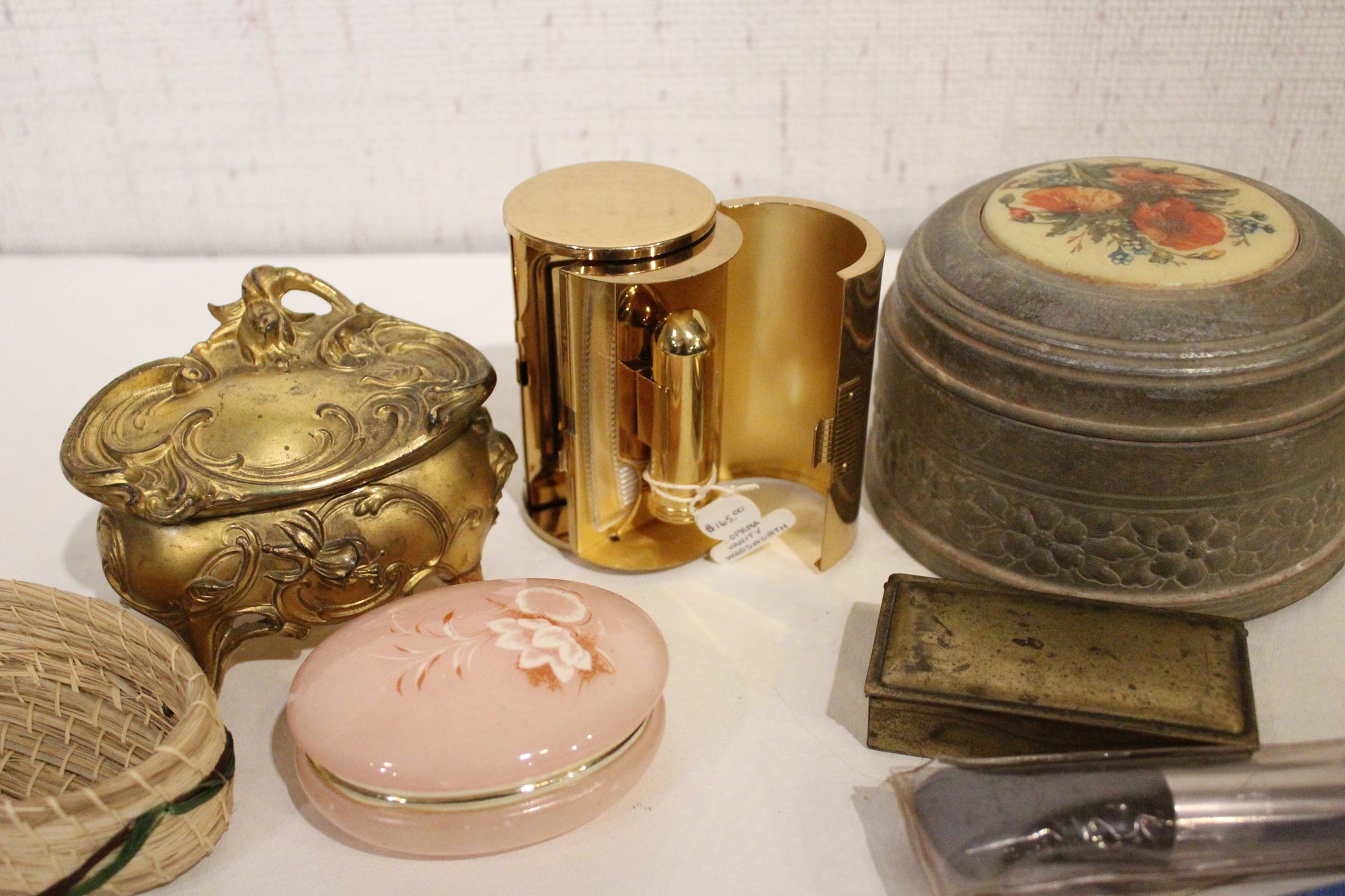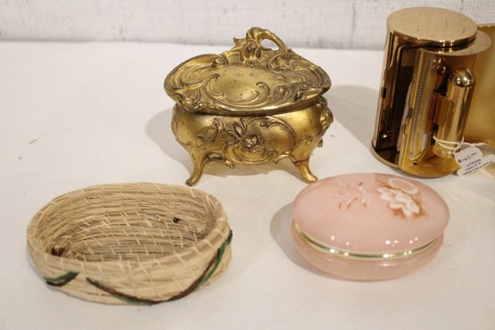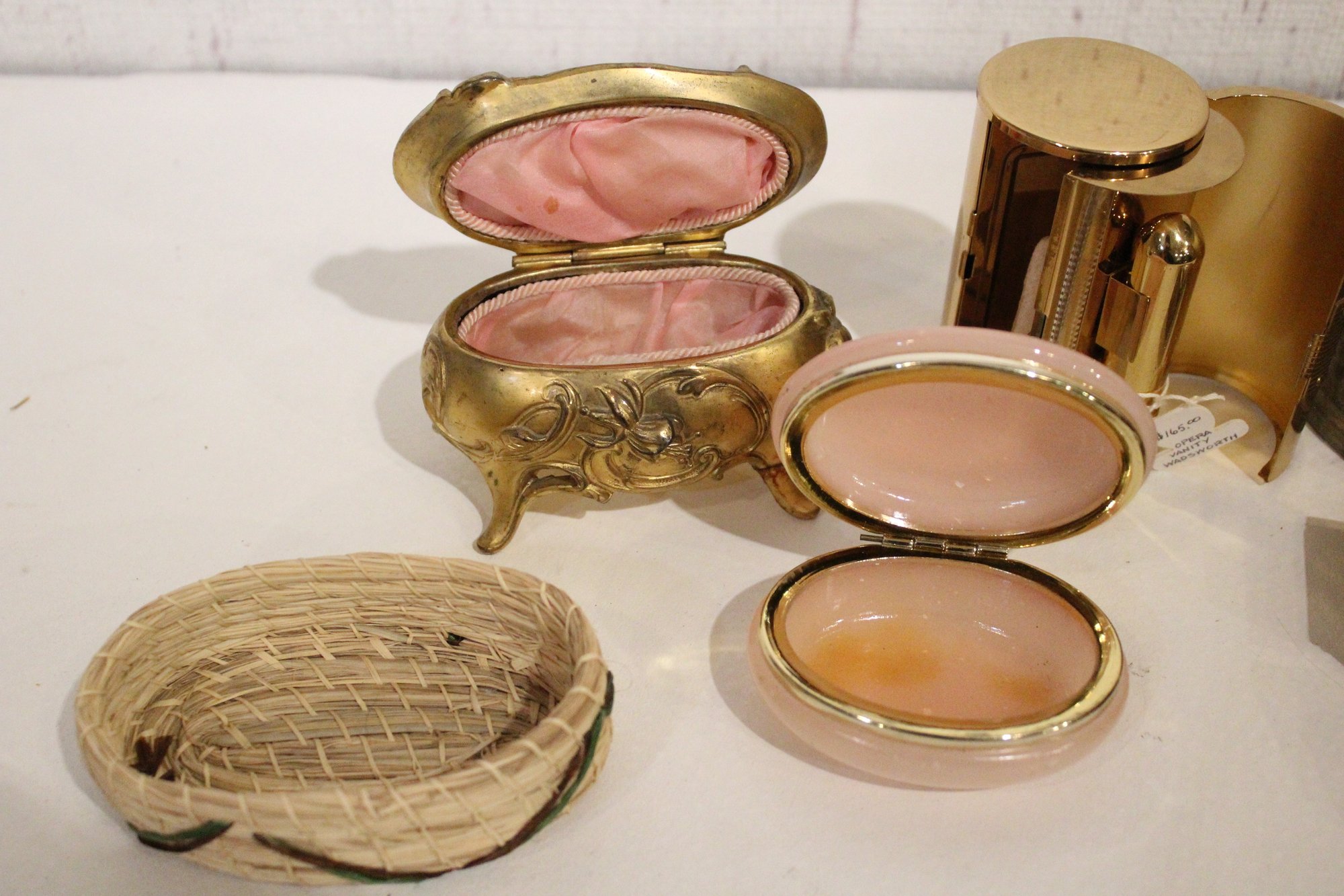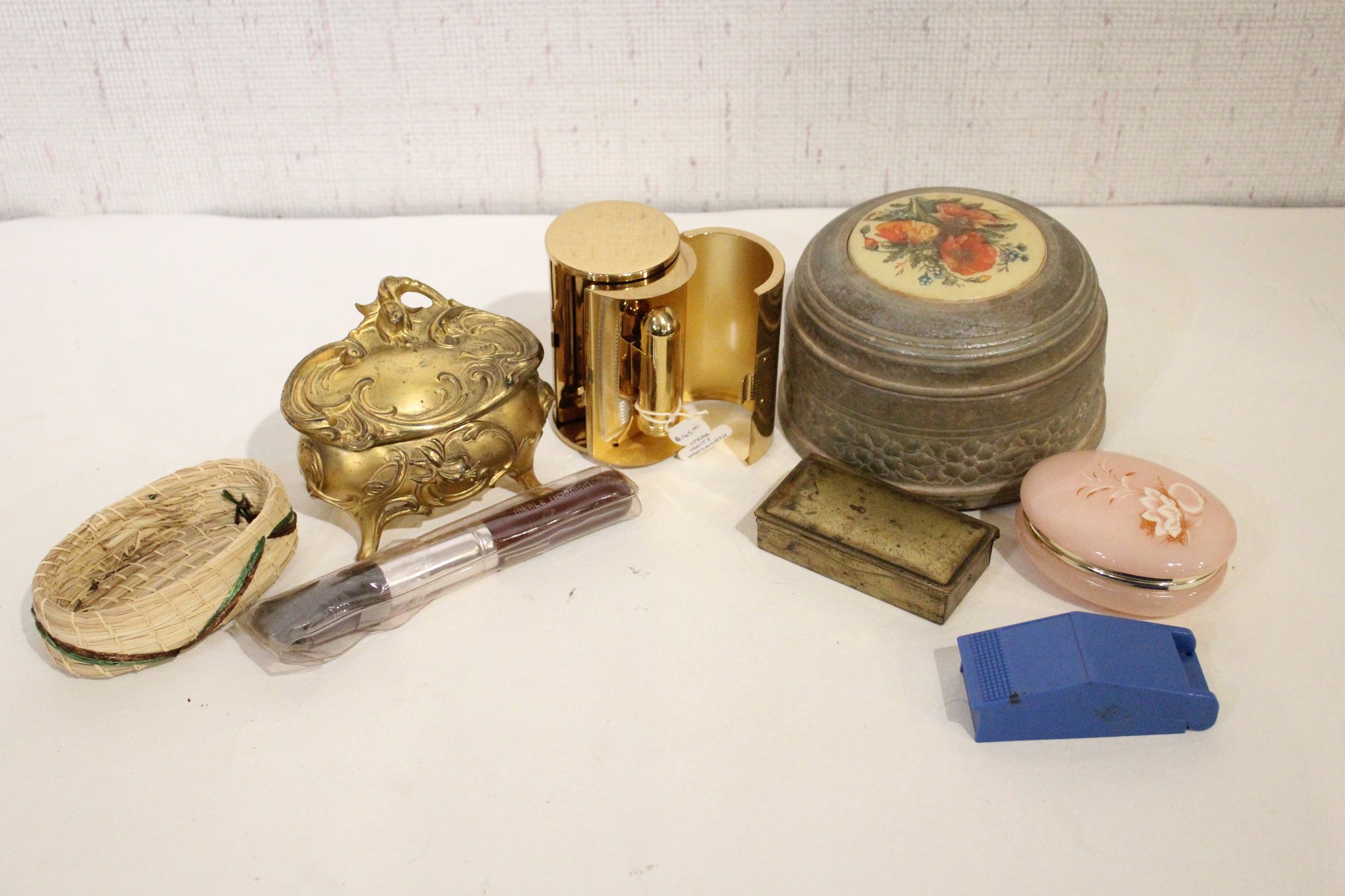 A small woven basket 4.5" x 1.5", a vintage Italian alabaster trinket box 3.25" x 1.25", antique W.B. Mfg (Weidlich Bros) Art Nouveau jewelry casket or trinket box 4" x 3.5" x 3", a vintage Wadsworth Opera Vanity containing a case of vintage Revlon Snow Rose 141 lipstick 4" x 2", a vintage tin trinket or powder box, wind up music that plays when you remove the lid 6" x 4", a vintage brass stamp box 3.25" x 2" x 1", a Merle Norman makeup brush 6", and lastly a a pill cutter and splitter 3.5" x 1". These items can be shipped.