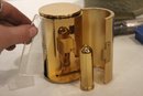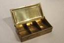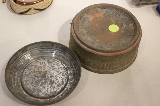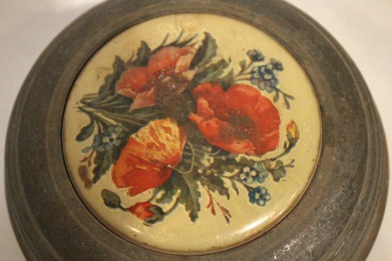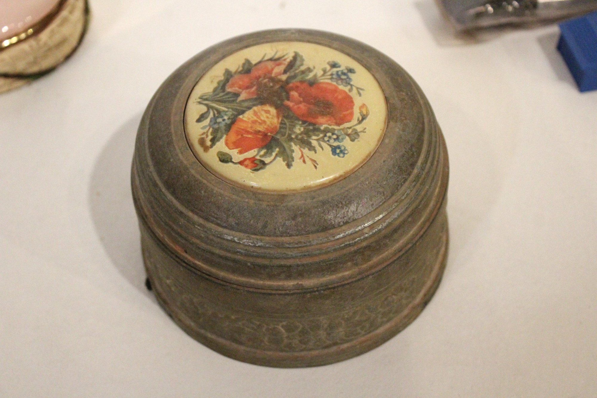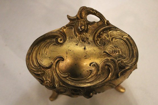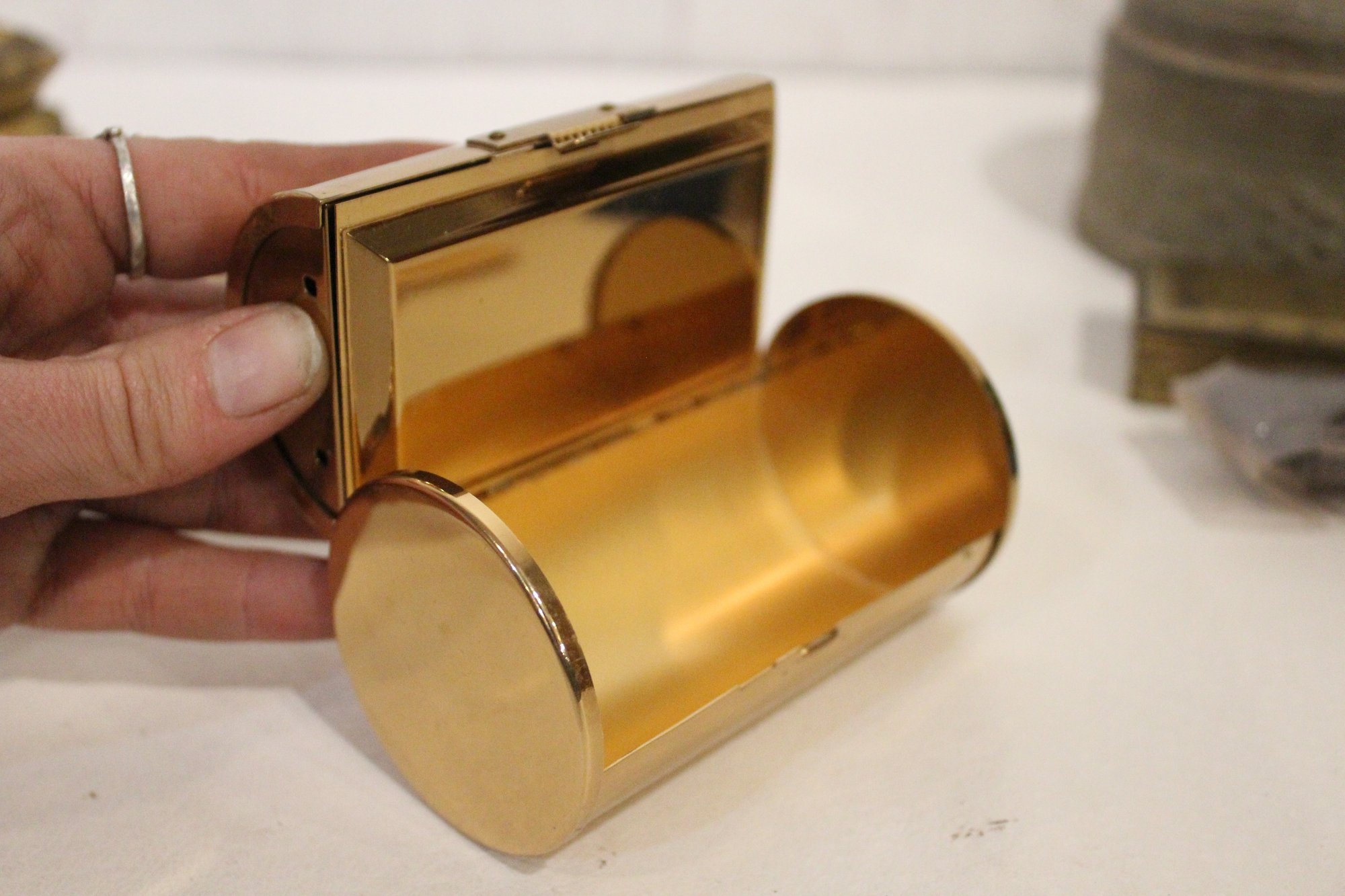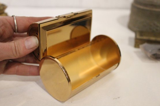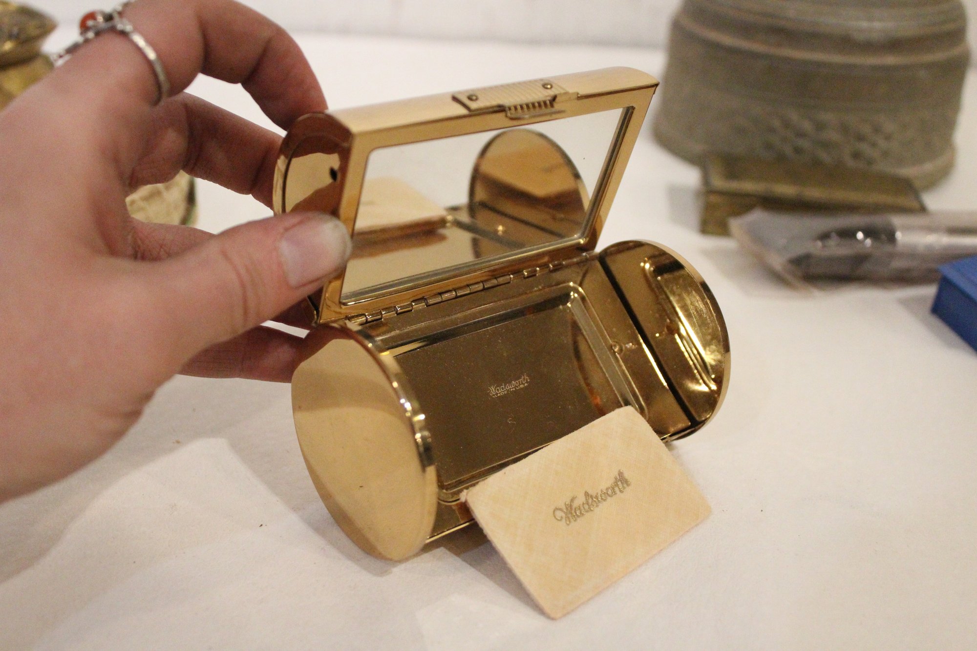 A small woven basket 4.5" x 1.5", a vintage Italian alabaster trinket box 3.25" x 1.25", antique W.B. Mfg (Weidlich Bros) Art Nouveau jewelry casket or trinket box 4" x 3.5" x 3", a vintage Wadsworth Opera Vanity containing a case of vintage Revlon Snow Rose 141 lipstick 4" x 2", a vintage tin trinket or powder box, wind up music that plays when you remove the lid 6" x 4", a vintage brass stamp box 3.25" x 2" x 1", a Merle Norman makeup brush 6", and lastly a a pill cutter and splitter 3.5" x 1". These items can be shipped.