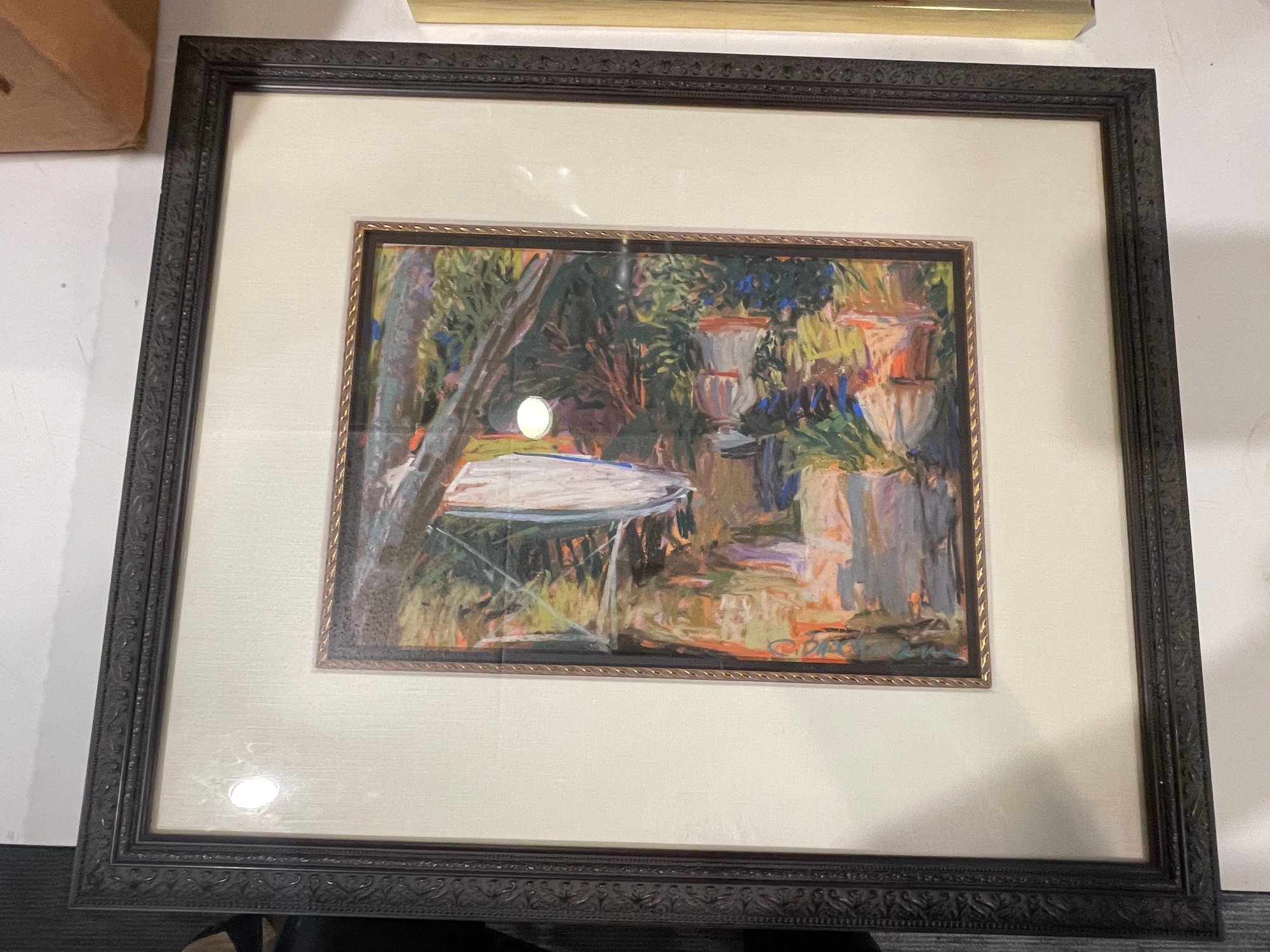 Approximately 20x 17 frame, nicely matted original pastel title “The Guardian Urns in Bastelica Corsica”