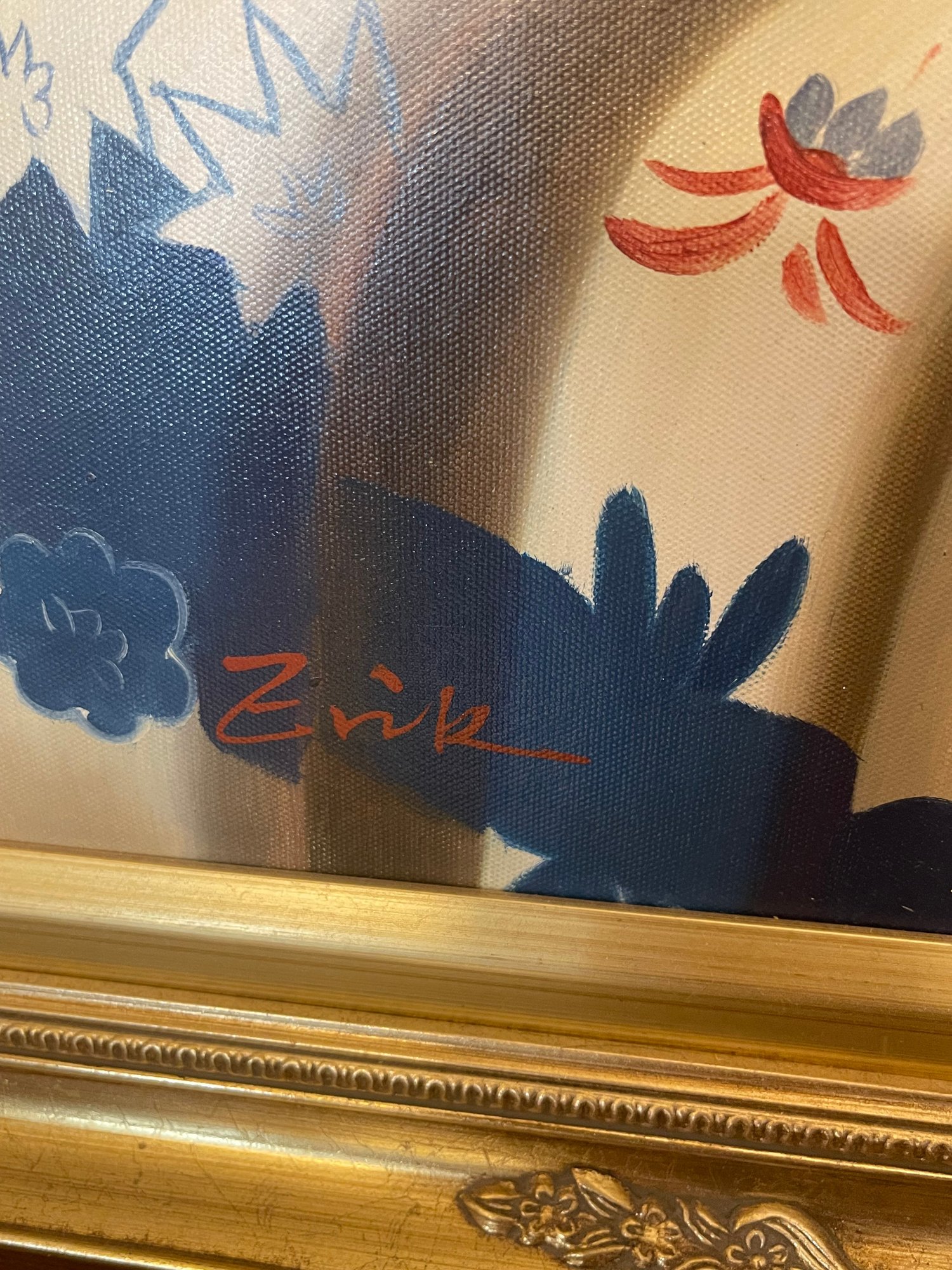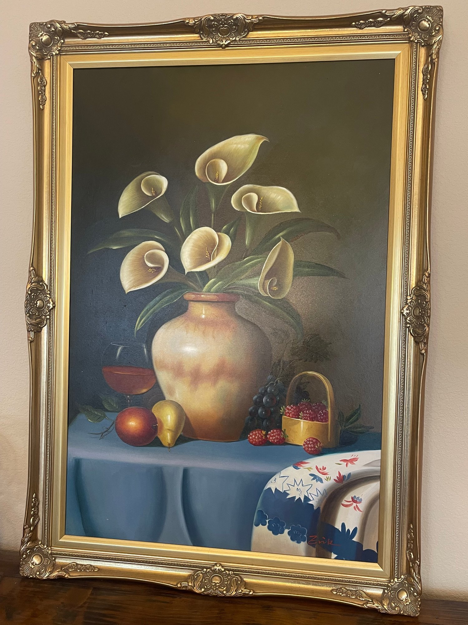 oil still life, signed. Gilded gold frame. The art is 24x36 and the frame is 29 x 41 inches