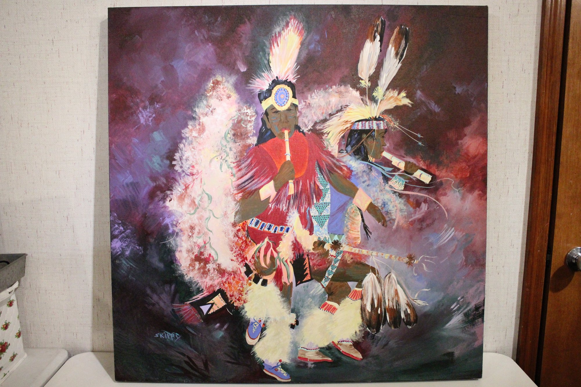An original painting of two Native American dancers by the artist Skippy. This painting showcases the hand of the artist complimenting the vibrant colors and dynamic poses. 36" x 36" x 2", this item can not be shipped.