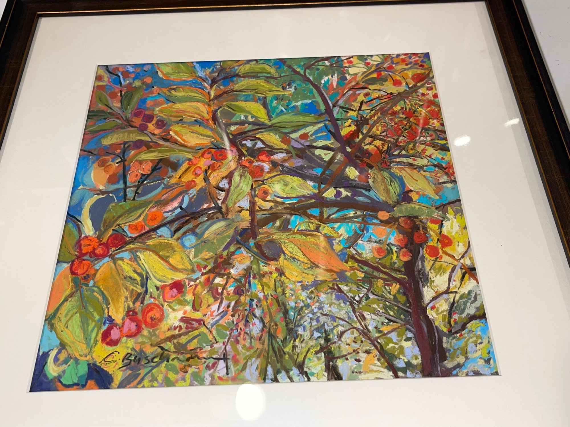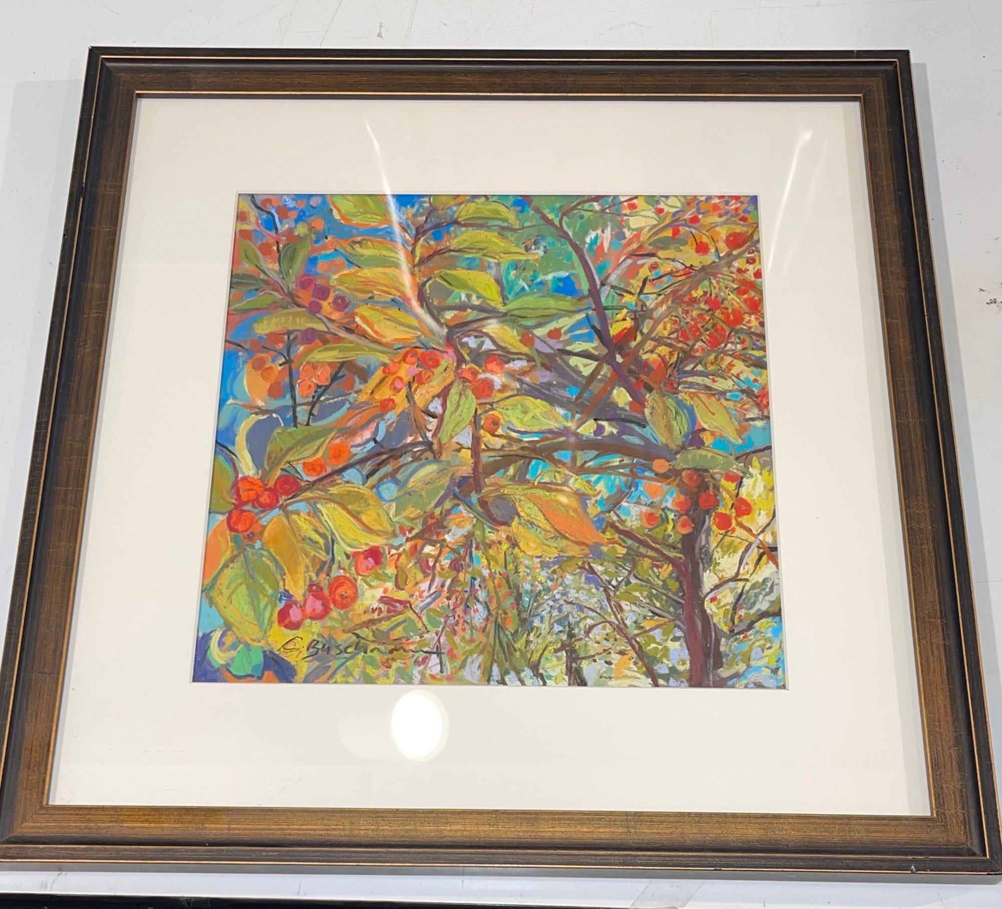 Signed pastel of a tree with berries, by artist Carole Buschmann.