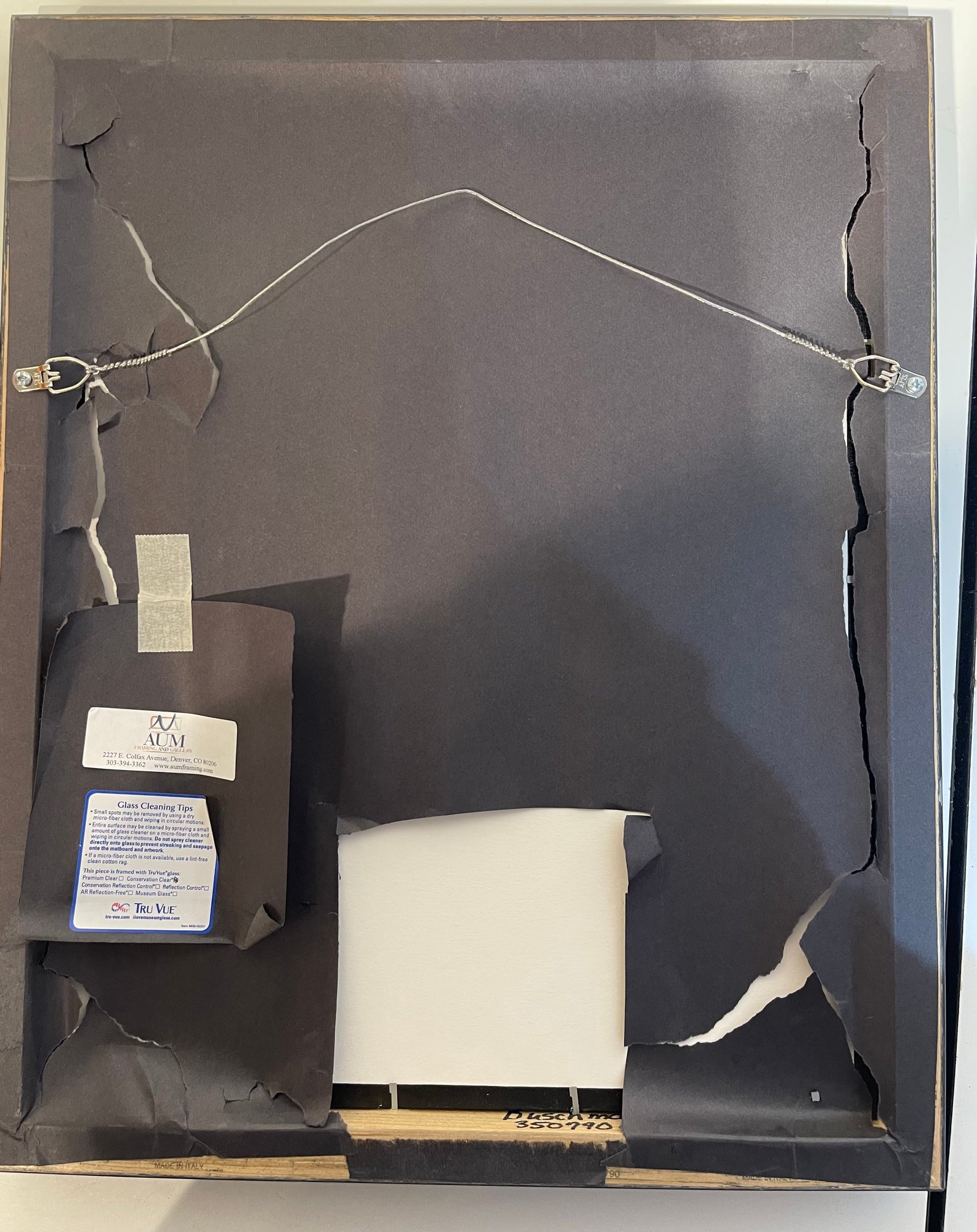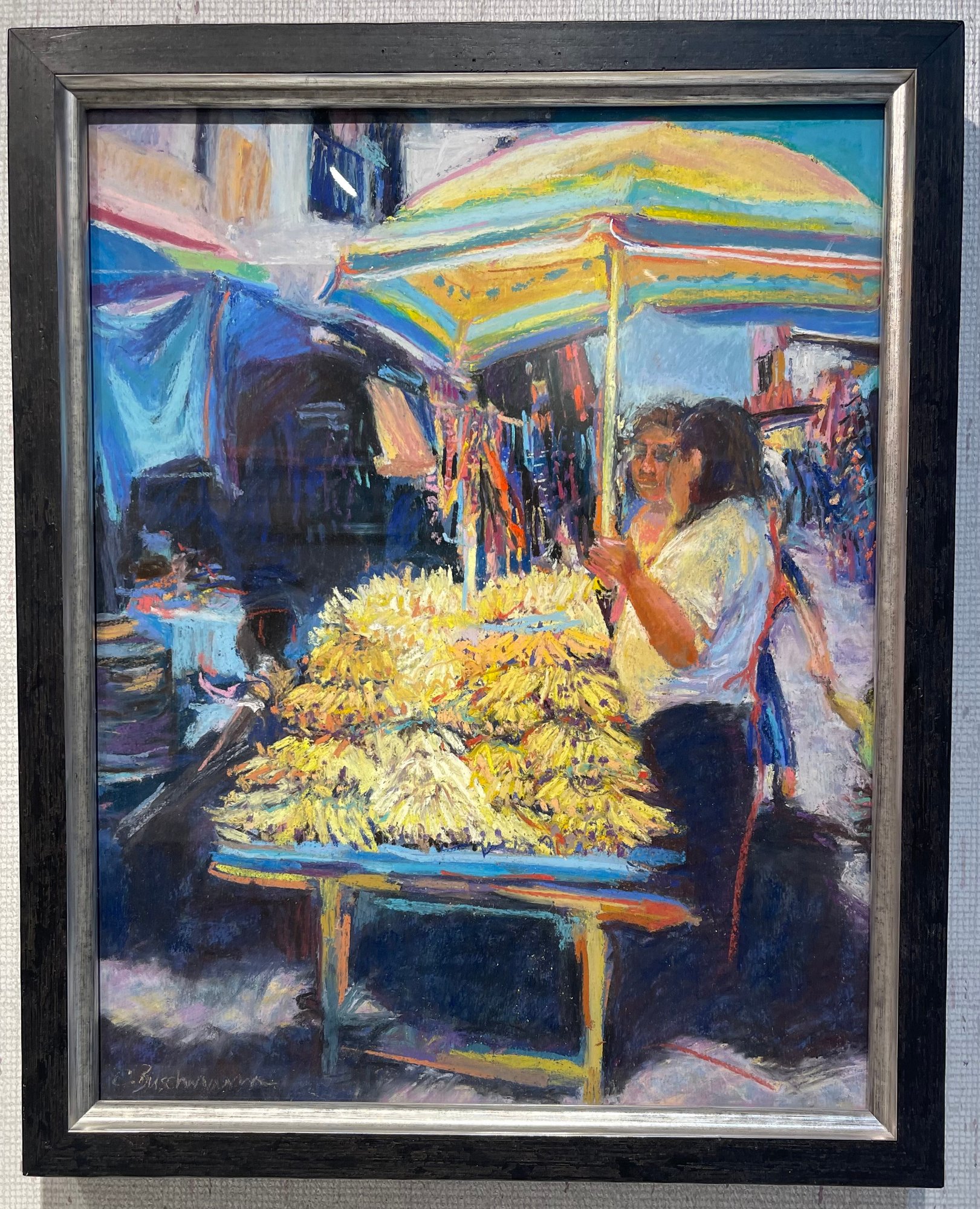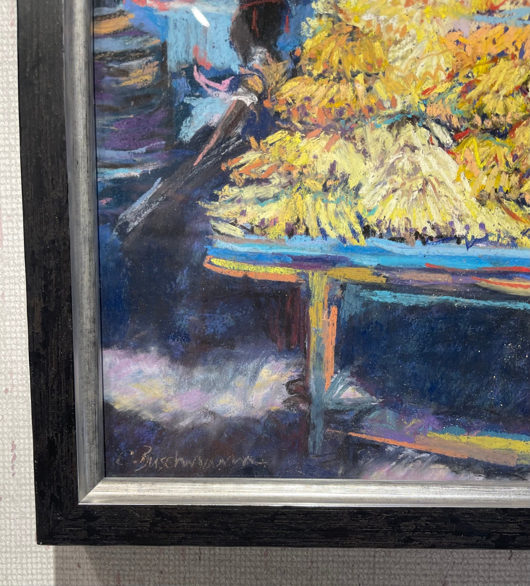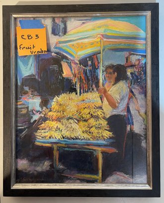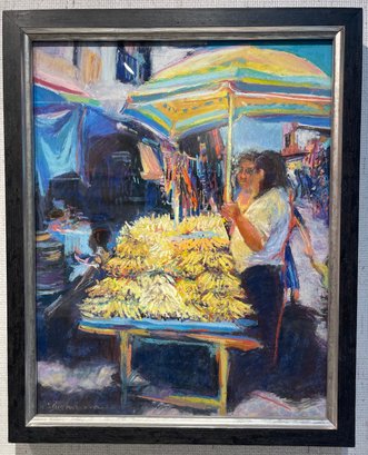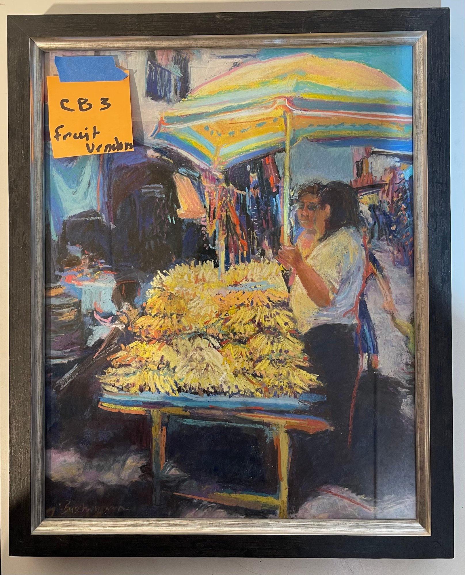 In a frame with glass, this measures 19 x 16 inches. It is an original pastel of fruit vendors at a Guatemalan market. Not eligible for shipping . The paper backing has been torn.