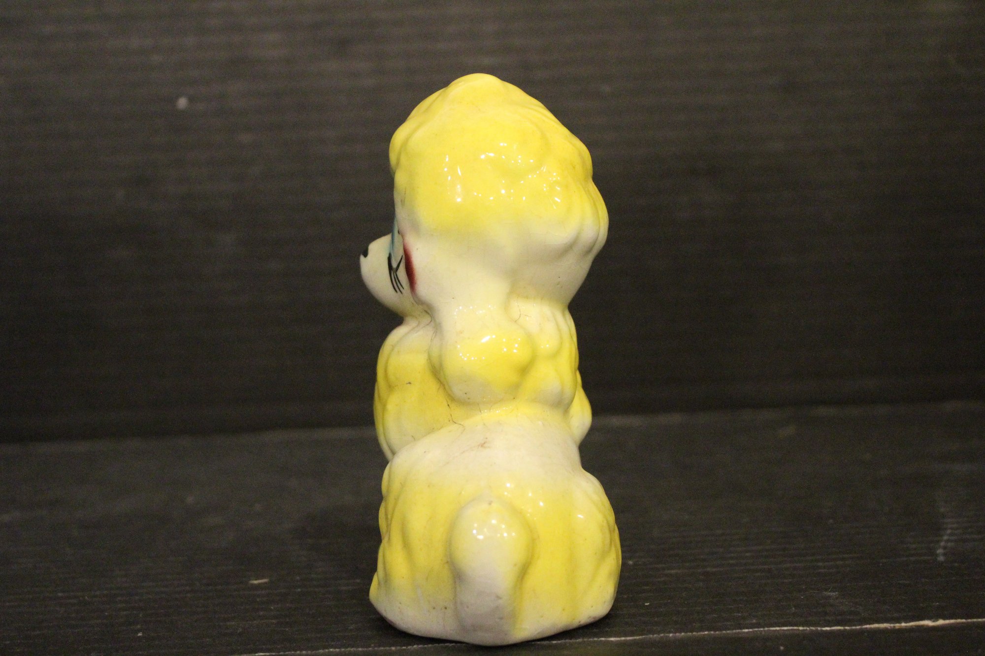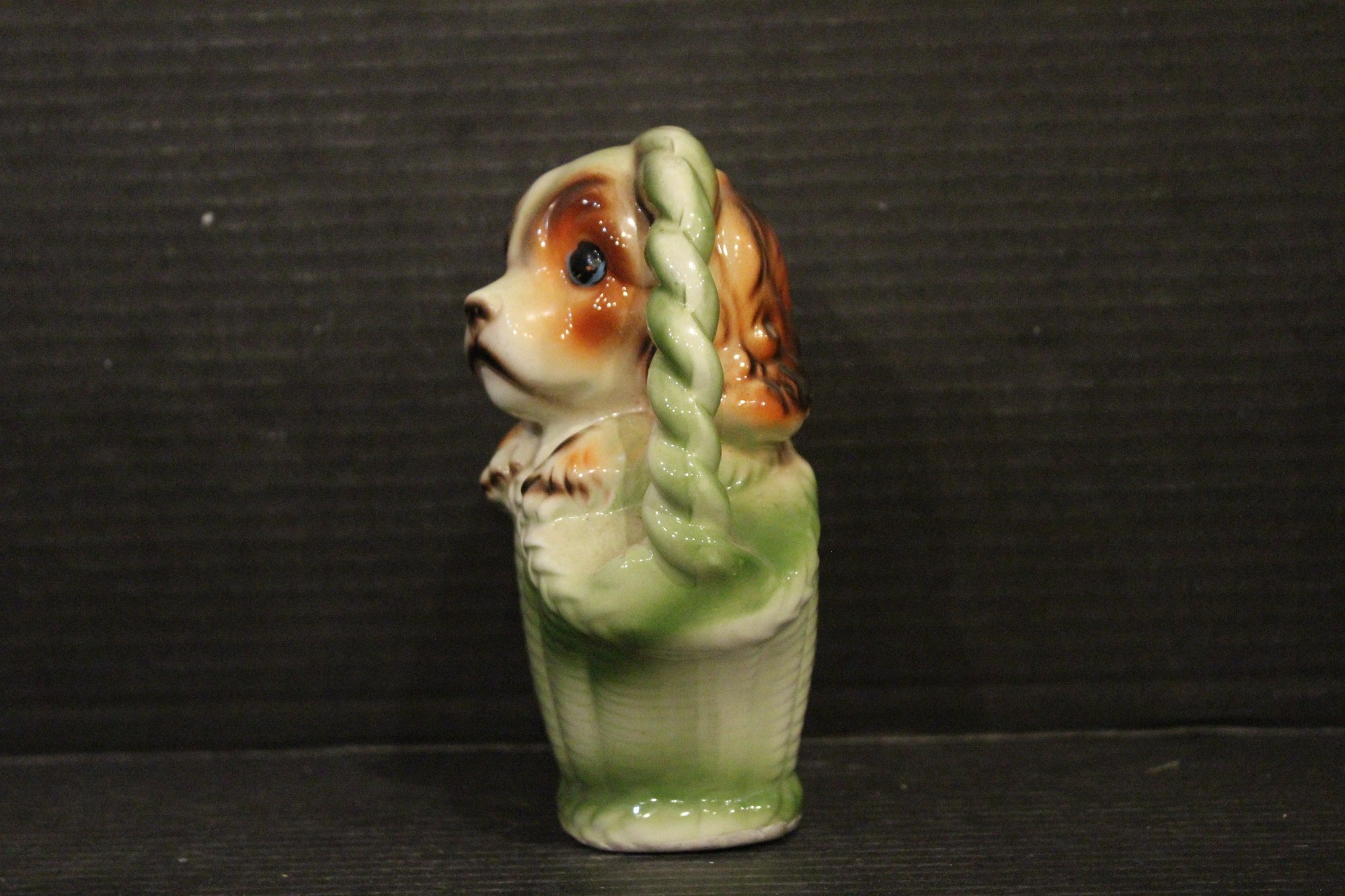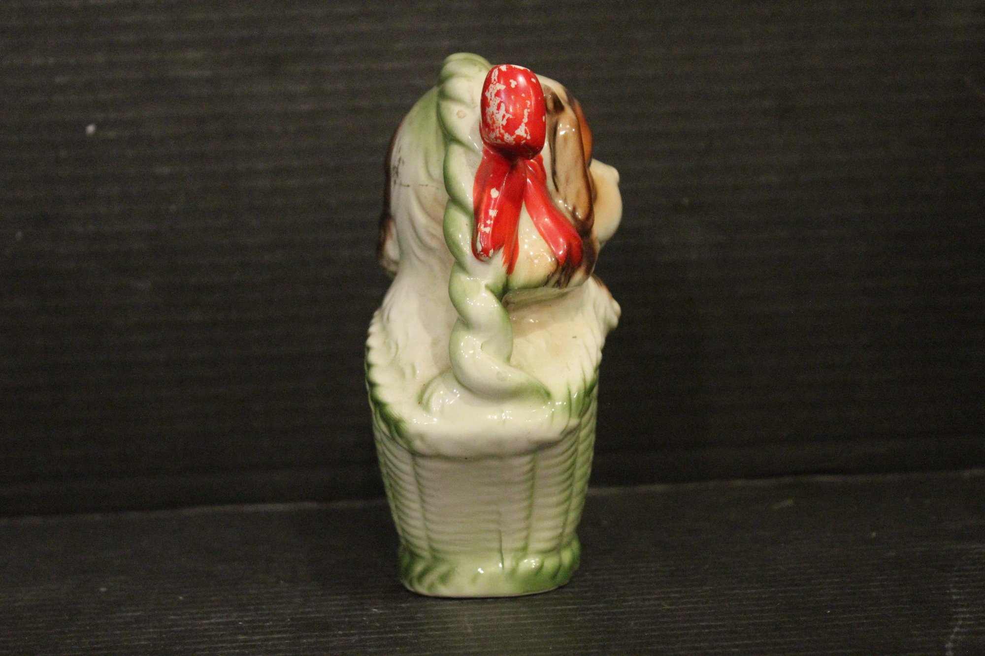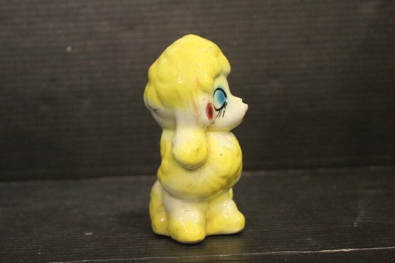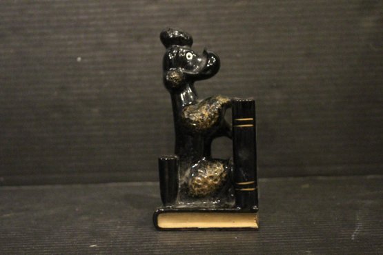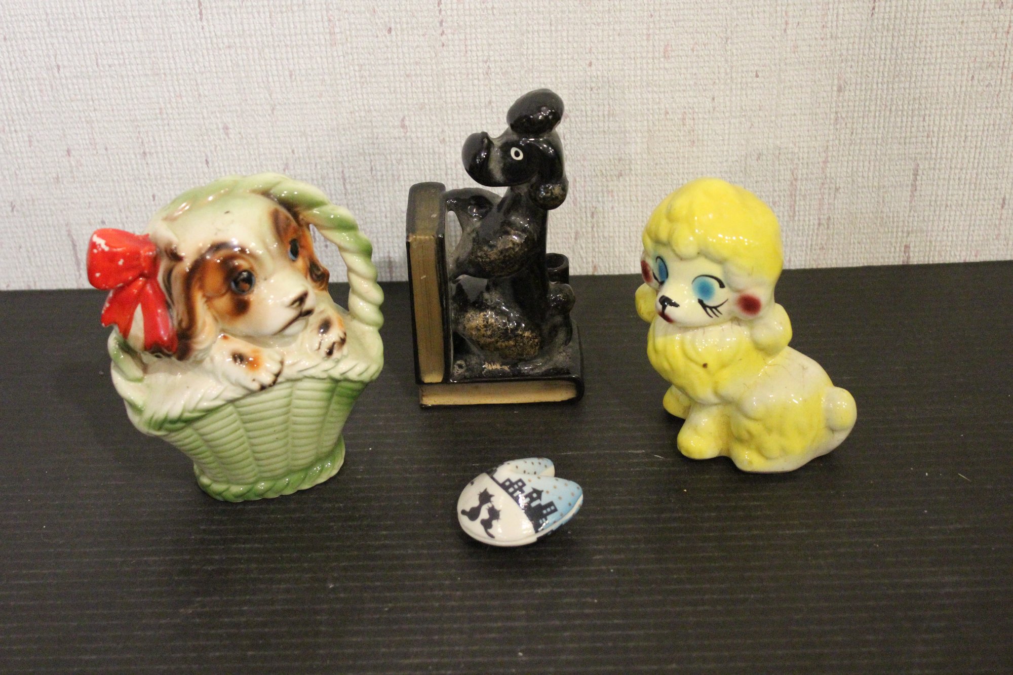 vintage 1950s Norleans Cocker Spaniel Ceramic Green Woven Handled Basket Coin Bank, 6" x 5", Vintage Redware French black poodle Bookend Pen Holder 7" x 3" x 2", Vintage Ceramic Poodle Figurine: Hand-Painted Dog Collectible 6" x 4", hand-painted ceramic fortune cookie-shaped trinket 2" x 1". These items can be shipped.
