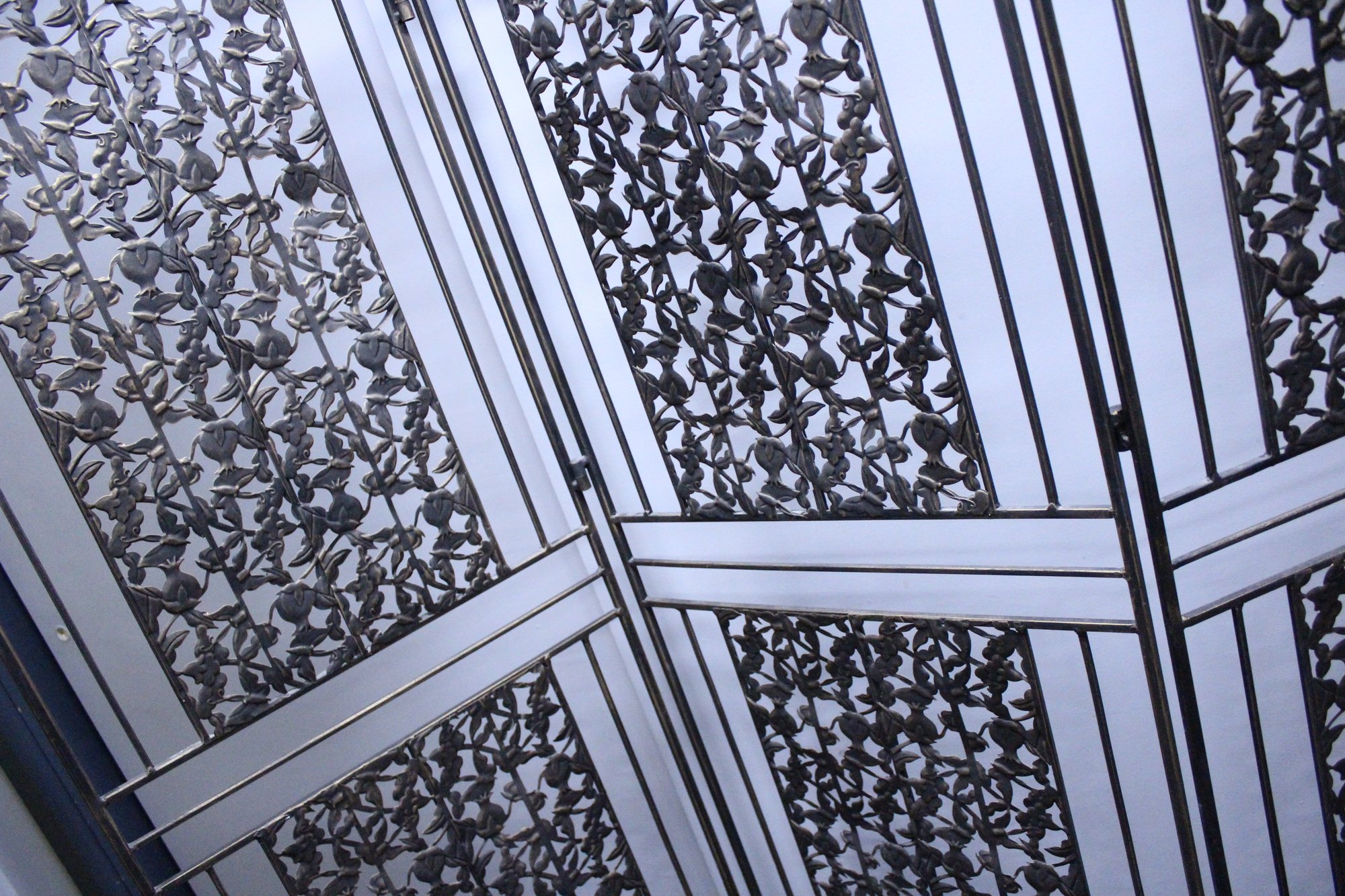 A heavy art deco ornate metal room divider with repeating floral patterns 59" x 73". This item is not eligible for shipping.