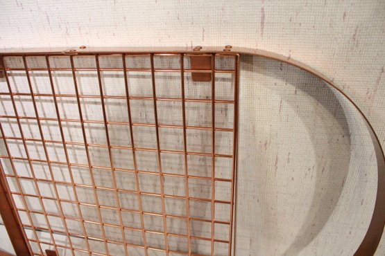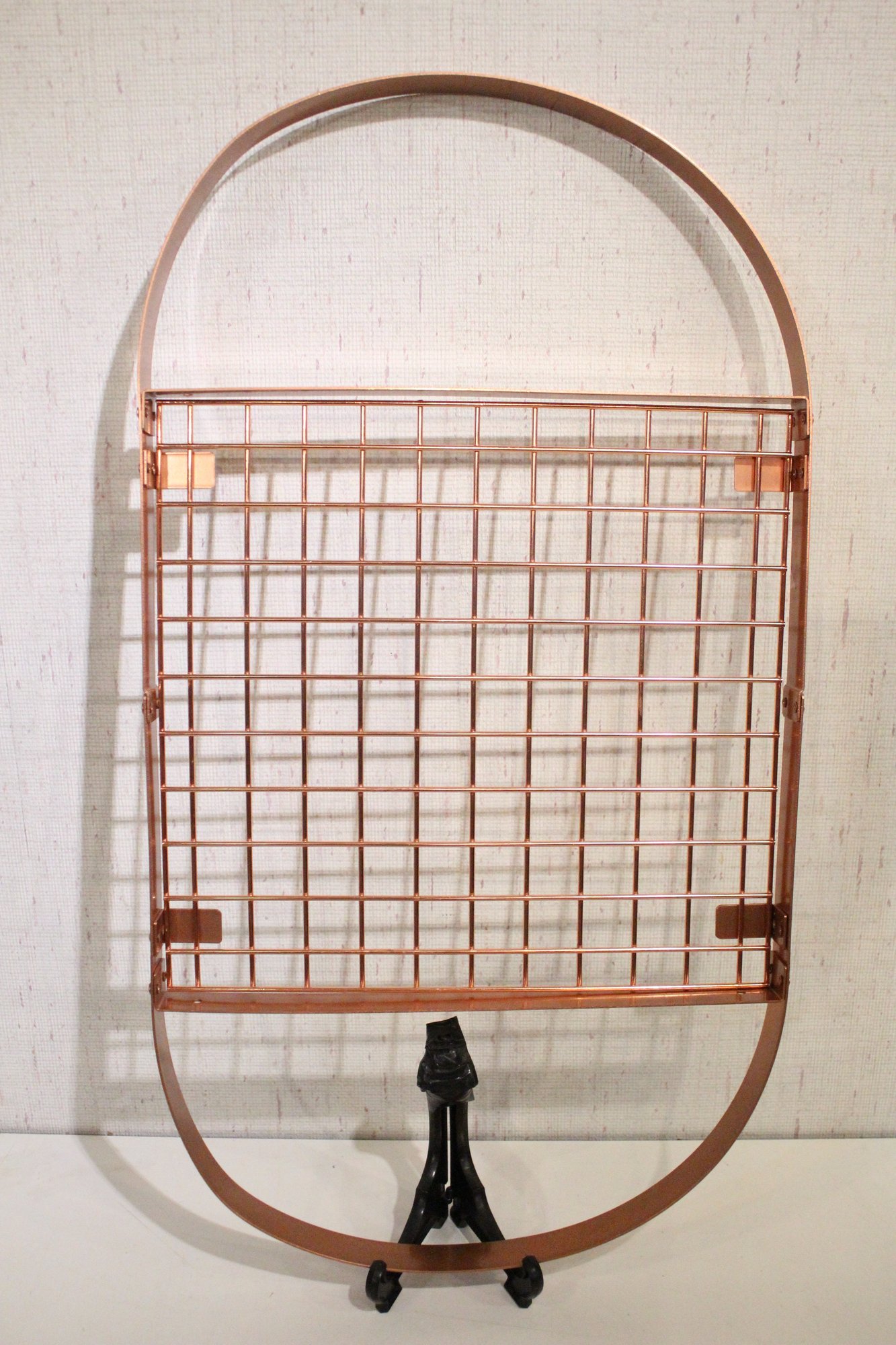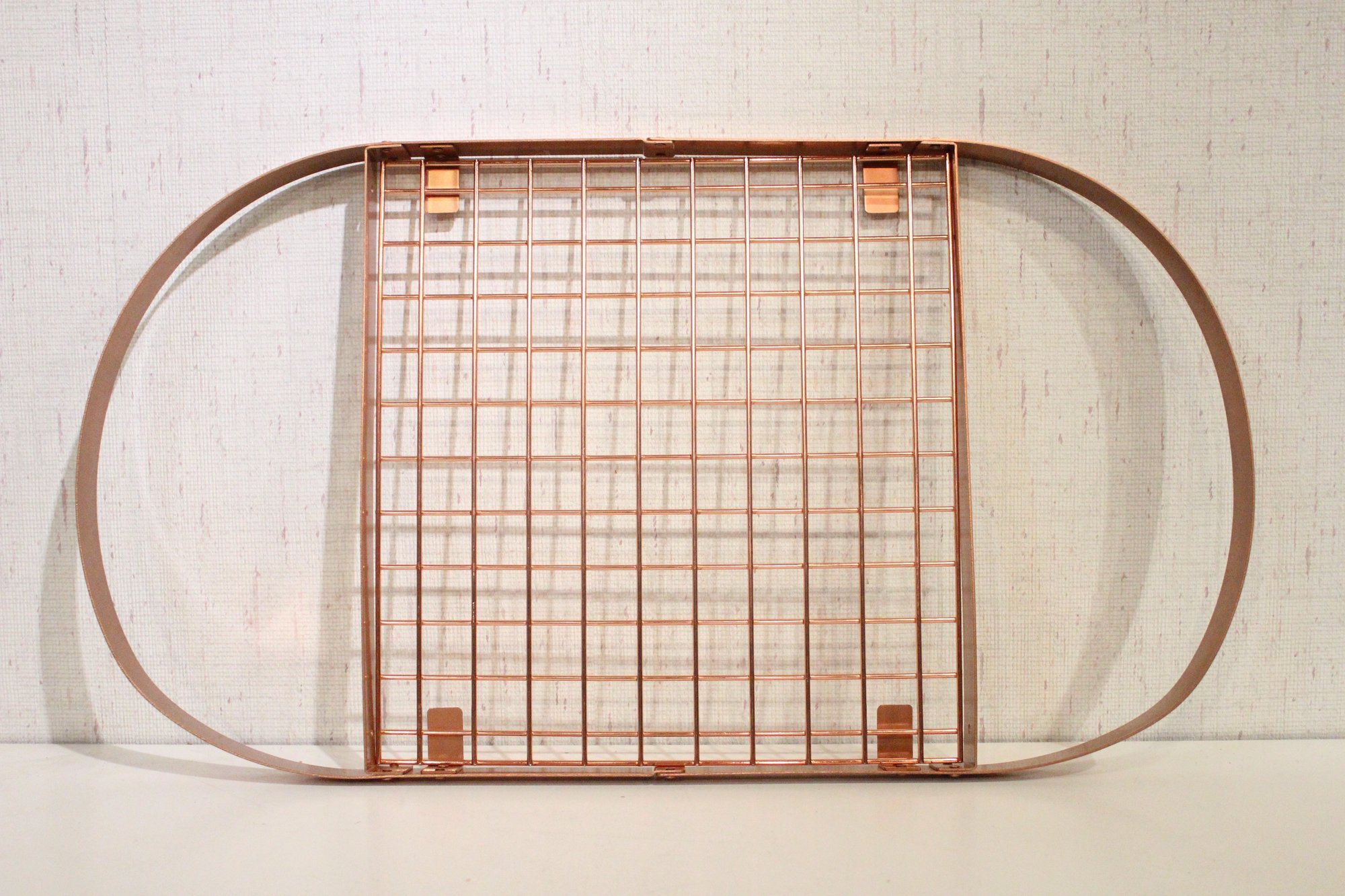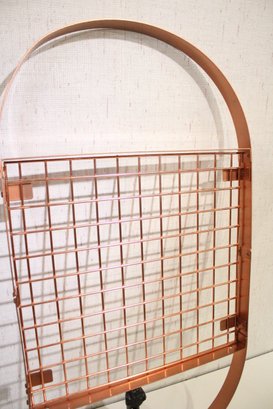 A copper-toned or rose gold toned oval pot rack with a grid for storage 32" x 13" x 1.5". This item can not be shipped.