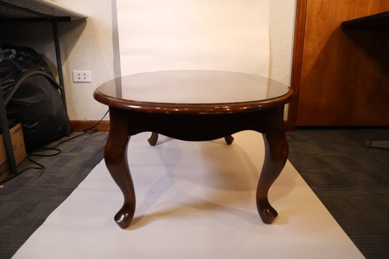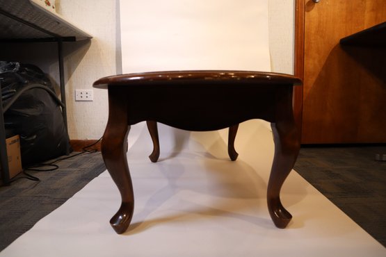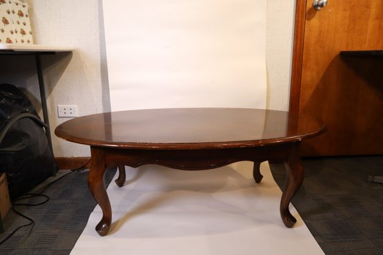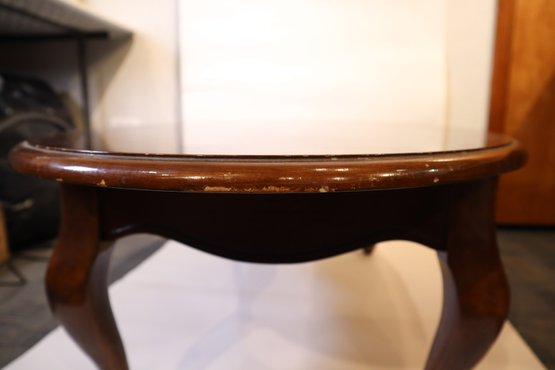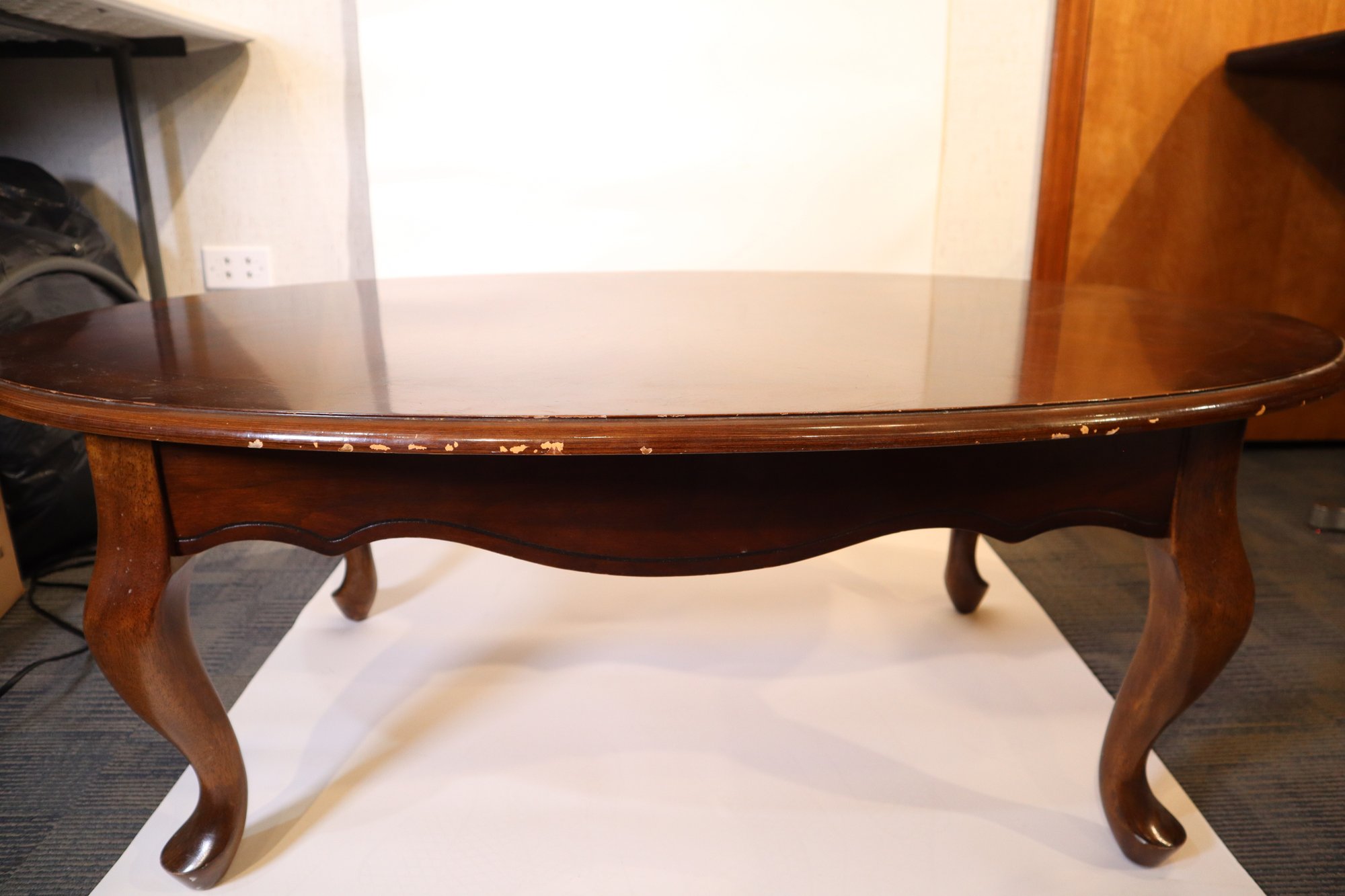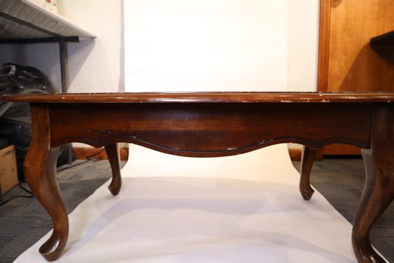 A wooden coffee table in a French Baroque or Queen Anne style. It is solid wood, likely Cherry wood. The edges show slight wear from use, with small spots of the finish missing. The damage is cosmetic and there is no major damage to the wood structure of the table. Not eligible for shipping.