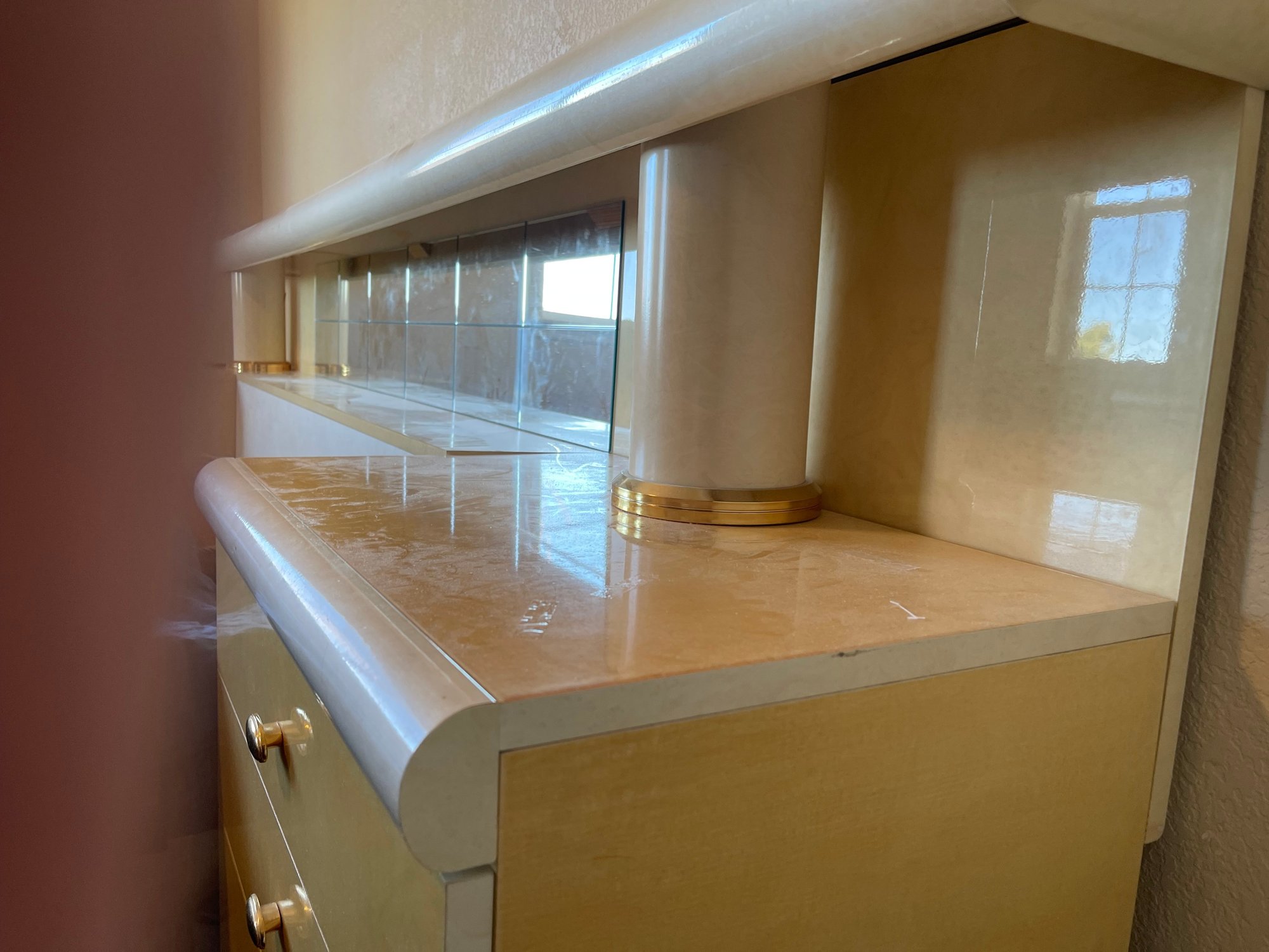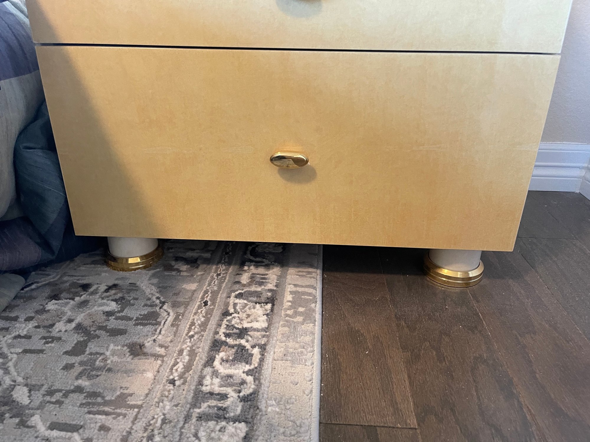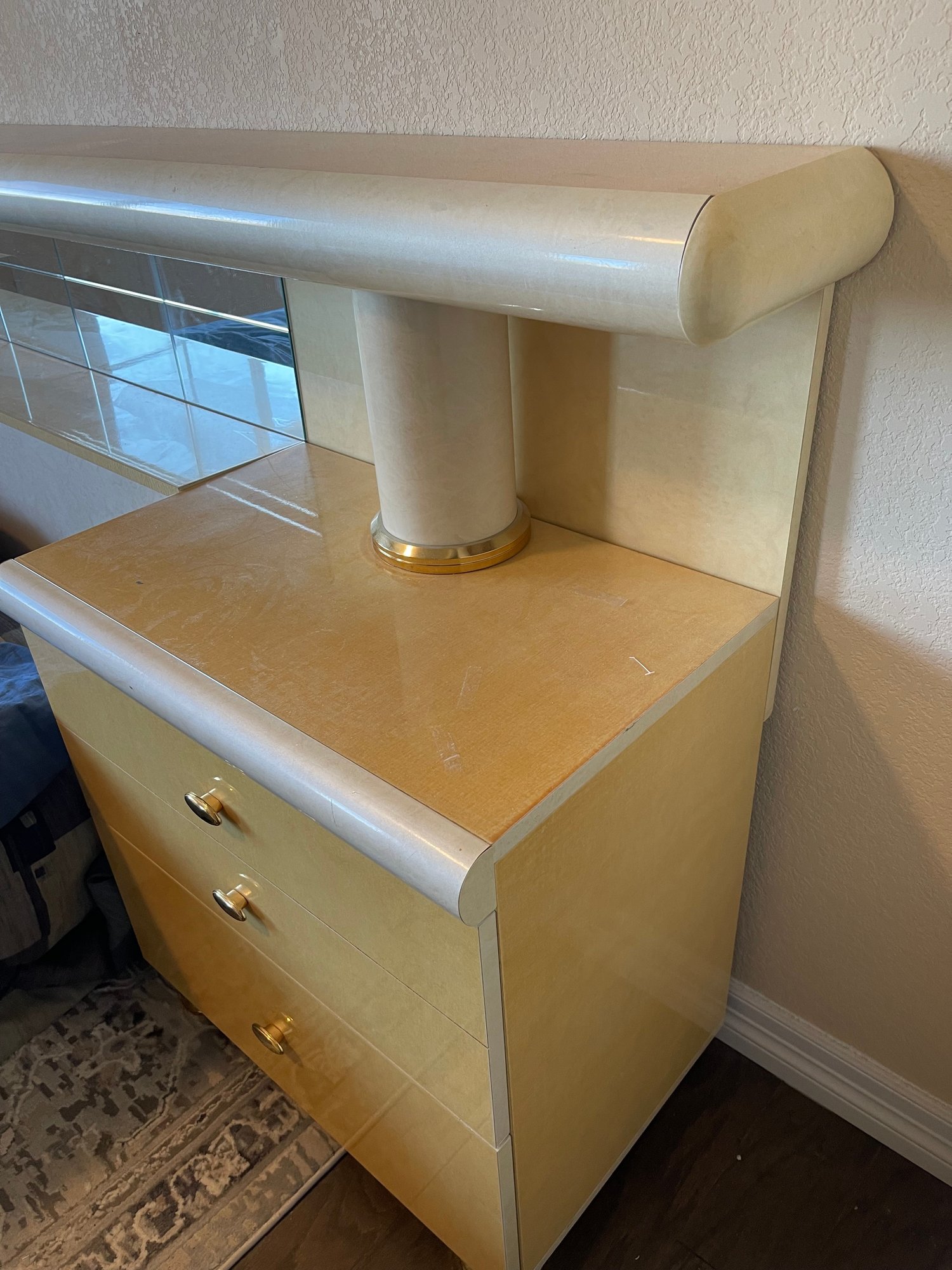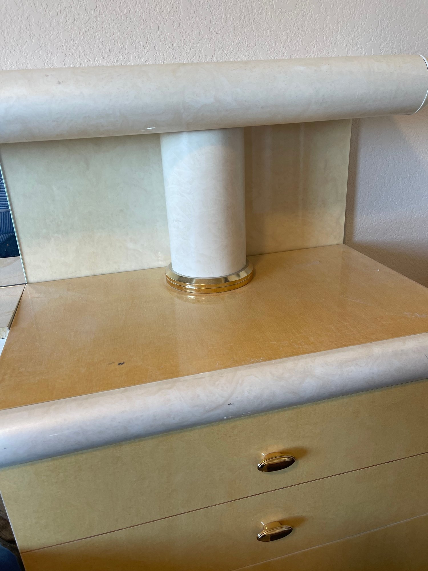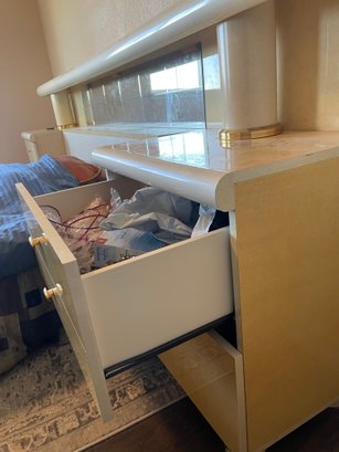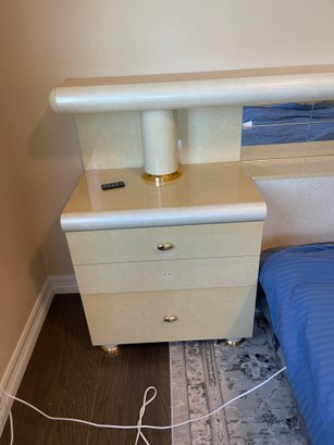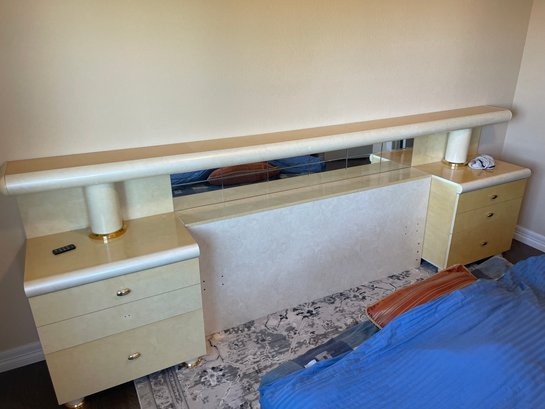 This is a monolithic headboard. Bed frame and mattress not included. Bedside tables are built into the headboard. 1 drawer handle is missing