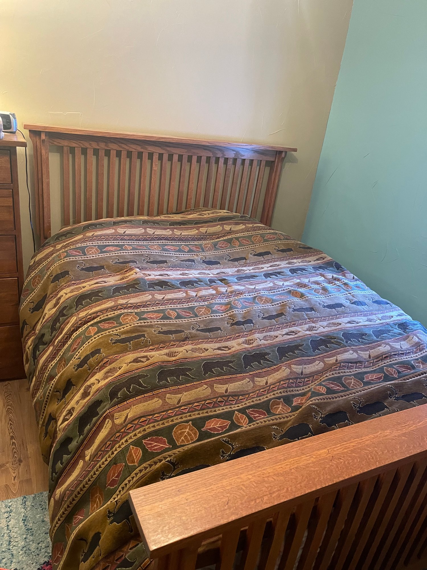 Bears, elk, fish and canoes decorate the woven fabric of this bedding set. Perfect for a mountain condo or cabin.