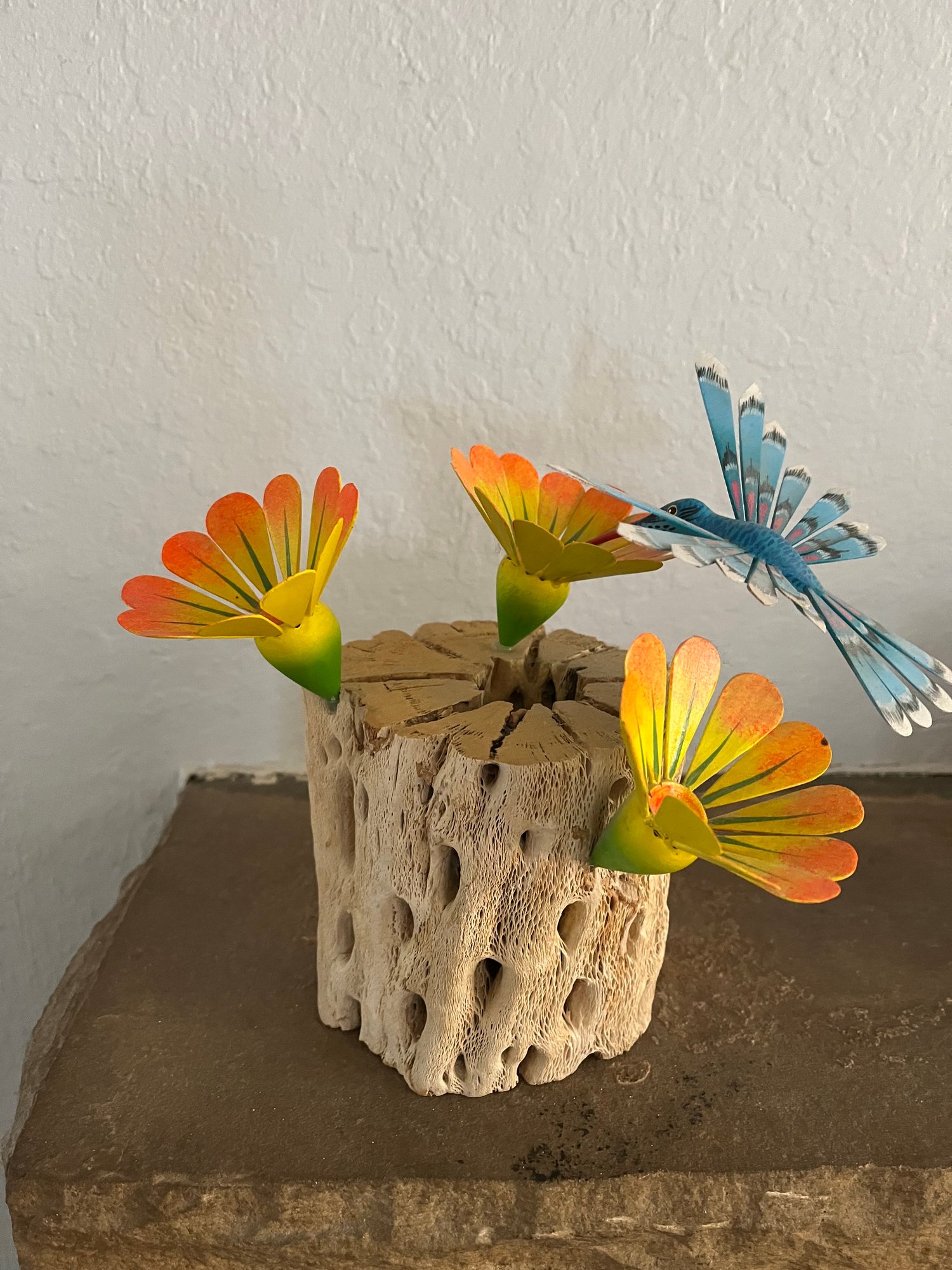 Hand-designed cholla cactus with delicate wooden hummingbird and flowers. Very unusual and charming.