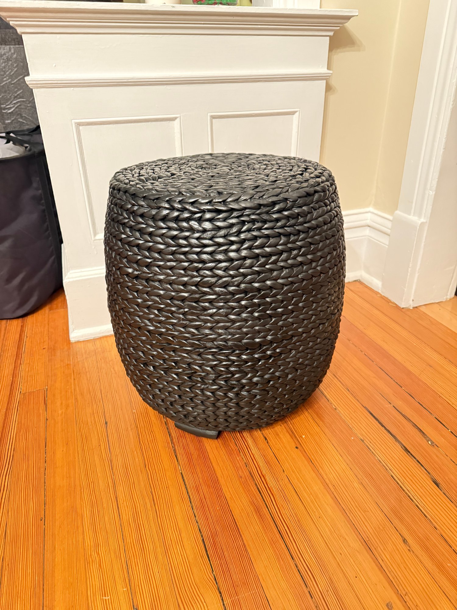 Refinished rattan hassock/stool. Painted in flat black approximately 17 1/2 inches in diameter and 19 inches tall. Solid construction, no structural damage or significant wear and tear.