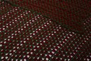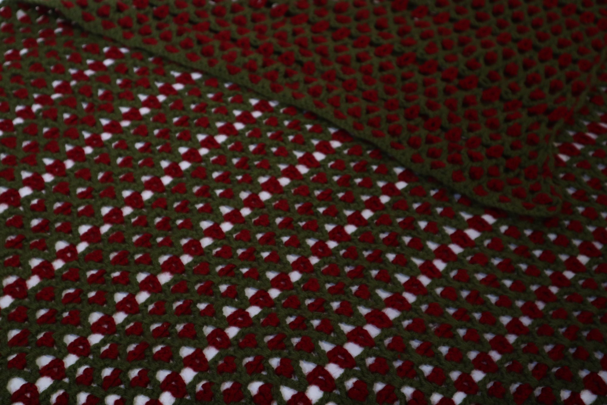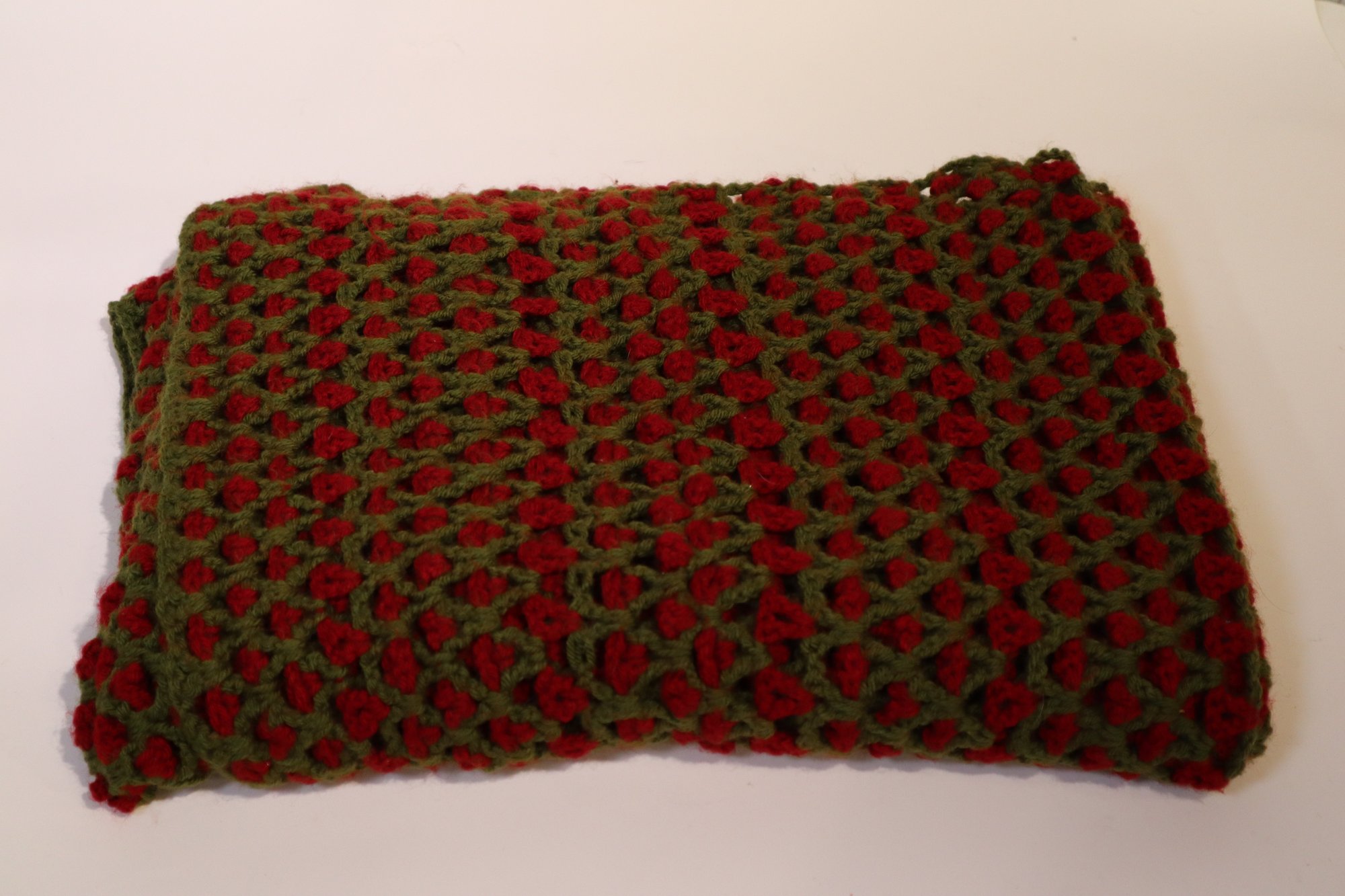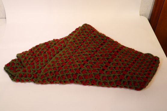 A red and green knit blanket, the knit pattern is large and repeated geometric gaps, this would make a great throw for the back of a chair or a couch.