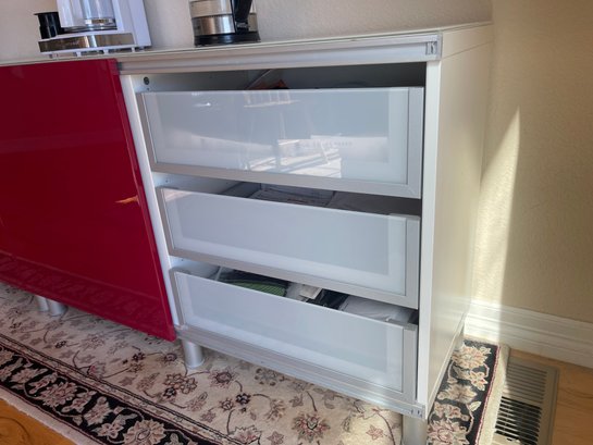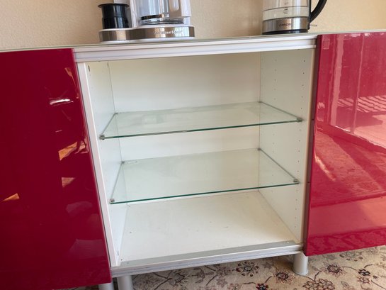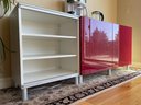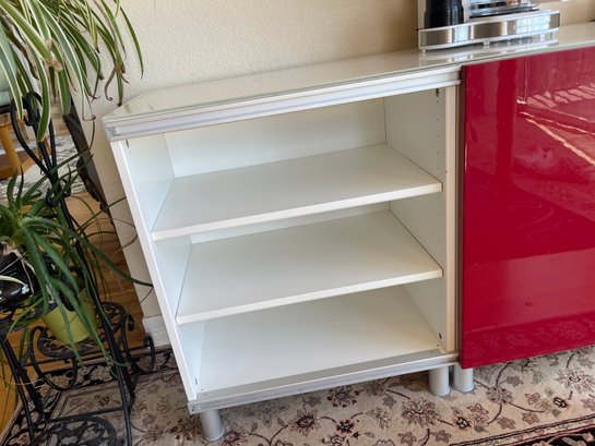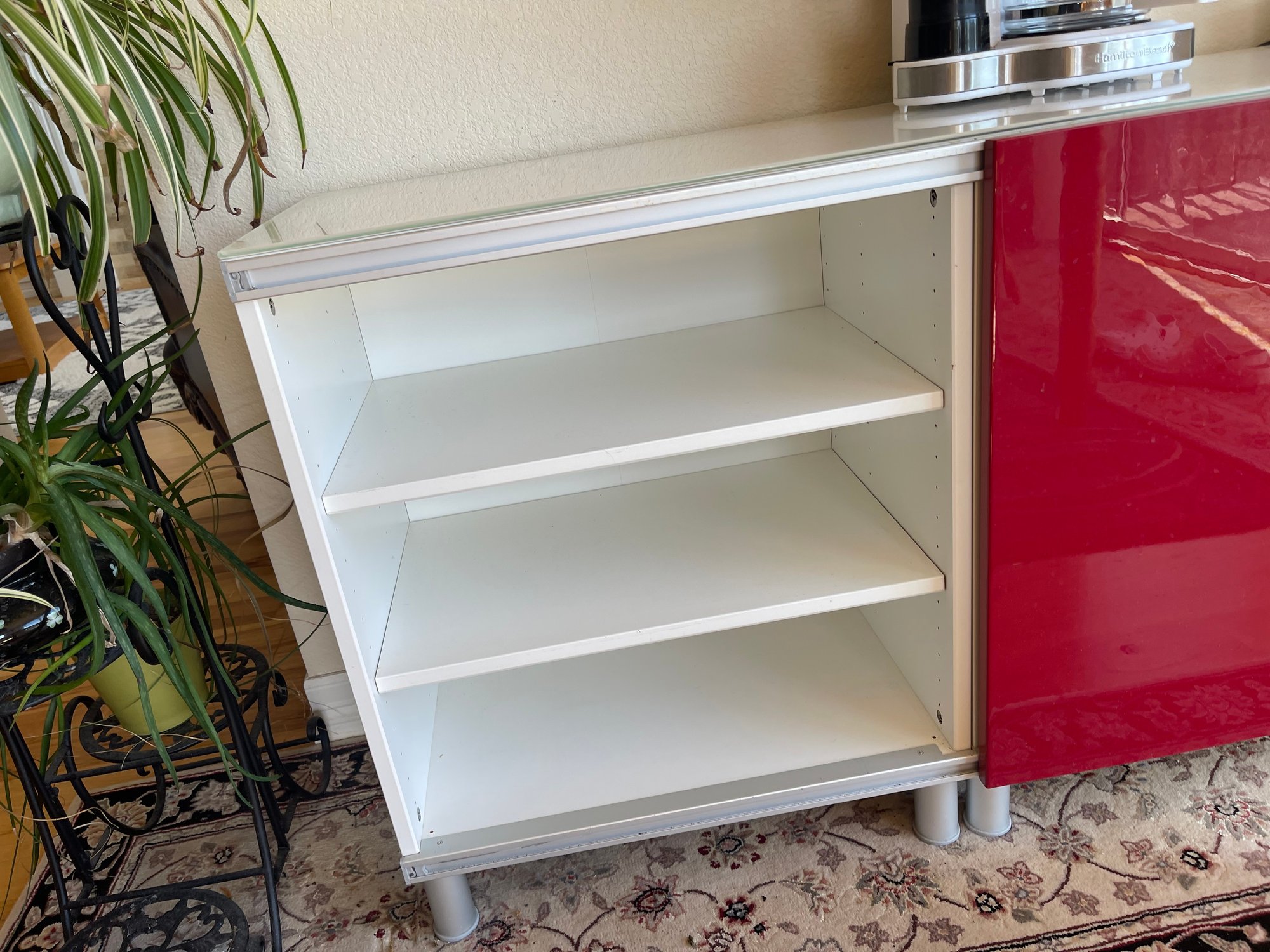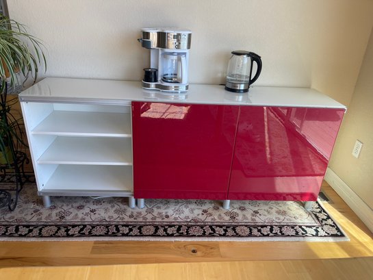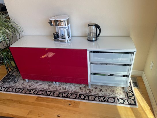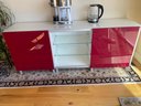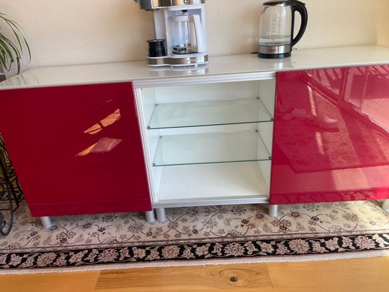 71 w, 17 d, 29 h in excellent condition and a real statement piece. 2 sections have shelves, 1 has drawers