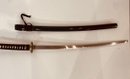A sleek dark green and black decoration katana with a decorative brass handle on the sword and on the end of the sheath. The handle of the sword has an ornate brass handle wrapped in a black cord, and the sheath is a gentle gradient from dark green to black. This item can be shipped.