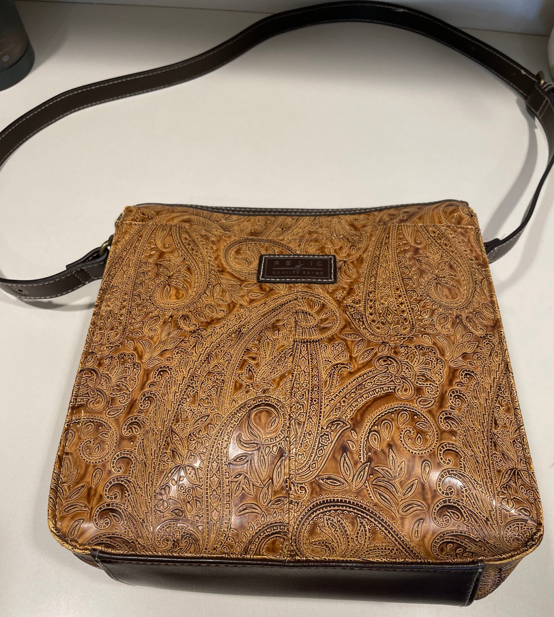 10 x 9.5 x 3.5 brown purse with shoulder strap, 2 outside pockets, 4 interior sections with 2 zip pockets. Embossed with multi-tone paisley pattern. mild scuffing at bottom corners, otherwise in pristine condition.