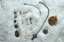 4 christian pins and a bronze toned tag, 3 pairs of cuff links, 1 lone cuff link and pin. A mother of pearl cross necklace, 16", and a silver toned cross necklace, 16", long. As well as a wooden cross pendant and lutheran rose pendant. These items can be shipped.