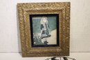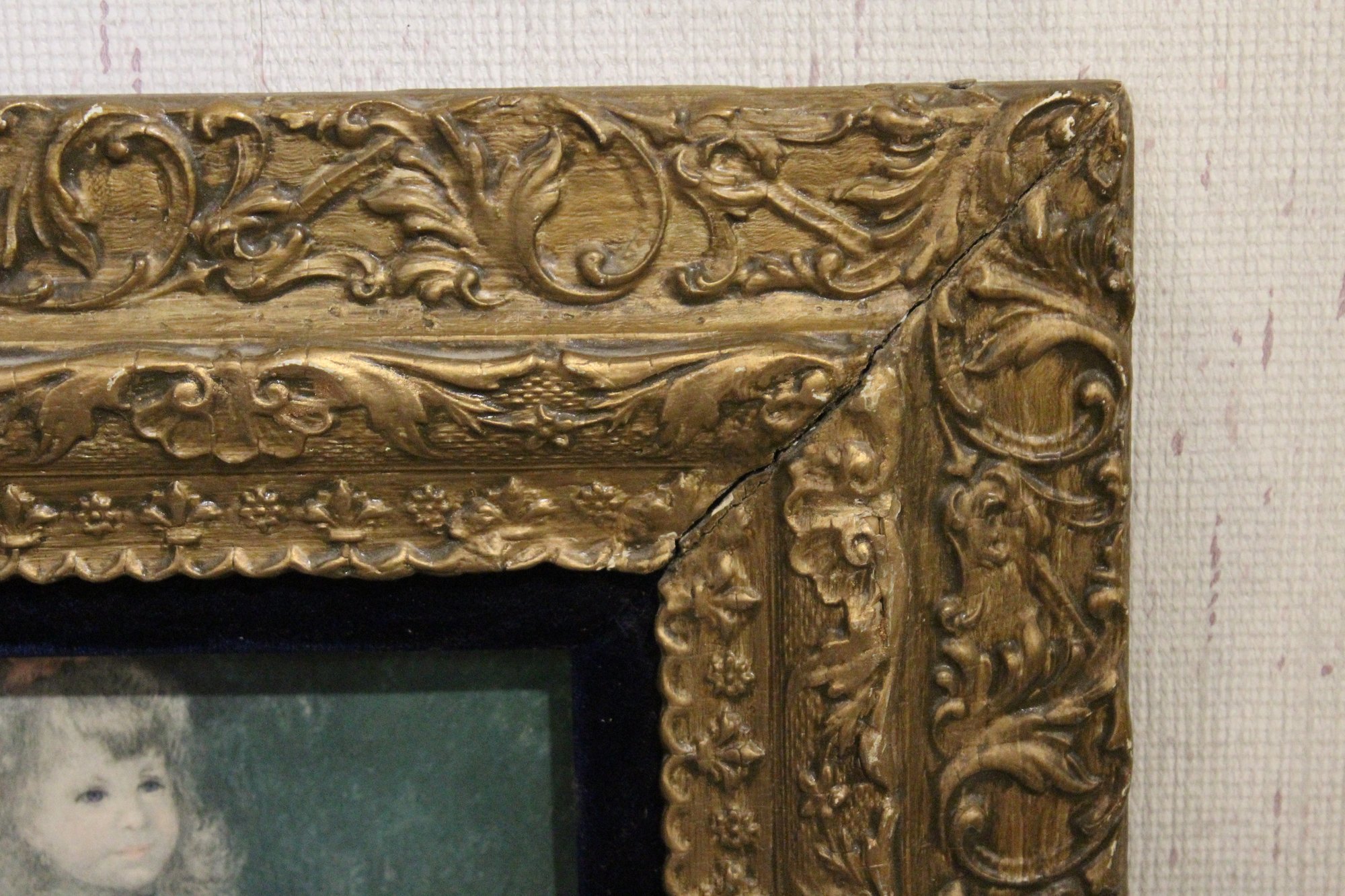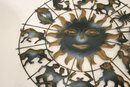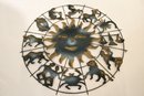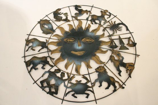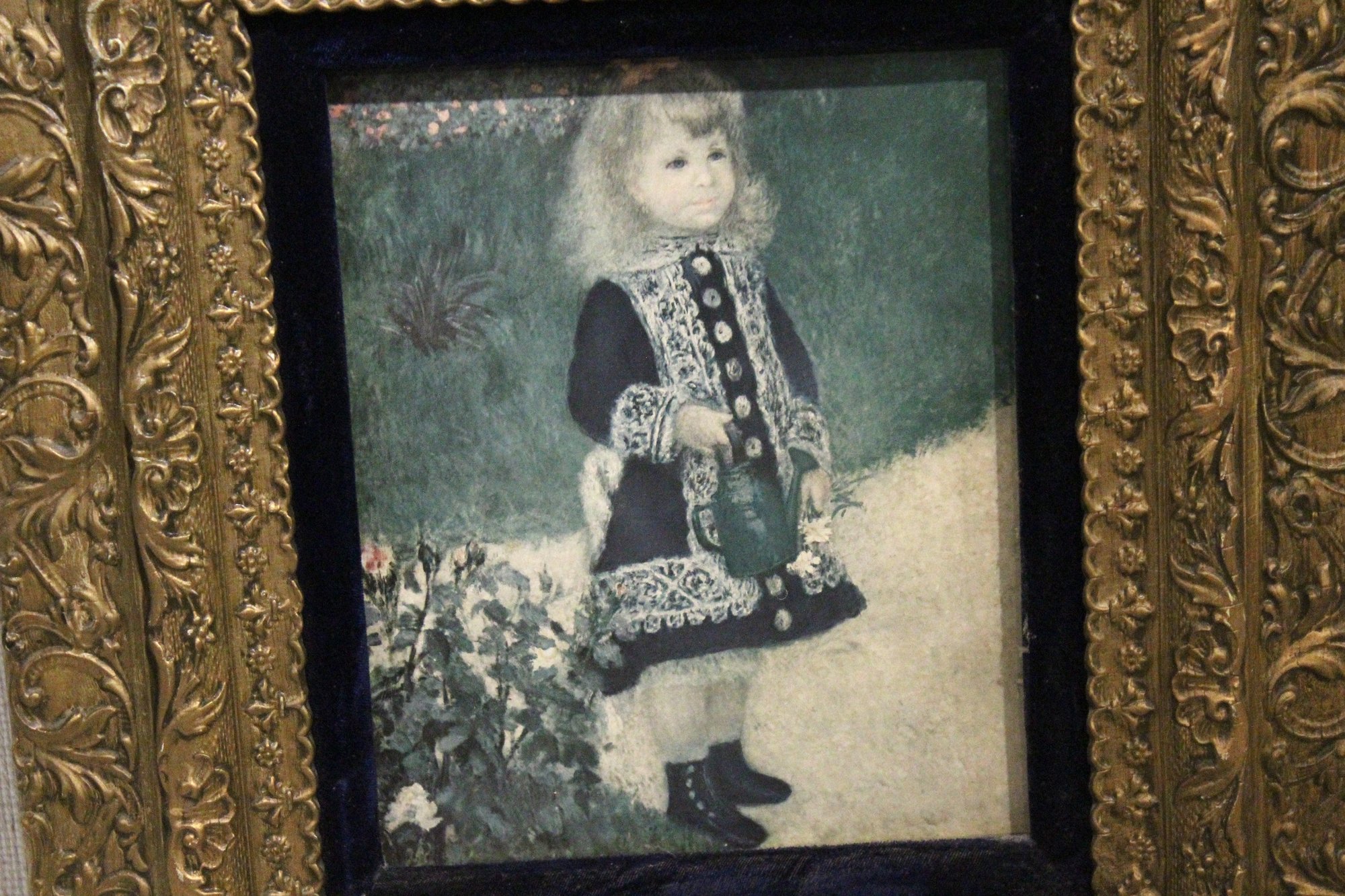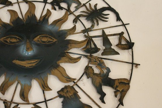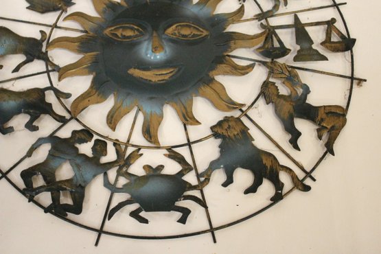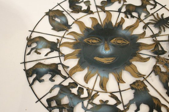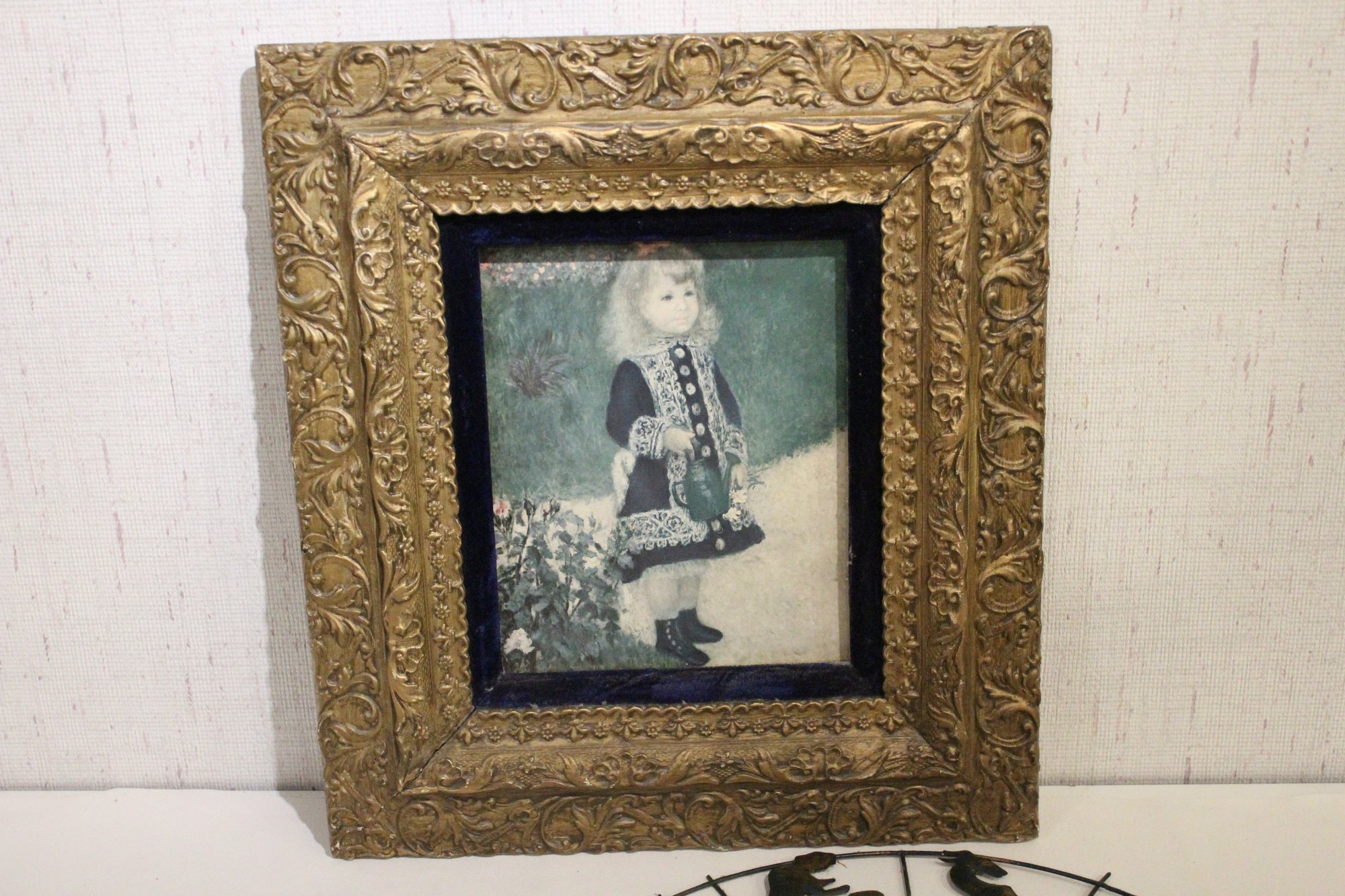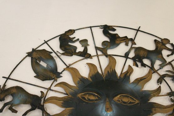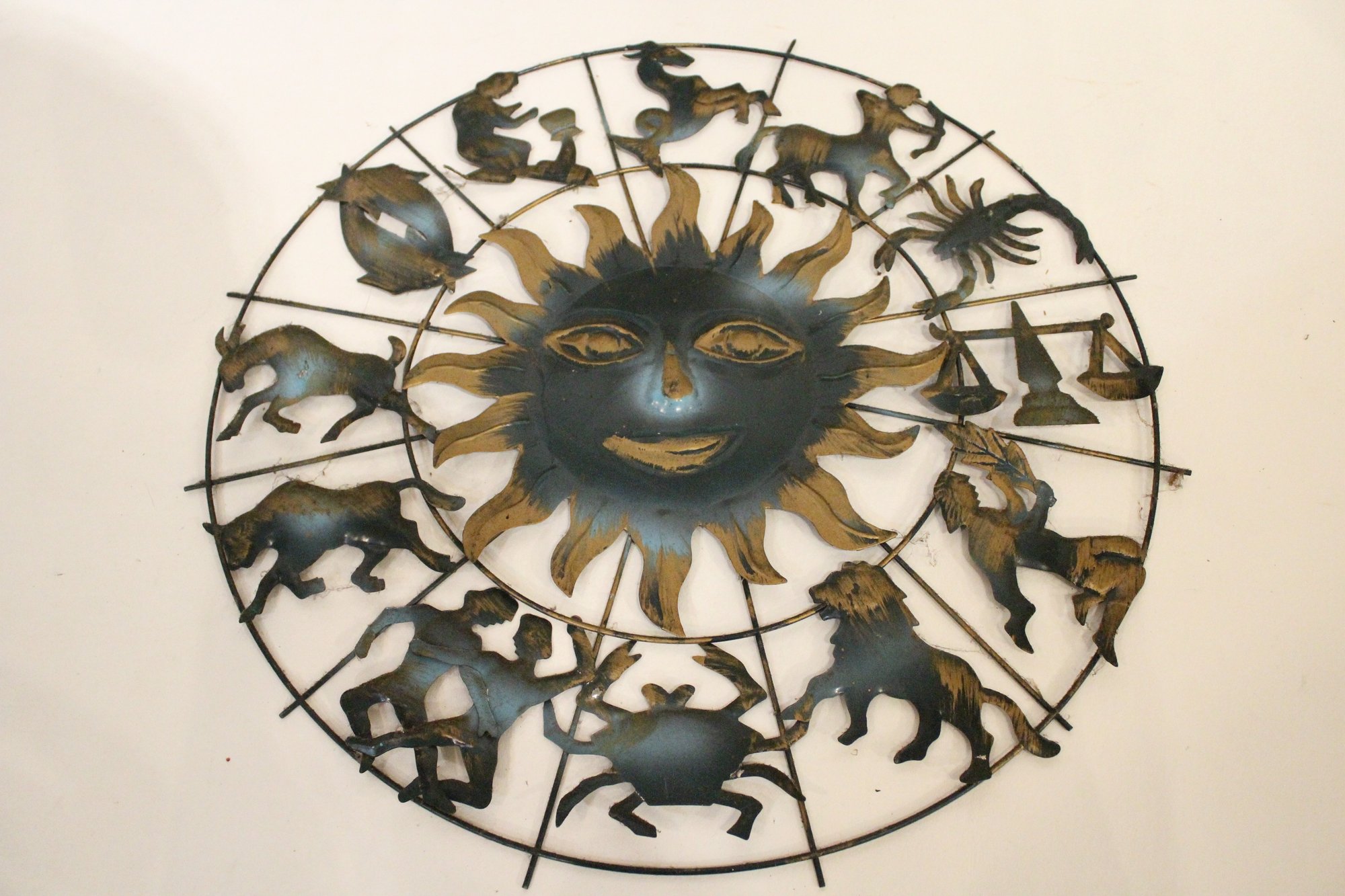 A framed print of 'A Girl with a Watering Can' by Pierre-Auguste Renoir, in an large gold toned ornate frame, 19" x 17", along with a metal sun and zodiac signs wall hanging, 19". These items can be shipped.