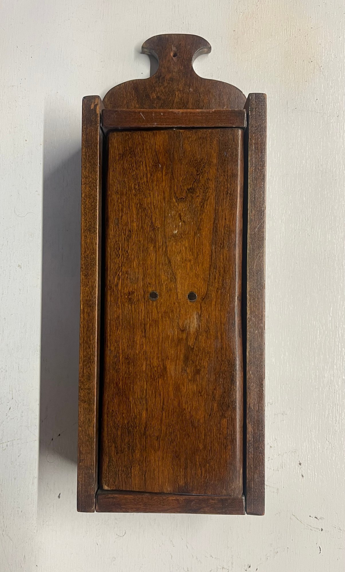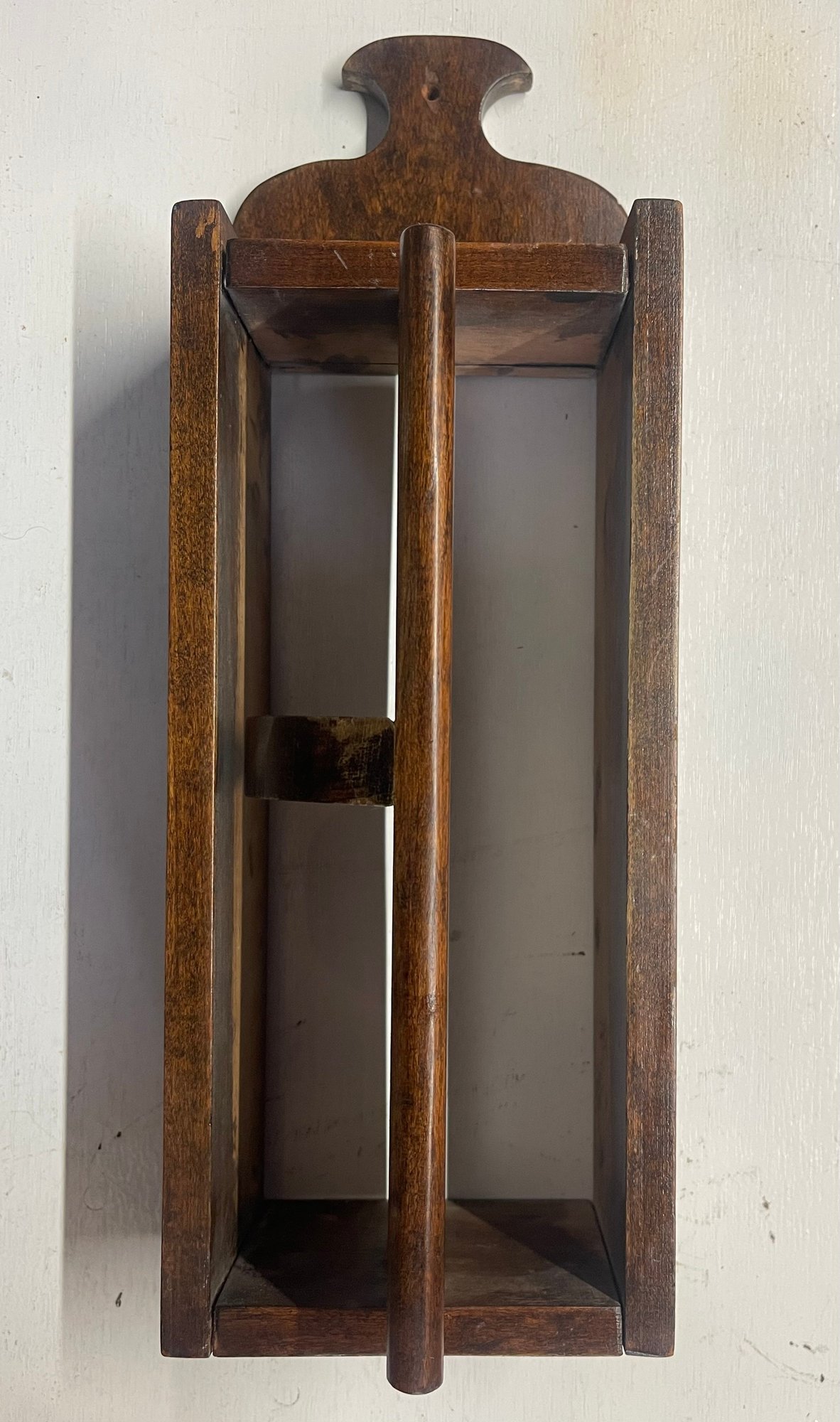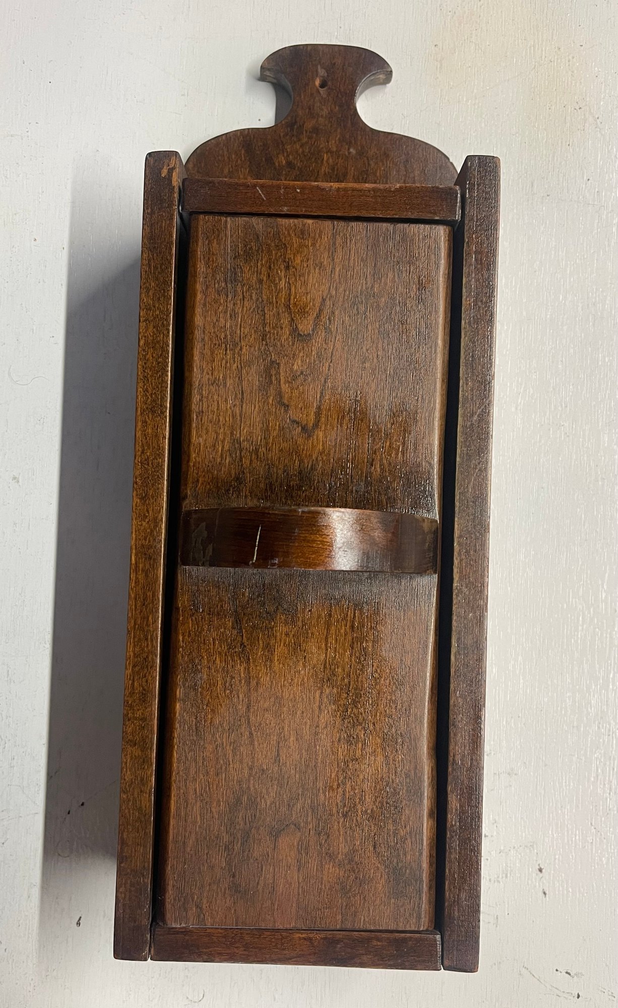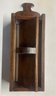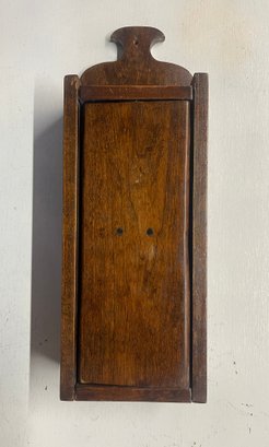 Primitive wall mounted knife holder with revolving door. 14 H x 5 W x 3 D. Sturdy and in good condition. This can be shipped.