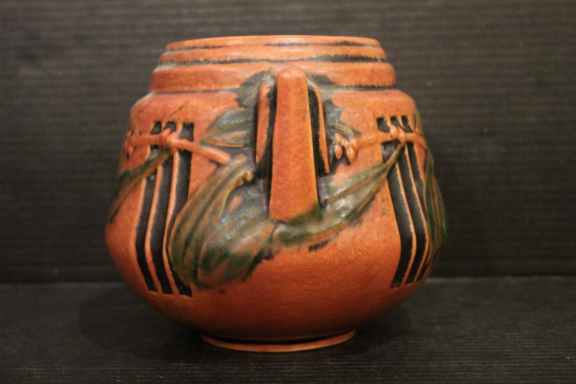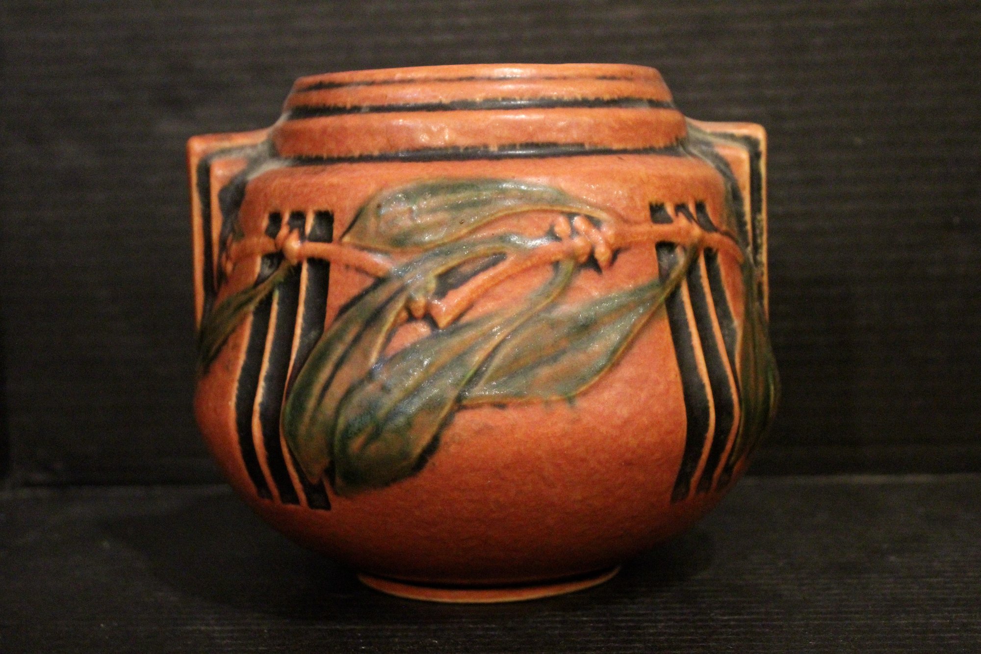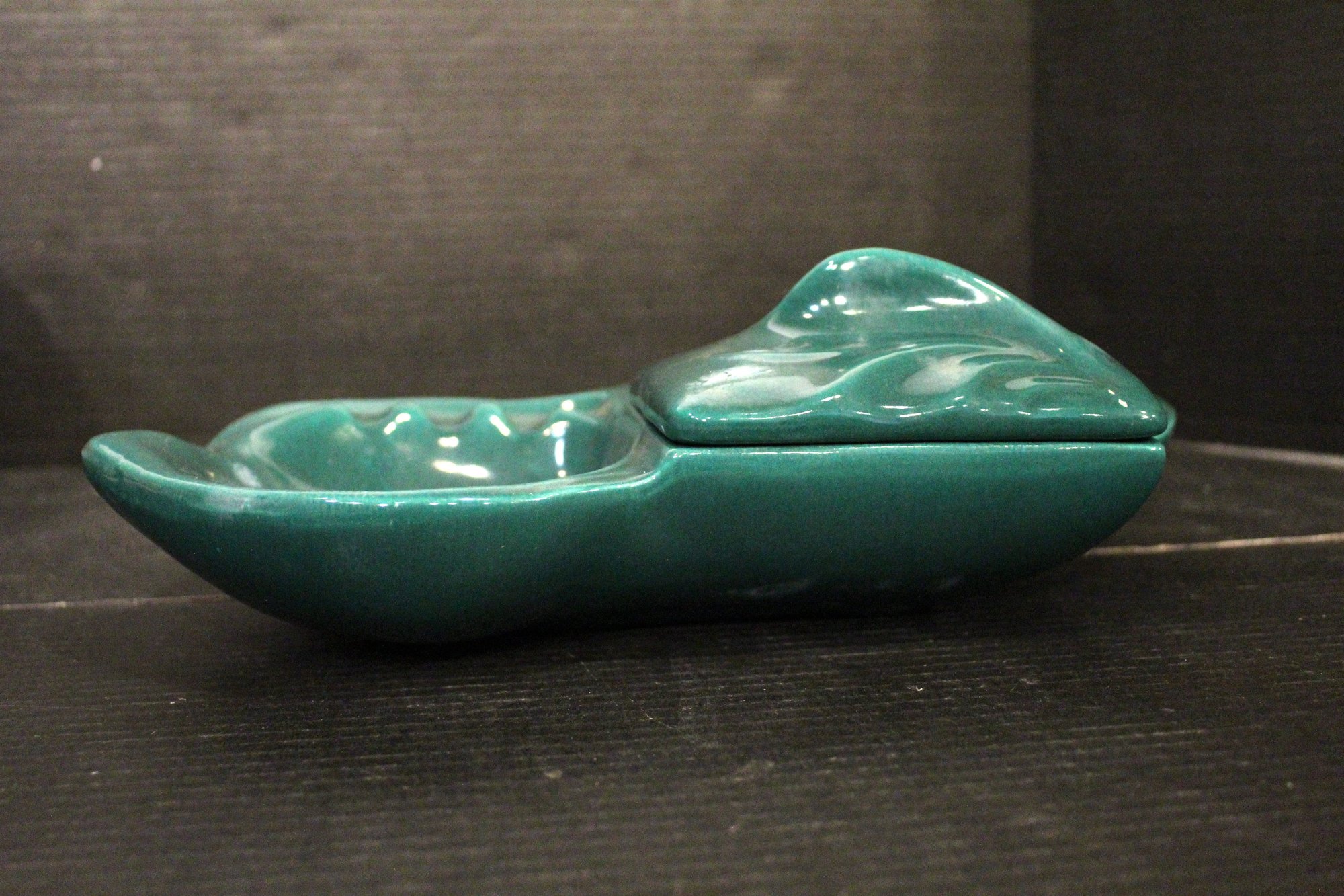 A vintage 1934 Roseville Pottery Art Deco "Laurel" pattern vase 9" tall and a vintage USA Gilner H461 ceramic ashtray with an attached lidded cigarette compartment 9" long. These items. can be shipped