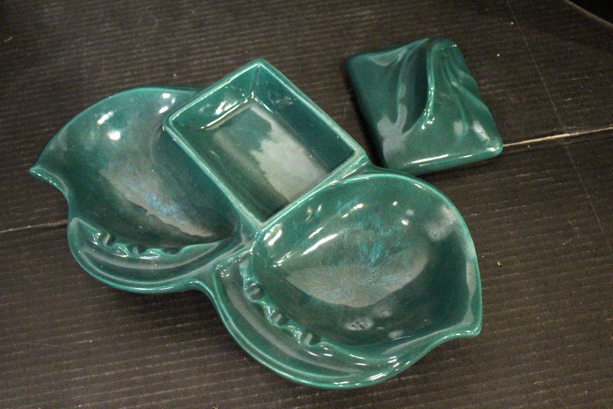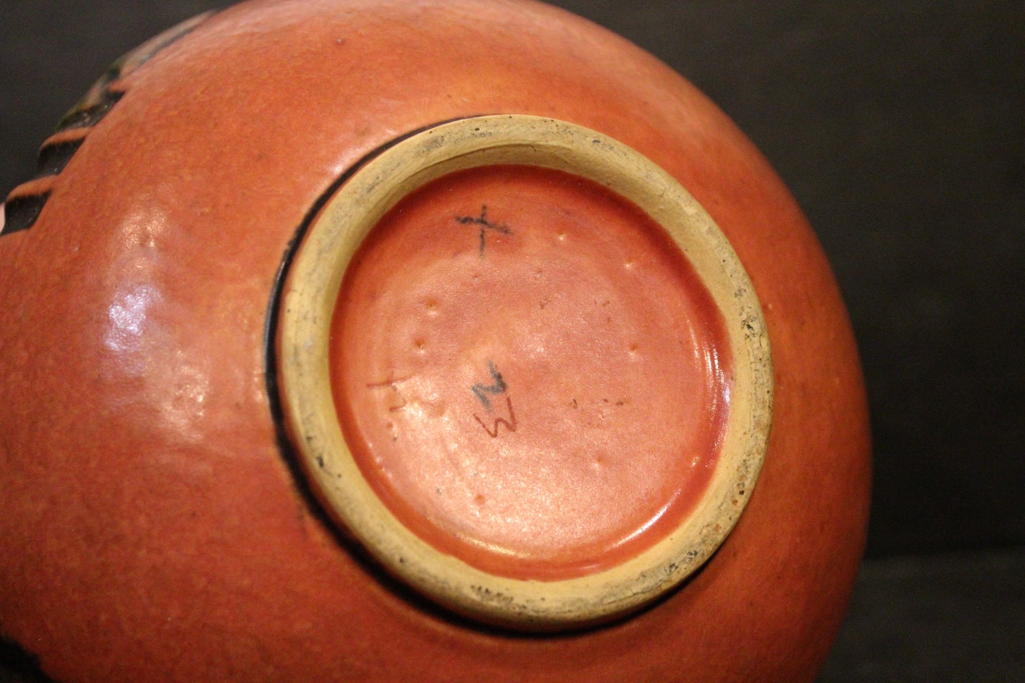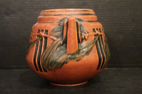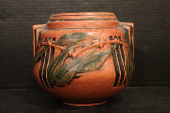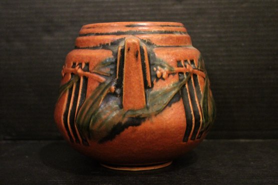 A vintage 1934 Roseville Pottery Art Deco "Laurel" pattern vase 9" tall and a vintage USA Gilner H461 ceramic ashtray with an attached lidded cigarette compartment 9" long. These items. can be shipped