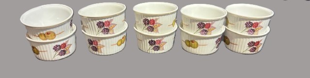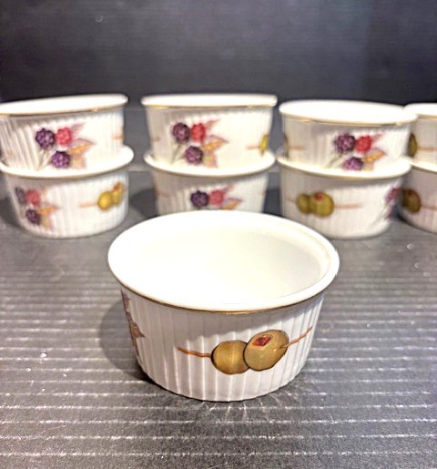 Royal Worcester Porcelain Evesham Gold ramekins x 10, each features a ribbed white porcelain body adorned with a fruit motif of blackberries, olives, finished with a gold trimmed edge.