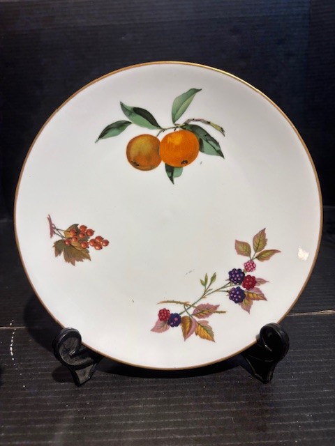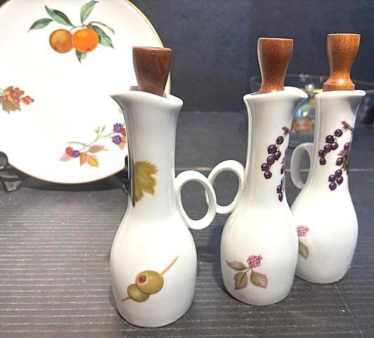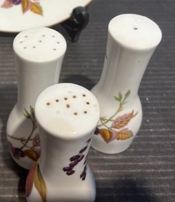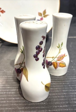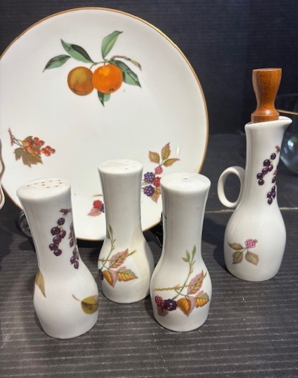 Royal Worcester Porcelain Evesham Pattern S&P, Vinegar & Oil set, Pepper grinder, Luncheon Plate and Shell Plate.