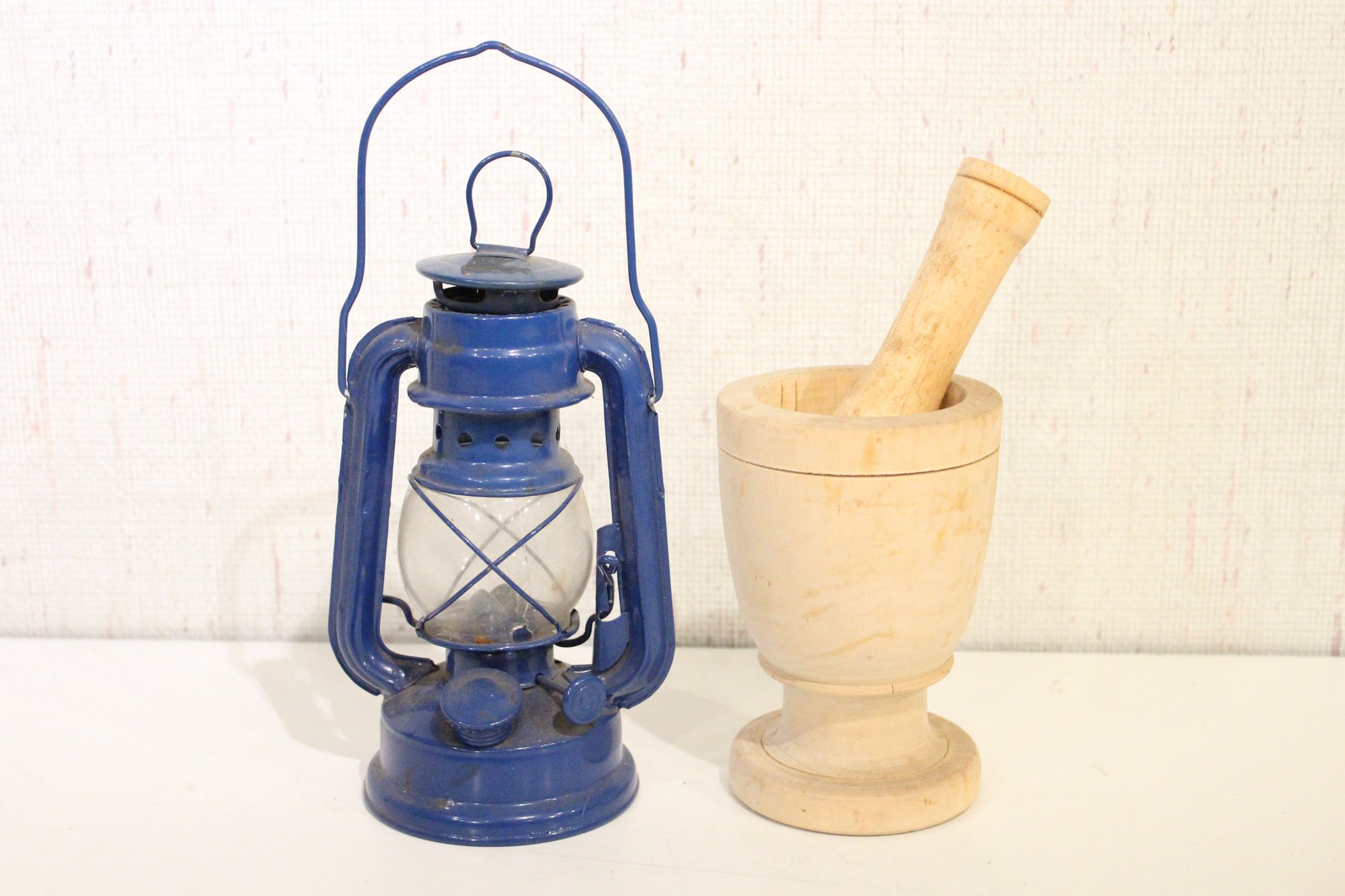 An antique style, blue hurricane-style kerosene lantern at 10" tall, with a wooden mortar and pestle at 6" tall. These items can be shipped.