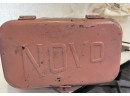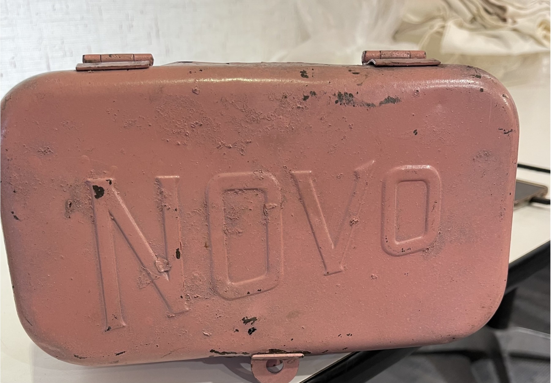 9 inches wide, 12+ inches tall metal canister with attached lid. Can be padlocked shut. The purpose of the canister is not clear. It has been spray painted an interesting shade of pink.