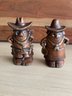 Western novelty ceramic shakers. Small imperfections. Looks to be a man and woman and stoppers are in tact . Estimated to be mid 60s. 4.5”h