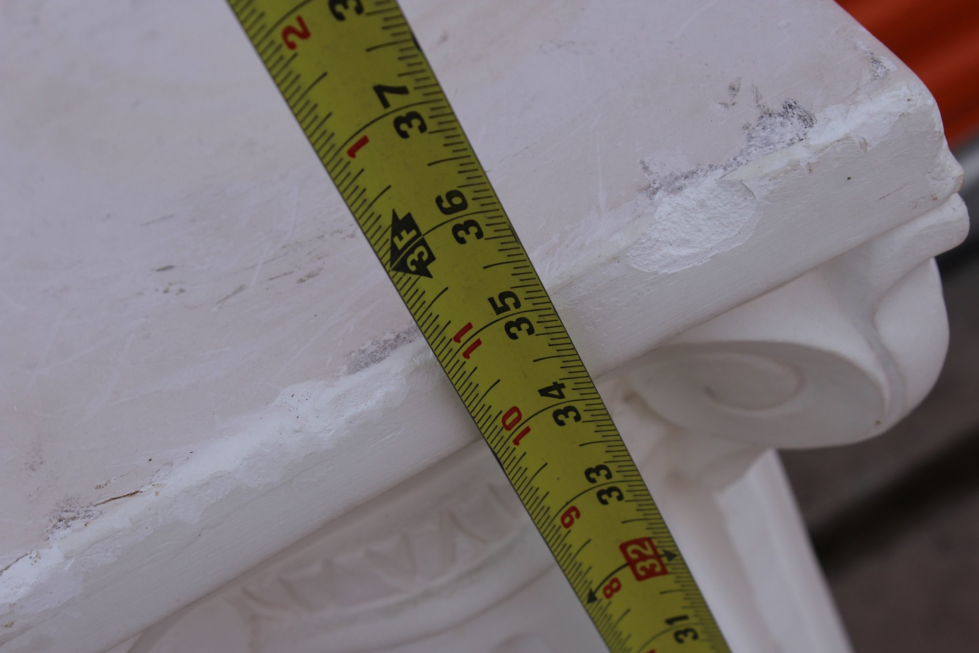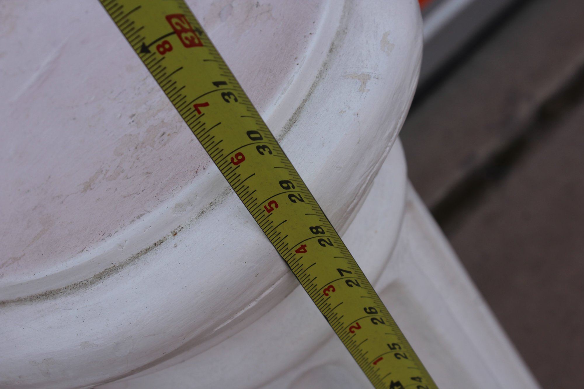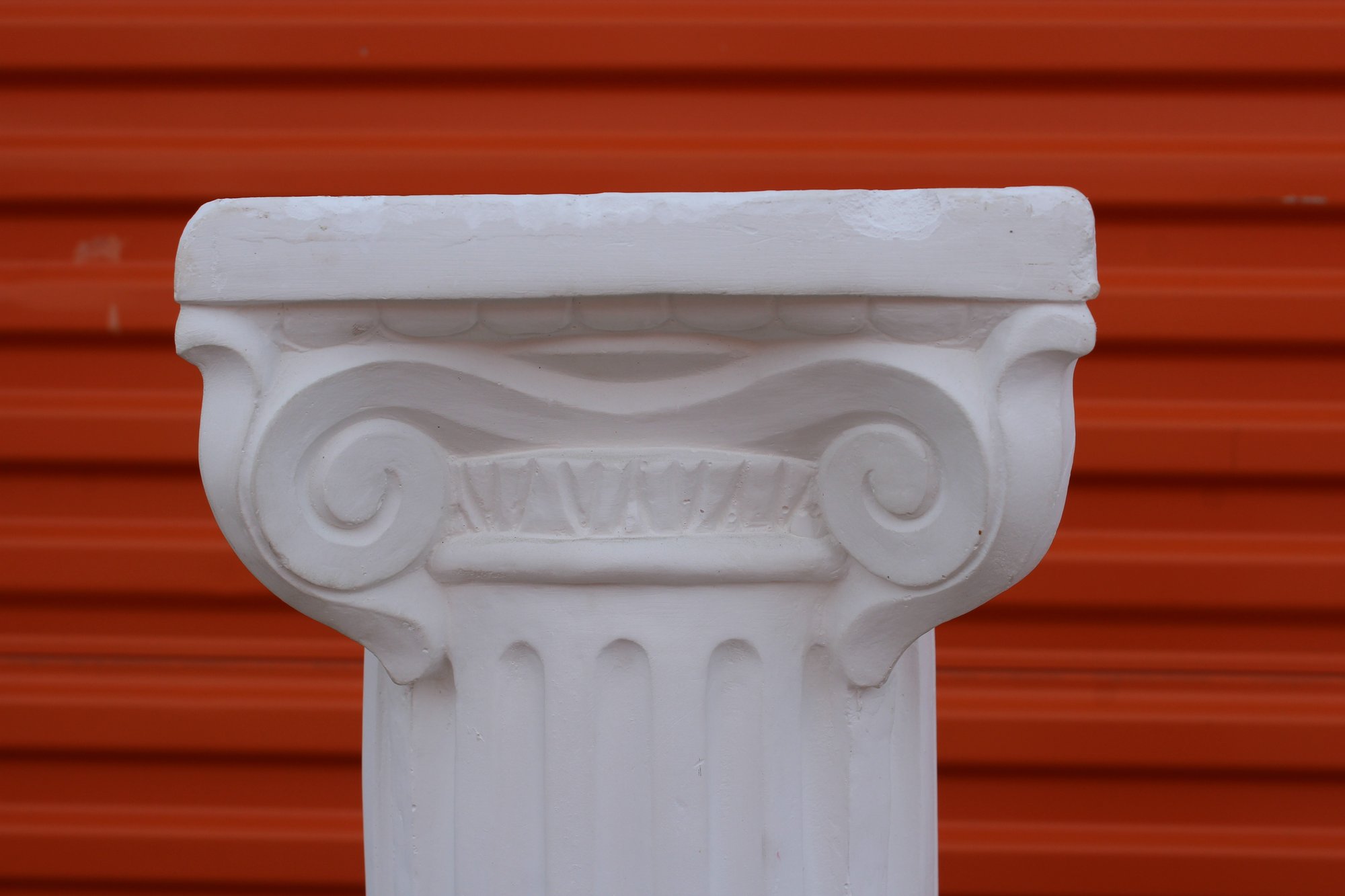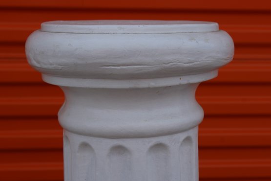 A second set of small white decorative Roman or Greek style column pedestals, 35" x 9.5" and 30" x 10.5". These items can not be shipped.