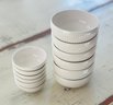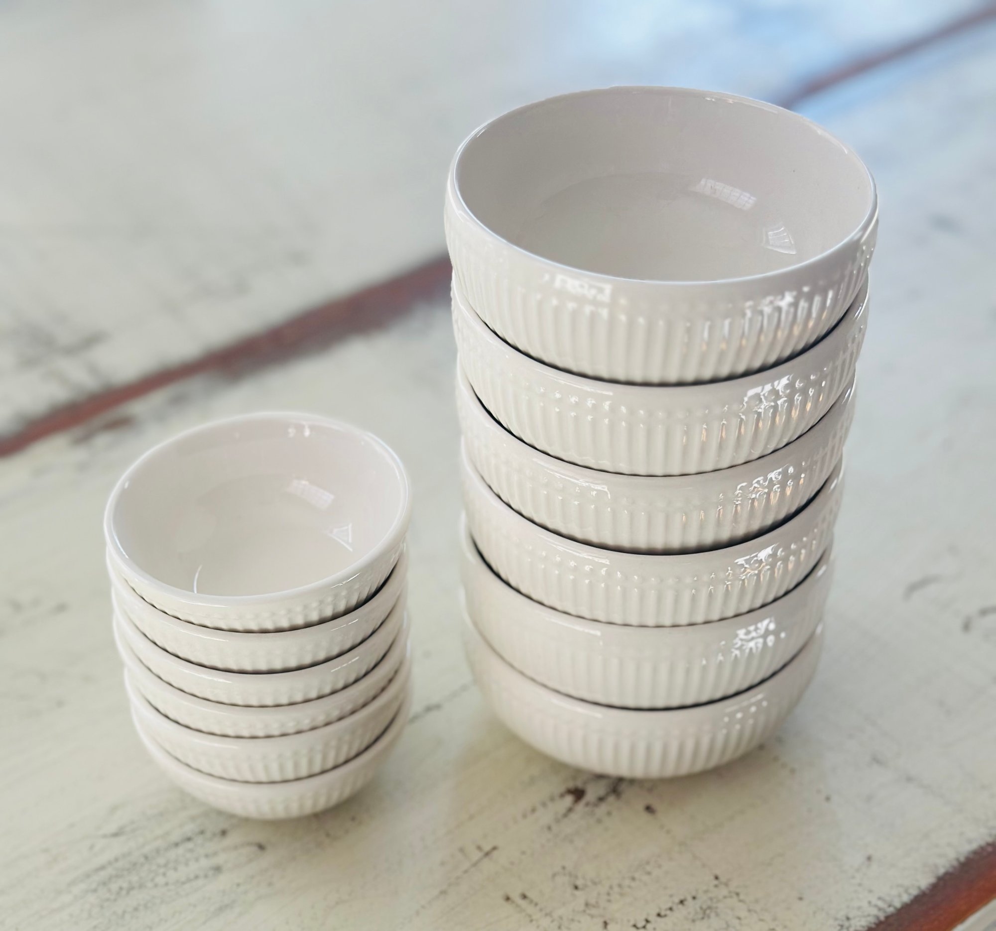 The smaller of the two bowls measure approximately 3” in length and “1 1/2” inches in depth.