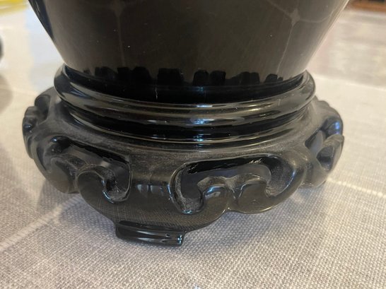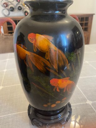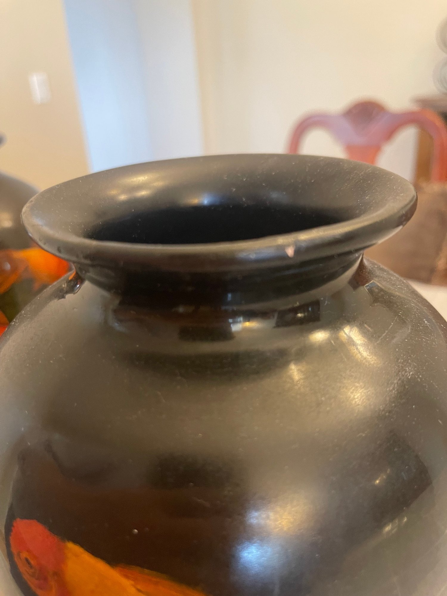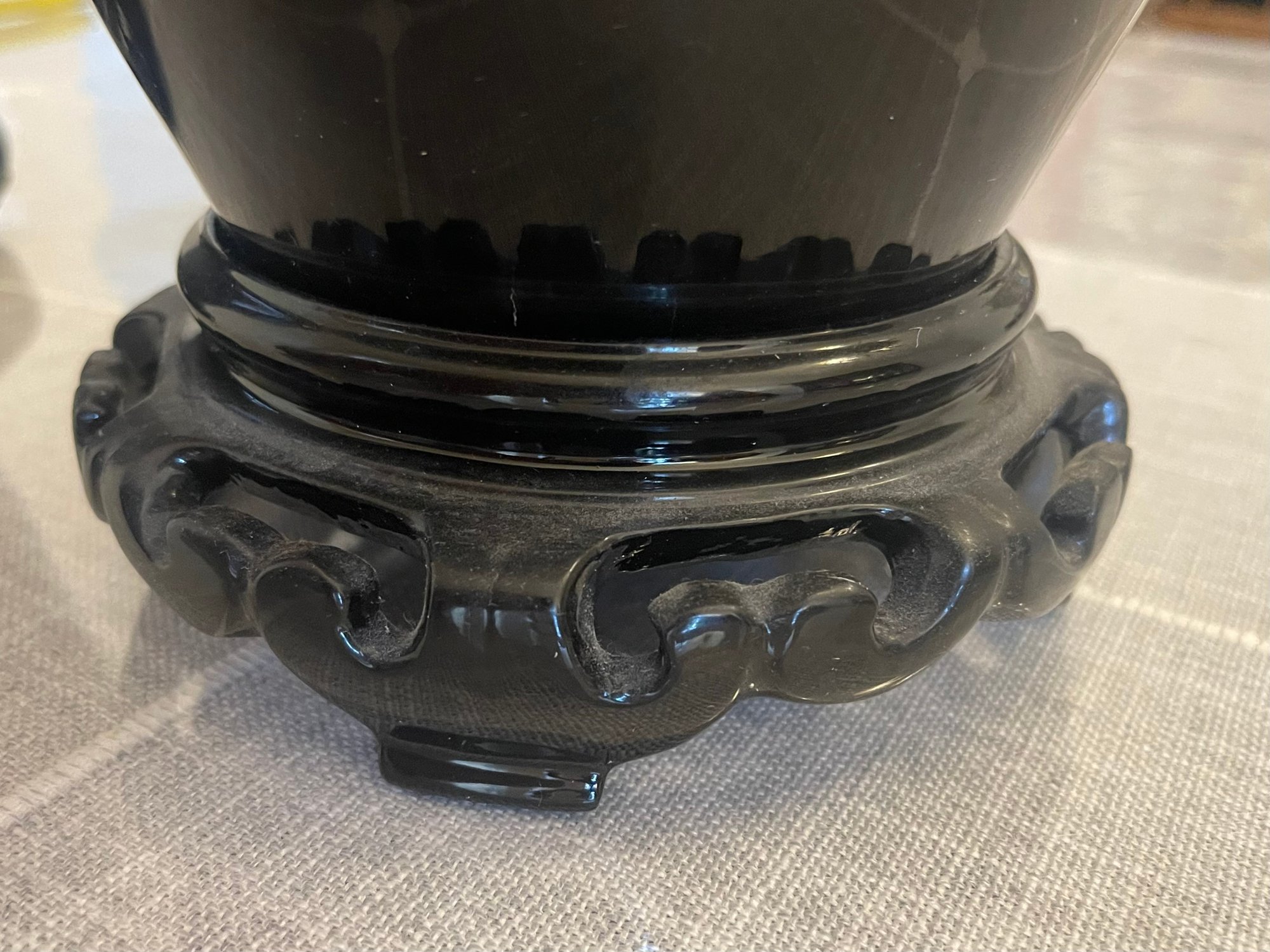 Lightweight laquerware vases with attached bases. One has been repaired at rim- see photo. 7.5 inches in diameter, 13.5 inches height. These can be shipped.