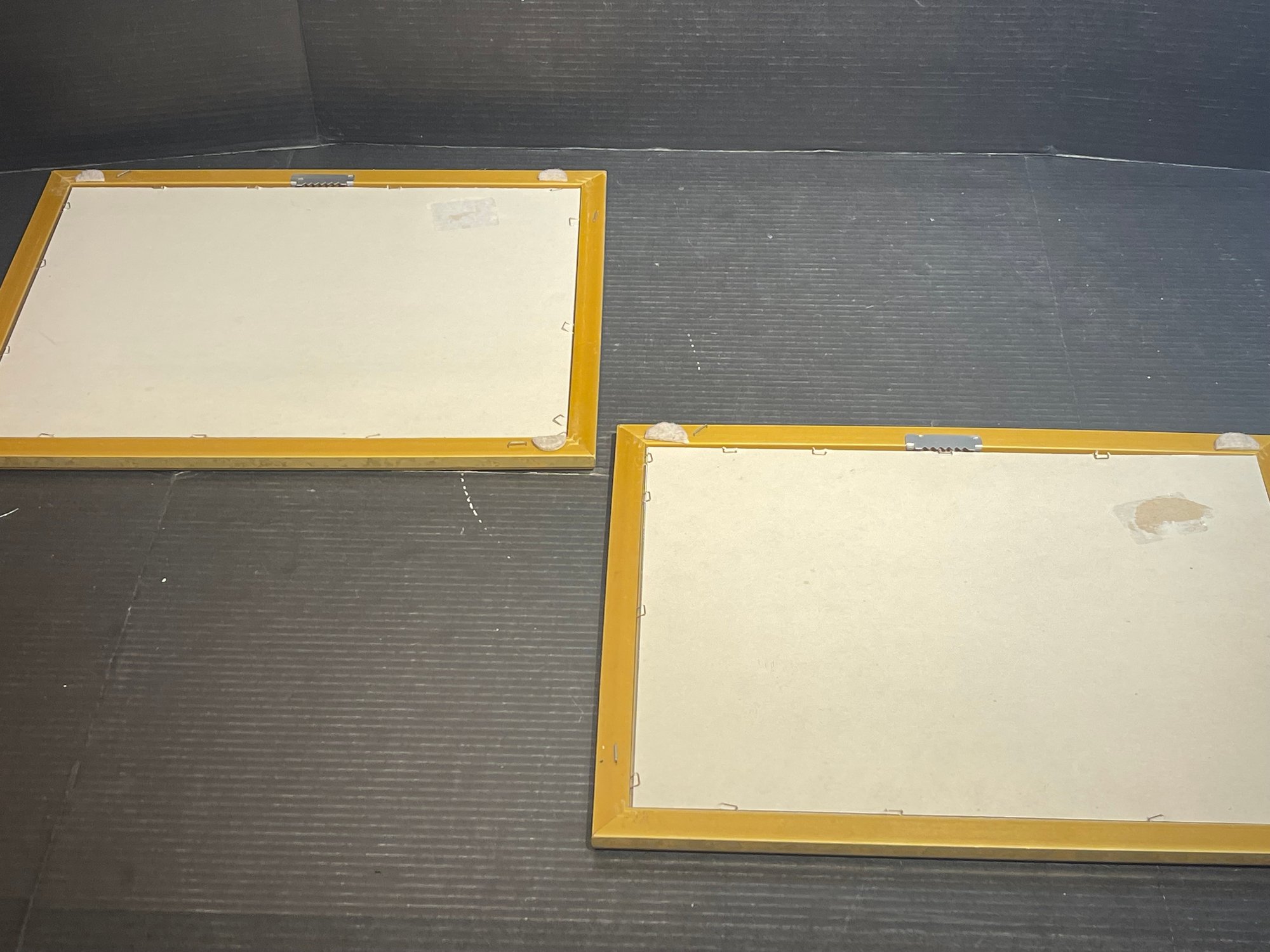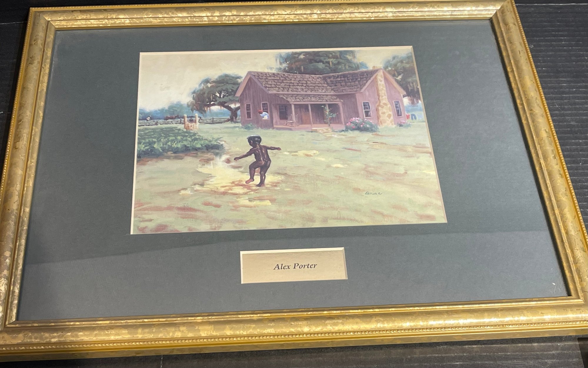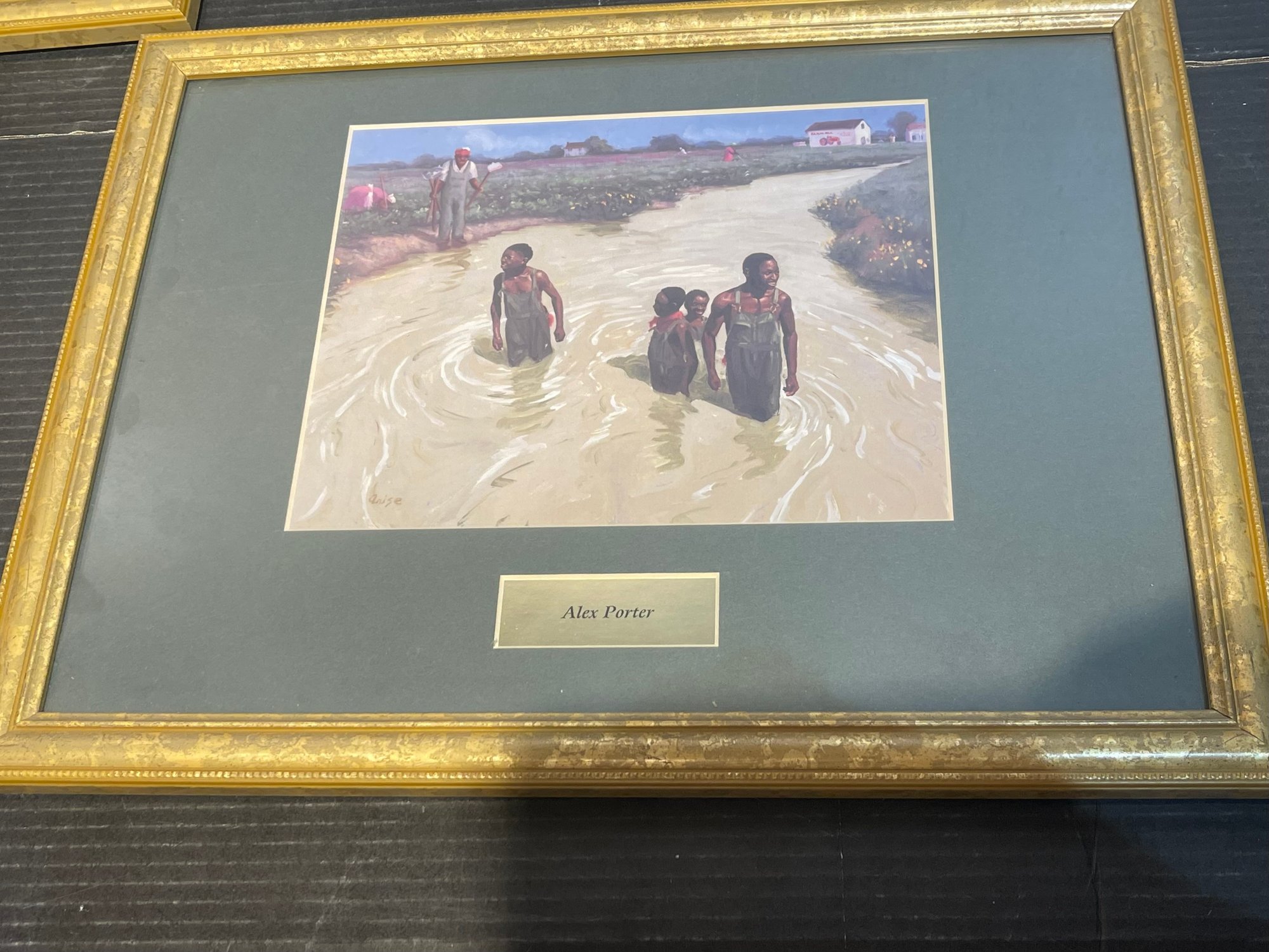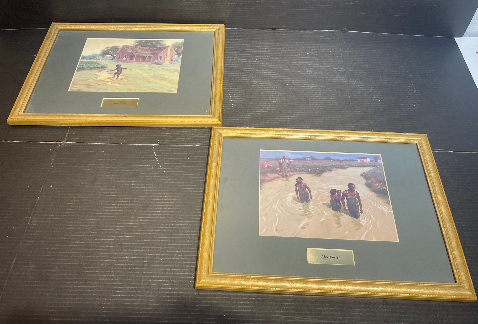 2 prints by artist Alex Porter depicting Black Americana scenes. Framed in gold tone resin frames with beveled mats and glass. Frames are 18 x 14