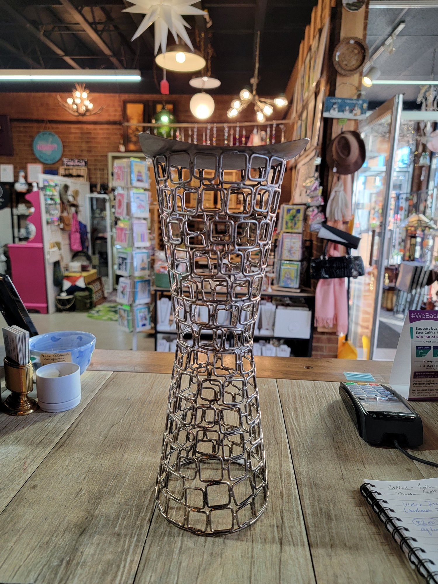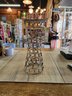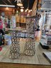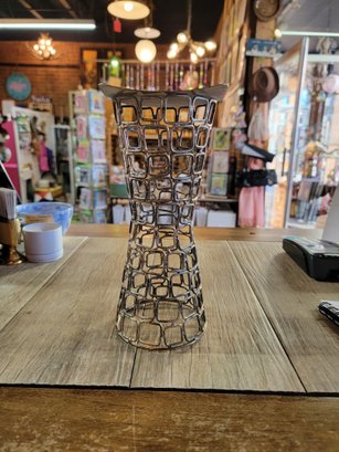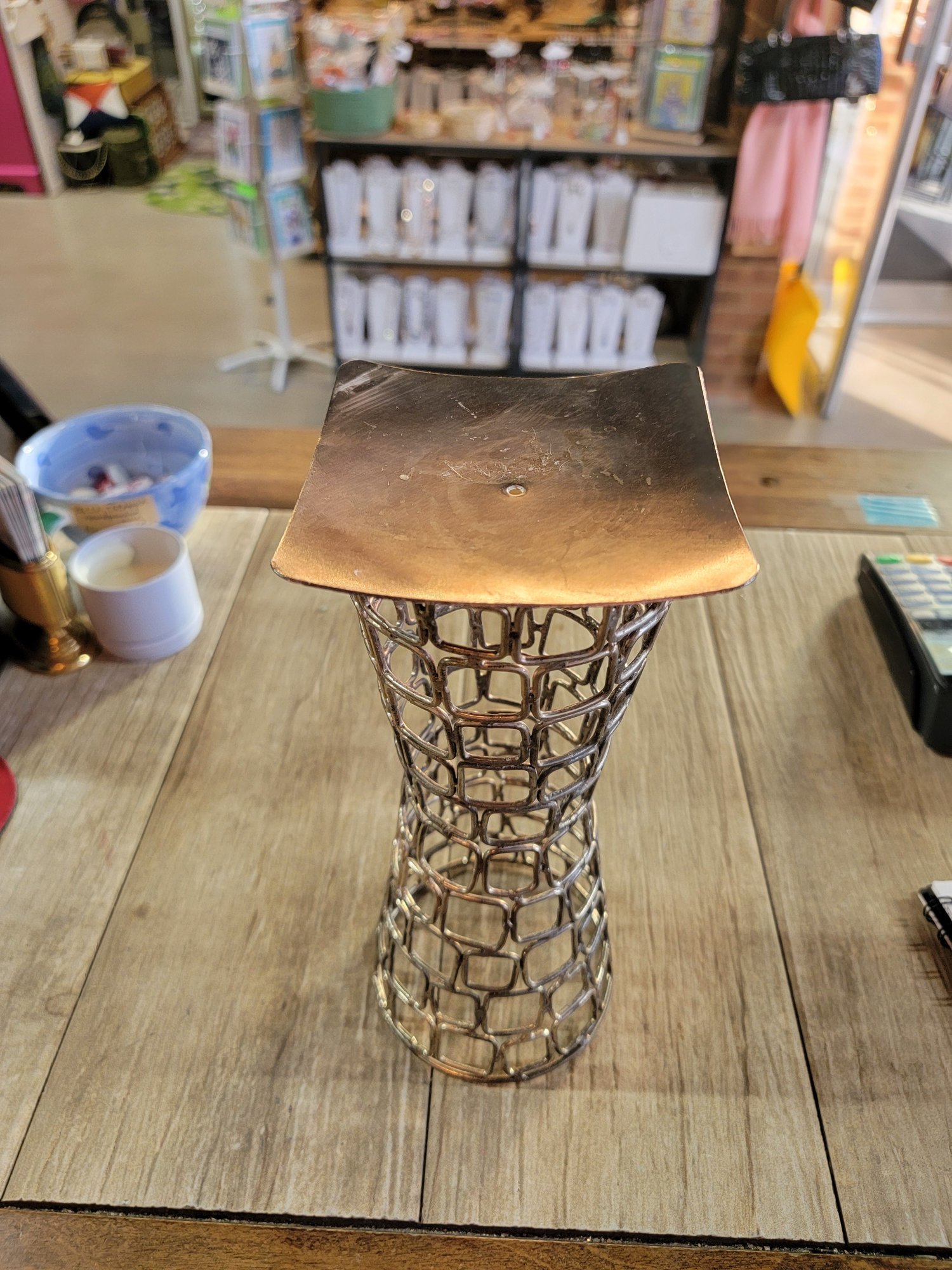 Two metal candle pedestals with a metal ringed geometric pattern. One is 15 inches tall, and the other is 10 inches tall, the platforms on top are both squares, six inches wide. Items in good used condition, possibly handmade. This item will ship.