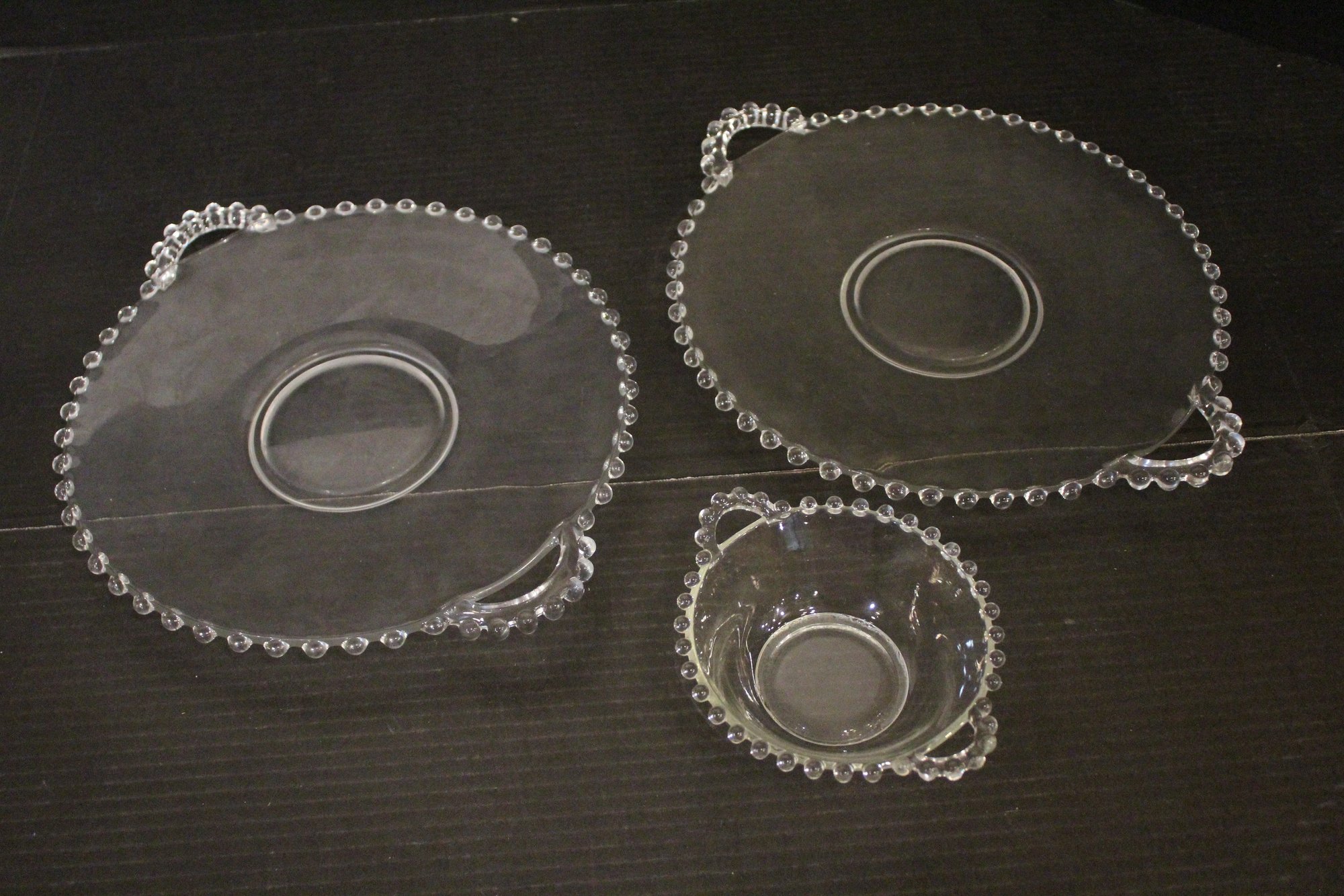 Set of 2 vintage Imperial Glass-Ohio Candlewick handled serving platters, 12", and 1 little serving bowl 4.5". These items can be shipped.