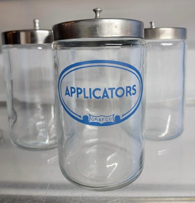 Grafco apothecary jars with metal kids , set of 3. 1 is labeled “applicators “ and the other 2 are not labeled. 7 inches tall, 4.5 inches wide.
