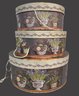 3 gorgeous floral decorated round hat boxes or storage boxes of varying sizes. These items can be shipped.