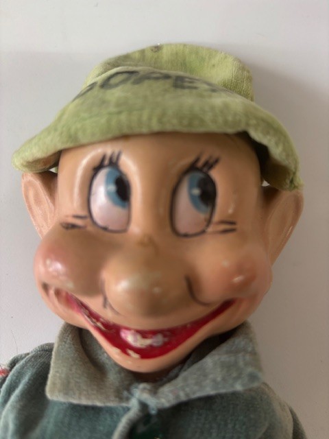 Seven Dwarf Dopey 1937-1938 rare Knickerbocker toy Company 10" high. Dressed in some of the original garments no pants, shoes in good condition, hat all in velvet like material some composition repair done on back legs. He is fragile but in pretty good shape considering his age.