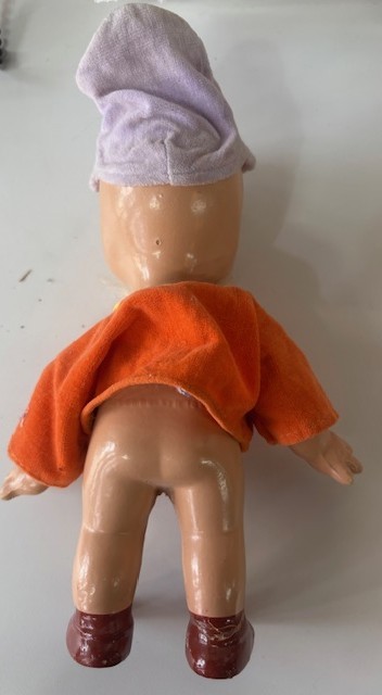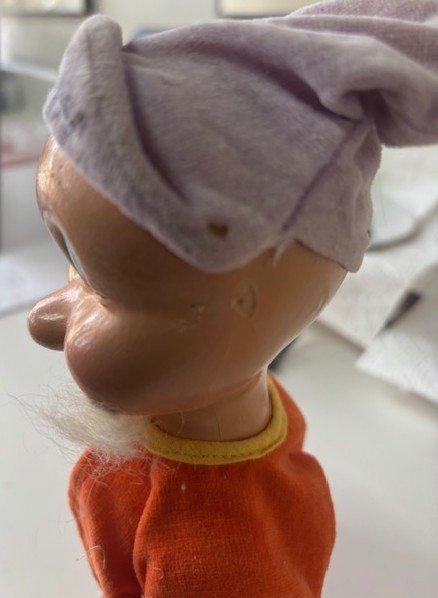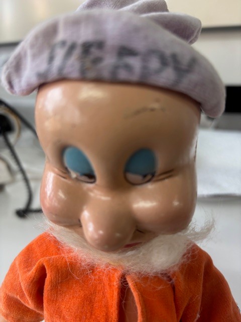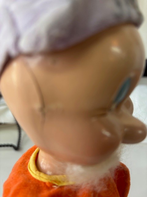 Seven Dwarf - Sleepy 1937-1938 from Walt Disney, Knickerbocker toy Company 10 Inch's tall. Sleepy is missing his pants, his shoes are in good shape and orange jacket original, no belt has his hat. Not in bad shape considering his age. This item will ship