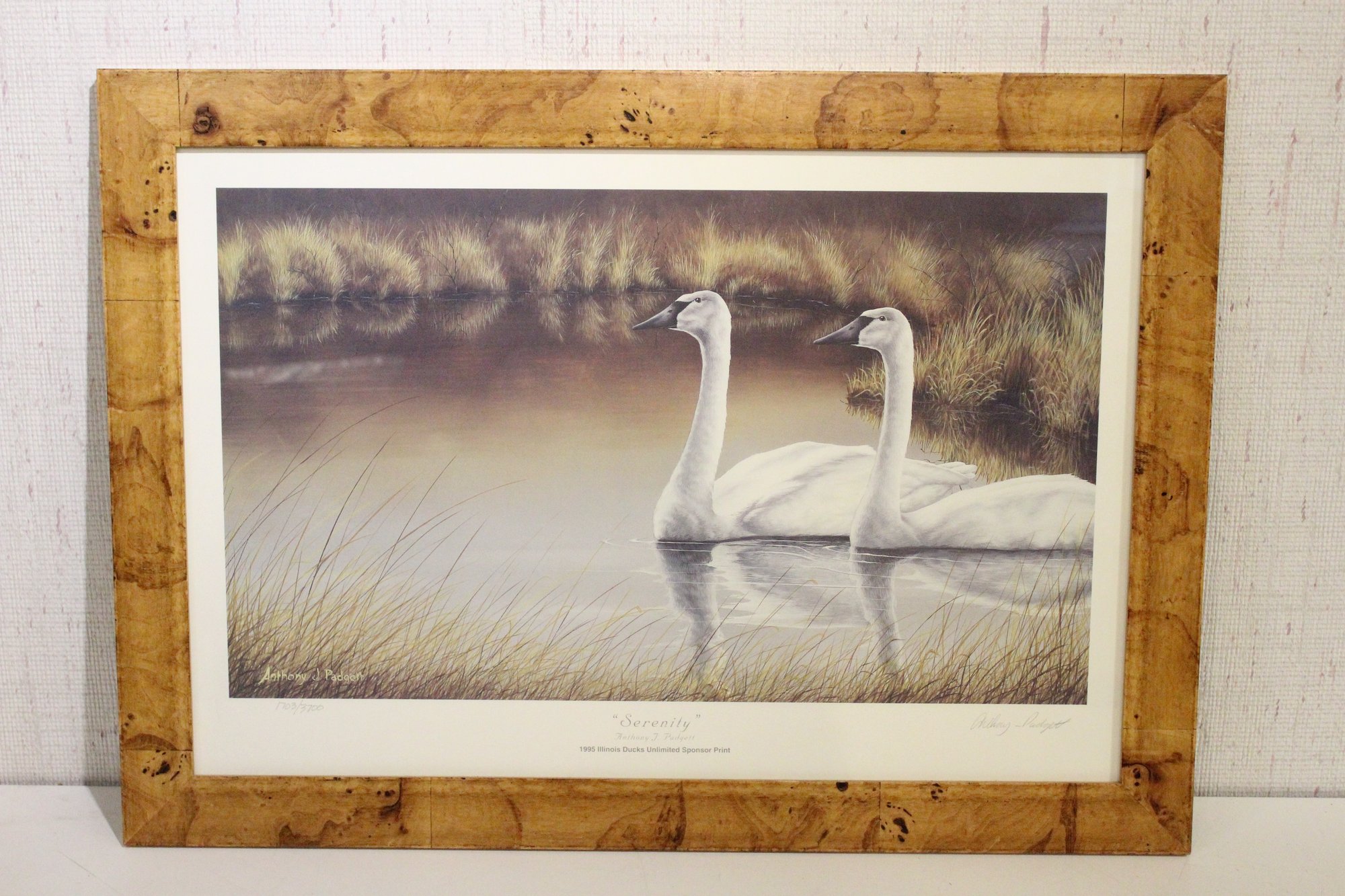 A vintage 1995 framed and signed art print titled "Serenity" by artist Anthony J. Padgett. It features two swans swimming in a pond with tall grass in the background. The frame is a thick wood frame at 1.75" and holds 21.5" x 14.5" images. This item can be shipped.