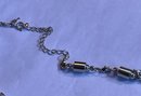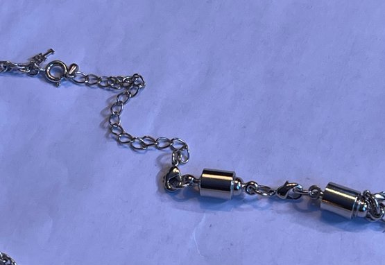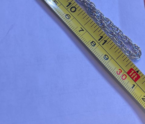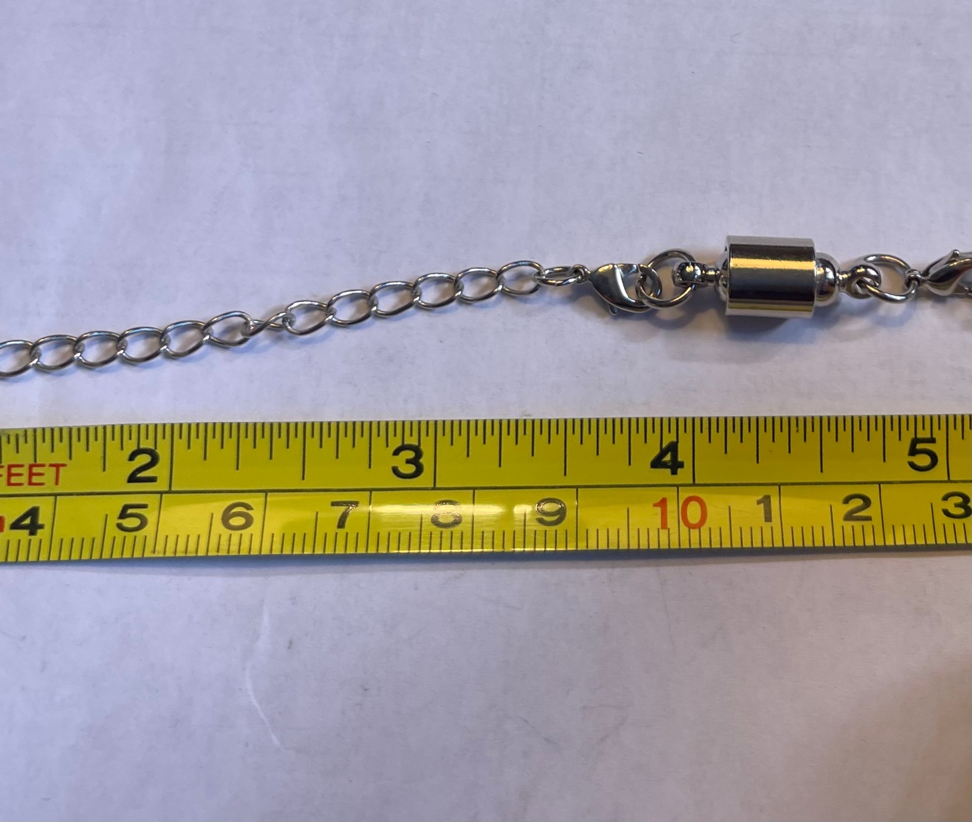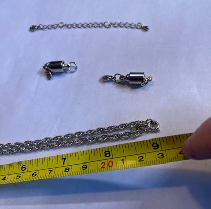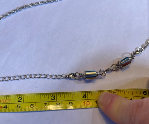 Silver tone chain, a18 inches long with an attachable 4 inch section and 2 magnet sections, 1 inch each. Maximum length is 24 inches.